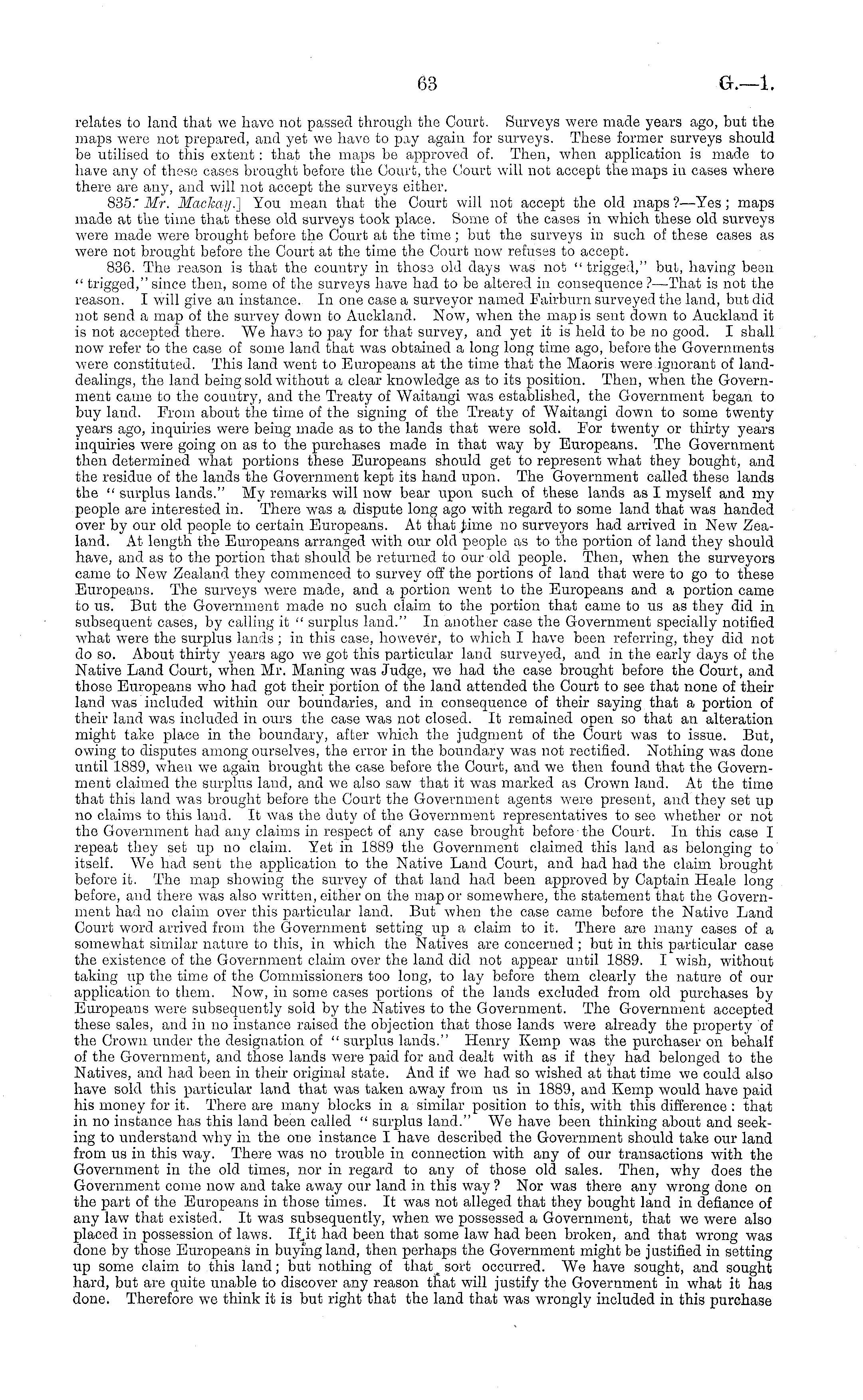 relates to land that we have not passed through the Court. Surveys were made years ago, but the maps were not prepared, and yet we have to pay again for surveys. These former surveys should be utilised to this extent : that the maps be approved of. Then, when application is made to have any of these cases brought before the Court, the Court will not accept the maps in cases where there are any, and will not accept the surveys either. 835.* Mr. Mackay.] You mean that the Court will not accept the old maps ?—Yes; maps made at the time that these old surveys took place. Some of the cases in wdiich these old surveys were made were brought before the Court at the time ; but the surveys in such of these cases as were not brought before the Court at the time the Court now refuses to accept. 836. The reason is that the country in those old days was not "trigged," but, having been " trigged," since then, some of the surveys have had to be altered in consequence ?—That is not the reason. I w 7ill give an instance. In one case a surveyor named Fairburn surveyed the land, but did not send a map of the survey down to Auckland. Now, when the map is sent down to Auckland it is not accepted there. We have to pay for that survey, and yet it is held to be no good. I shall now refer to the case of some land that was obtained a long long time ago, before the Governments were constituted. This land went to Europeans at the time that the Maoris were ignorant of landdealings, the land being sold without a clear knowledge as to its position. Then, when the Government came to the country, and the Treaty of Waitangi was established, the Government began to buy land. From about the time of the signing of the Treaty of Waitangi down to some twenty years ago, inquiries were being made as to the lands that were sold. For twenty or thirty years inquiries were going on as to the purchases made in that way by Europeans. The Government then determined what portions these Europeans should get to represent what they bought, and the residue of the lands the Government kept its hand upon. The Government called these lands the " surplus lands." My remarks will now bear upon such of these lands as I myself and my people are interested in. There was a dispute long ago with regard to some land that was handed over by our old people to certain Europeans. At that rime no surveyors had arrived in New Zealand. At length the Europeans arranged with our old people as to the portion of land they should have, and as to the portion that should be returned to our old people. Then, when the surveyors came to New Zealand they commenced to survey off the portions of land that were to go to these Europeans. The surveys were made, and a portion went to the Europeans and a portion came to us. But the Government made no such claim to the portion that came to us as they did in subsequent cases, by calling it " surplus land." In another case the Government specially notified what were the surplus lands ; in this case, however, to which I have been referring, they did not do so. About thirty years ago we got this particular land surveyed, and in the early days of the Native Land Court, when Mr. Mailing was Judge, we had the case brought before the Court, and those Europeans who had got their portion of the land attended the Court to see that none of thenland was included within our boundaries, and in consequence of their saying that a portion of their land was included in ours the case was not closed. It remained open so that an alteration might take place in the boundary, after which the judgment of the Court was to issue. But, owing to disputes among ourselves, the error in the boundary was not rectified. Nothing was done until 1889, when we again brought the case before the Court, and we then found that the Government claimed the surplus laud, and we also saw that it was marked as Crown laud. At the time that this land was brought before the Court the Government agents were present, and they set up no claims to this laud. It was the duty of the Government representatives to see whether or not the Government had any claims in respect of any case brought before the Court. In this case I repeat they set up no claim. Yet in 1889 the Government claimed this land as belonging to itself. We had sent the application to the Native Land Court, and had had the claim brought before it. The map showing the survey of that land had been approved by Captain Heale long before, and there w ras also written, either on the map or somewhere, the statement that the Government had no claim over this particular land. But when the case came before the Native Land Court word arrived from the Government setting up a claim to it. There are many cases of a somewhat similar nature to this, in which the Natives are concerned; but in this particular case the existence of the Government claim over the land did not appear until 1889. I wish, without taking up the time of the Commissioners too long, to lay before them clearly the nature of our application to■ them. Now, in some cases portions of the lands excluded from old purchases by Europeans were subsequently sold by the Natives to the Government. The Government accepted these sales, and in no instance raised the objection that those lands were already the property of the Crown under the designation of " surplus lands." Henry Kemp was the purchaser on behalf of the Government, and those lands were paid for and dealt with as if they had belonged to the Natives, and had been in their original state. And if we had so wished at that time we could also have sold this particular land that was taken away from us in 1889, and Kemp would have paid his money for it. There are many blocks in a similar position to this, with this difference : that in no instance has this land been called " surplus land." We have been thinking about and seeking to understand why in the one instance I have described the Government should take our lan