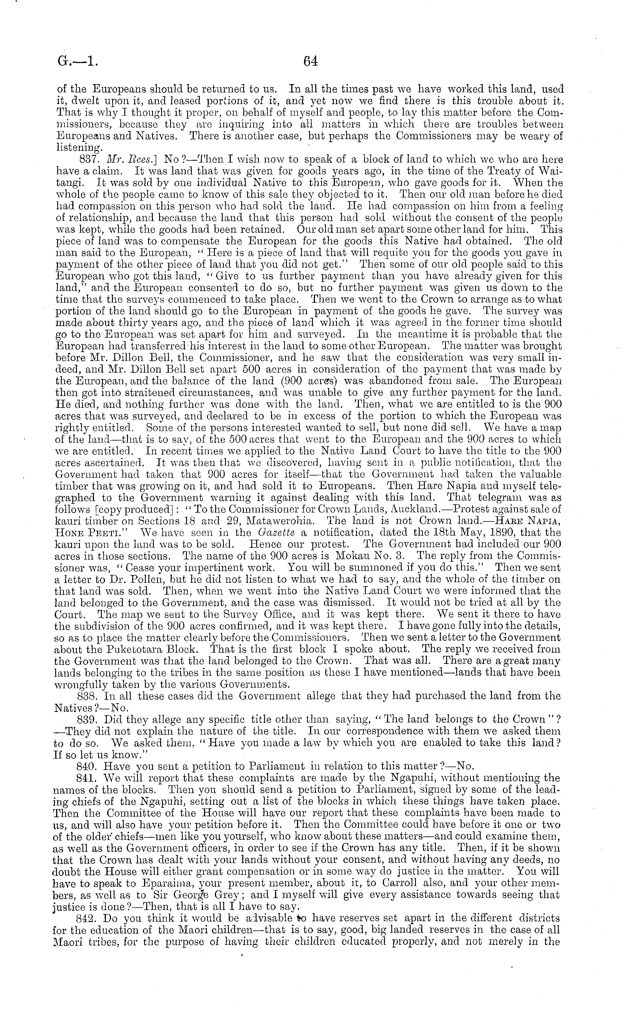 of the Europeans should be returned to us. In all the times past avo have worked this land, used it, dwelt upon it, and leased portions of it, and yet iioav Ave find there is this trouble about it. That is Avhy I thought it proper, on behalf of myself and people, to lay this matter before the Commissioners, because they are inquiring into all matters in AA'hich there are troubles between Europeans and Natives. There is another case, but perhaps the Commissioners may be weary of listening. 837. Mr. Bees.] No?—Then I wish iioav to speak of a block of land to which Ave aalio are here have a claim. It was land that was given for goods years ago, in the time of the Treaty of Waitangi. It was sold by one individual Native to this European, who gave goods for it. When the Avhole of the people came to knoAv of this sale they objected to it. Then our old man before he died had compassion on this person who had sold the laud. He had compassion on him from a feeling of relationship, and because the land that this person had sold without the consent of the people Avas kept, while the goods had been retained. Our old man set apart some other land for him. This piece of land was to compensate the European for the goods this Native had obtained. The old man said to the European, " Here is a piece of land that will requite you for the goods you gave in payment of the other piece of land that you did not get." Then some of our'old people said to this European who got this land, "Give to us further payment than you have already given for this land," and the European consented to do so, but no further payment was given us down to the time that the surveys commenced to take place. Then we went to the Crown to arrange as toAvhat portion of the land should go to the European in payment of the goods he gave. The survey was made about thirty years ago, and tho piece of land Avhich it was agreed in the former time should go to the European was set apart for him and surveyed. In the meantime it is probable that the European had transferred his interest in the land to some other European. The matter was brought before Mr. Dillon Bell, the Commissioner, and he saw that the consideration was very small indeed, and Mr. Dillon Bell set apart 500 acres in consideration of tho payment that was made by the European, and the balance of the land (900 acres) was abandoned from sale. The European then got into straitened circumstances, and was unable to give any further payment for the land. He died, and nothing further was done with the land. Then, what Ave are entitled to is the 900 acres that was surveyed, and declared to be in excess of the portion to which the European was rightly entitled. Some of the persons interested wanted to sell, but none did sell. We have a map of the land —that is to say, of the 500 acres that went to the European and the 900 acres to Avhich AA'e are entitled. In recent times we applied to the Native Land Court to have the title to the 900 acres ascertained. It Avas then that wo discovered, having sent in a public notification, that the Government had taken that 900 acres for itself—that tho Government had taken the valuable timber that was growing on it, and had sold it to Europeans. Then Hare Napia and myself telegraphed to the Government warning it against dealing with this land. That telegram was as follows [copy produced]: "To the Commissioner for Crown Lands, Auckland.—Protest against sale of kauri timber on Sections 18 and 29, Matawerohia. The land is not Crown laud.—Hare Napia, Hone Peeti." We have, seen in tho Gazette a notification, dated the 18th May, 1890, that the kauri upon the land was to be sold. Hence our protest. Tho Government had included our 900 acres in those sections. The name of the 900 acres is Mokau No. 3. The reply from the Commissioner Avas, " Cease your impertinent work. You aaIII be summoned if you do this." Then Ave sent a letter to Dr. Pollen, but he did not listen to what we had to say, and the whole of the timber on that land was sold. Then, Avhen Ave went into the Native Land Court avo were informed that the land belonged to the Government, and the case Avas dismissed. It Avould not be tried at all by tho Court. The map we sent to the Survey Office, and it was kept there. We sent it there to have the subdivision of the 900 acres confirmed, and it was kept there. I have gone fully into the details, so as to place the matter clearly before the Commissioners. Then Ave sent a letter to the Government about the Puketotara Block. That is the first block I spoke about. Tho reply wo received from the Government Avas that the land belonged to the Crown. That was all. There are a great many lands belonging to the tribes in the same position as these I have mentioned—lands that have been wrongfully taken by the various Governments. 838. In all these cases did the Government allege that they had purchased the land from the Natives?—No. 839. Did they allege any specific title other than saying, " The land belongs to the Crown " ? —They did not explain the nature of the title. In our correspondence with them Ave asked them to do so. We asked them, " Have you made a IaAV by AA'hich you are enabled to take this land? If so let us know." 840. Have you sent a petition to Parliament in relation to this matter ?—No. 841. We will report that these complaints are made by the Ngapuhi, without mentioning the names of the blocks. Then you should send a petition to Parliament, signed by some of the leading chiefs of the Ngapuhi, setting out a list of the blocks in which these things have taken place. Then the Committee of the House will have our report that these complaints have been made to us, and will also have your petition before it. Then the Committee could have before it one or two of the older chiefs —men like you yourself, aalio know about these matters —and could examine them, as well as the Government officers, in order to see if the Crown has any title