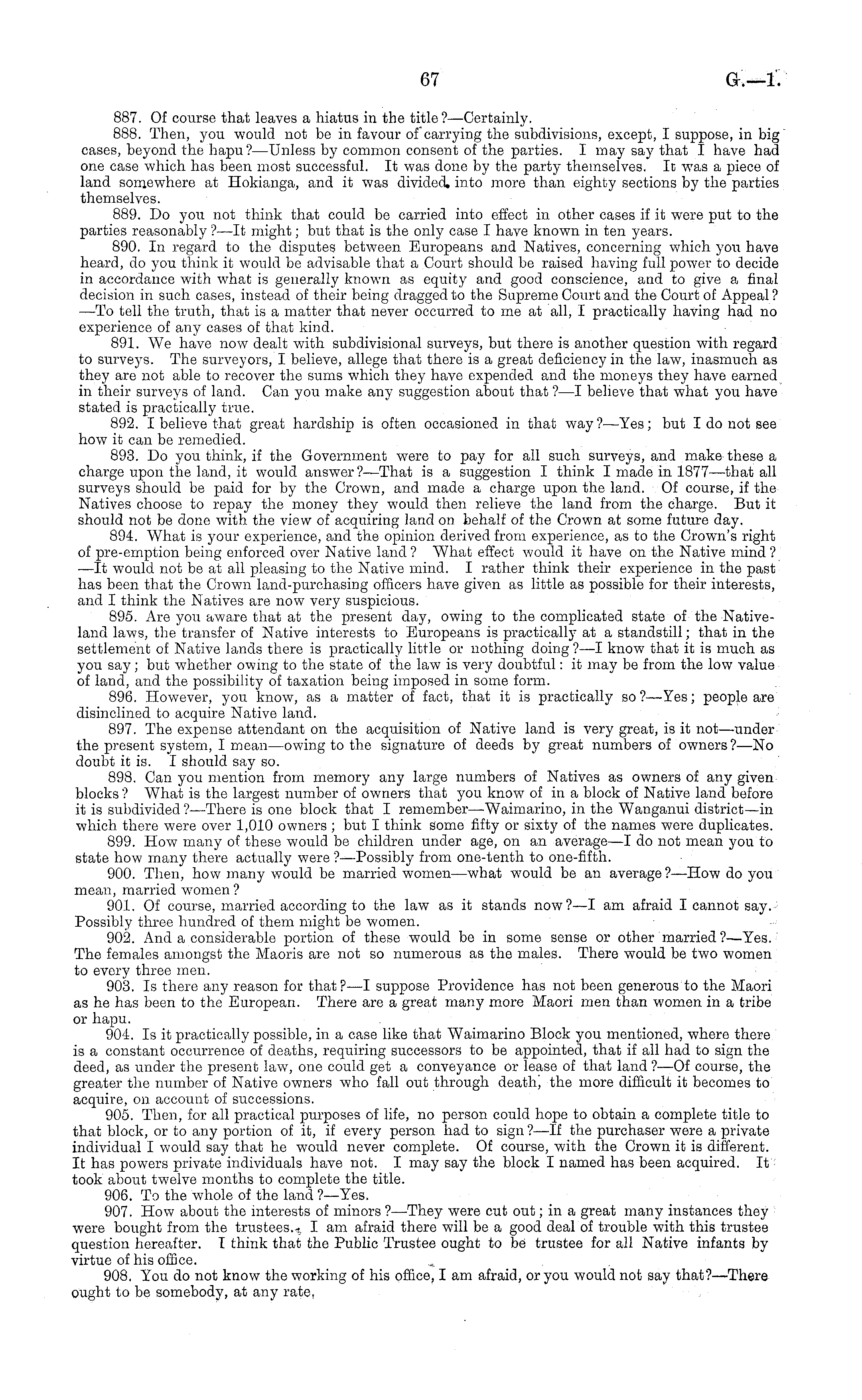 887. Of course that leaves a hiatus in the title ?—Certainly. 888. Then, you would not be in favour of carrying the subdivisions, except, I suppose, in big cases, beyond the hapu ? —Unless by common consent of the parties. I may say that I have had one case which has been most successful. It was done by the party themselves. It was a piece of land somewhere at Hokianga, and it was divided, into more than eighty sections by the parties themselves. 889. Do you not think that could be carried into effect in other cases if it were put to the parties reasonably ?—lt might; but that is the only case I have known in ten years. 890. In regard to the disputes betAveen Europeans and Natives, concerning which you have heard, do you think it would be advisable that a Court should be raised having full poAver to decide in accordance with what is generally known as equity and good conscience, and to give a final decision in such cases, instead of their being dragged to the Supreme Court and the Court of Appeal ? —To tell the truth, that is a matter that never occurred to me at all, I practically having had no experience of any cases of that kind. 891. We have now dealt Avith subdivisional surveys, but there is another question with regard to surveys. The surveyors, I believe, allege that there is a great deficiency in the law, inasmuch as they are not able to recover the sums which they have expended and the moneys they have earned in their surveys of land. Can you make any suggestion about that ?—I believe that what you have stated is practically true. 892. I believe that great hardship is often occasioned in that Avay? —Yes; but I do not see how it can be remedied. 893. Do you think, if the Government were to pay for all such surveys, and make these a charge upon the land, it would answer?—That is a suggestion I think I made in 1877—that all surveys should be paid for by the Crown, and made a charge upon the land. Of course, if the Natives choose to repay the money they would then relieve the land from the charge. But it should not be done with the view of acquiring land on behalf of the Crown at some future day. 894. What is your experience, and the opinion derived from experience, as to the Crown's right of pre-emption being enforced over Native land ? What effect Avould it have on the Native mind ? —It would not be at all pleasing to the Native mind. I rather think their experience in the past has been that the Crown land-purchasing officers have given as little as possible for their interests, and I think the Natives are now very suspicious. 895. Are you aware that at the present day, owing to the complicated state of the Nativeland laws, the transfer of Native interests to Europeans is practically at a standstill; that in the settlement of Native lands there is practically little or nothing doing ? —I know that it is much as you say; but whether owing to the state of the law is very doubtful: it may be from the loav value of land, and the possibility of taxation being imposed in some form. 896. However, you know, as a matter of fact, that it is practically so?—Yes; people are disinclined to acquire Native land. 897. The expense attendant on the acquisition of Native land is very great, is it not—under the present system, I mean—OAA'ing to the signature of deeds by great numbers of owners ?—No doubt it is. I should say so. 898. Can you mention from memory any large numbers of Natives as owners of any given blocks ? What is the largest number of owners that you knoAv of in a block of Native land before it is subdivided ?—There is one block that I remember—Waimarino, in the Wanganui district—in which there were over 1,010 owners ; but I think some fifty or sixty of the names were duplicates. 899. Hoav many of these would be children under age, on an average—l do not mean you to state how many there actually Avere ? —Possibly from one-tenth to one-fifth. 900. Then, how many would be married women —what would be an average ?—How do you mean, married women ? 901. Of course, married according to the law as it stands noAV?—I am afraid I cannot say. Possibly three hundred of them might be women. 902. And a considerable portion of these would be in some sense or other married ?—Yes. The females amongst the Maoris are not so numerous as the males. There would be two women to every three men. 903. Is there any reason for that ? —I suppose Providence has not been generous to the Maori as he has been to the European. There are a great many more Maori men than women in a tribe or hapu. 904. Is it practically possible, in a case like that Waimarino Block you mentioned, where there is a constant occurrence of deaths, requiring successors to be appointed, that if all had to sign the deed, as under the present law, one could get a conveyance or lease of that land ? —Of course, the greater the number of Native OAvners who fall out through death, the more difficult it becomes to acquire, on account of successions. 905. Then, for all practical purposes of life, no person could hope to obtain a complete title to that block, or to any portion of it, if every person had to sign ?—lf the purchaser were a private individual I would say that he would never complete. Of course, with the Crown it is different. It has powers private individuals have not. I may say the block I named has been acquired. It took about twelve months to complete the title. 906. To the whole of the land ?—Yes. 907. Hoav about the interests of minors ?—They were cut out; in a great many instances they were bought from the trustees.- I am afraid there will be a good deal of trouble with this trustee question hereafter. I think that the Public Trustee ought to be trustee for all Native infants by virtue of his office. 908. You do not know the working of his office, I am afraid, or you would not say that?—There ought to be somebody, at any rate,
