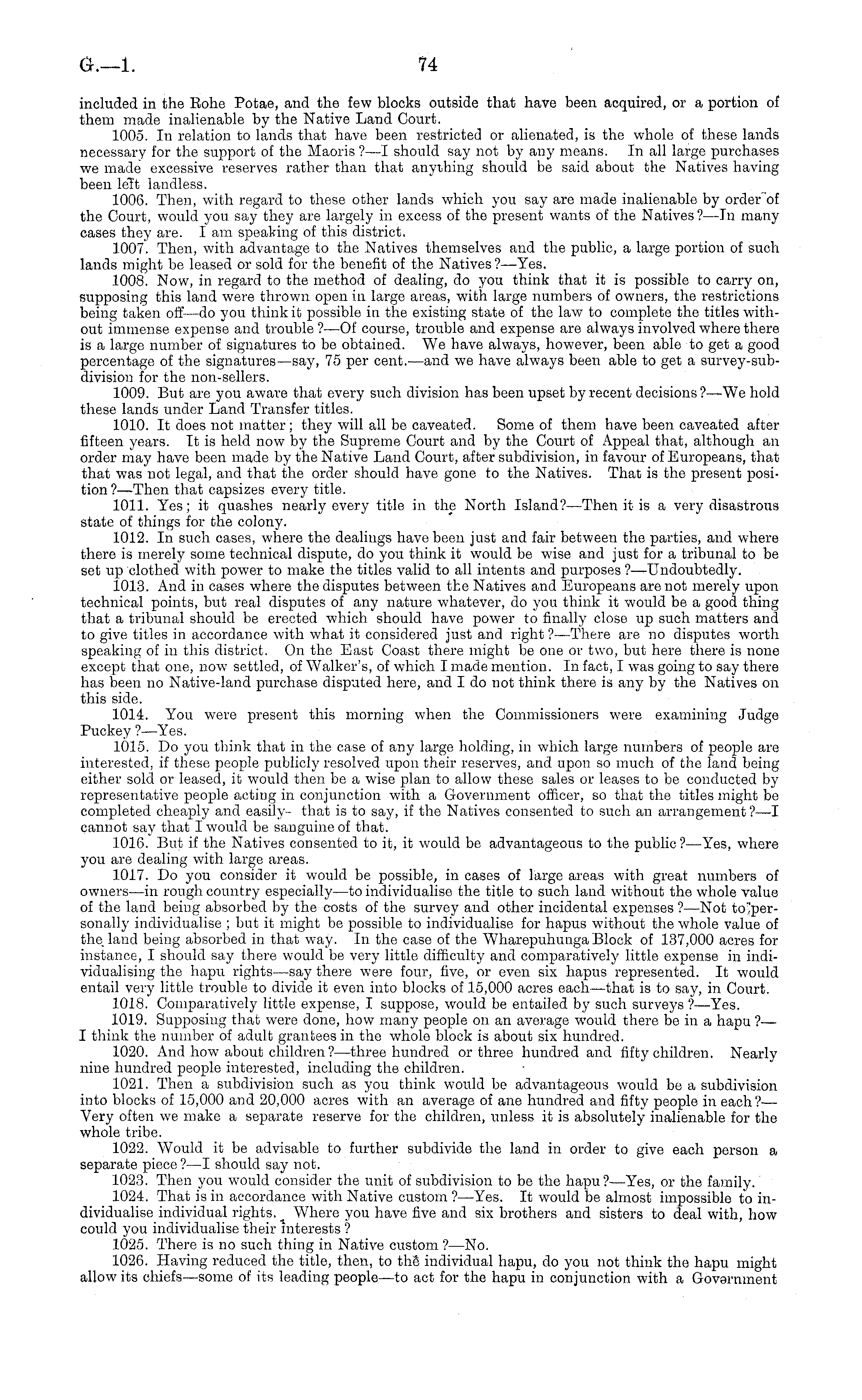 included in the Rohe Potae, and the few blocks outside that have been acquired, or a portion of them made inalienable by the Native Land Court. 1005. In relation to lands that have been restricted or alienated, is the Avhole of these lands necessary for the support of the Maoris ?—I should say not by any means. In all large purchases we made excessive reserves rather than that anything should be said about the Natives haA'ing been left landless. 1006. Then, with regard to these other lands which you say are made inalienable by order "of the Court, would you say they are largely in excess of the present wants of the Natives ?—ln many cases they are. lam speaking of this district. 1007. Then, with advantage to the Natives themselves and the public, a large portion of such lands might be leased or sold for the benefit of the Natives ?—Yes. 1008. Now, in regard to the method of dealing, do you think that it is possible to carry on, supposing this land were thrown open in large areas, with large numbers of owners, the restrictions being taken off—do you think it possible in the existing state of the law to complete the titles without immense expense and trouble ?—Of course, trouble and expense are always involved where there is a large number of signatures to be obtained. We have always, however, been able to get a good percentage of the signatures —say, 75 per cent. —and we have always been able to get a survey-sub-division for the non-sellers. 1009. But are you aware that every such division has been upset by recent decisions ?—We hold these lands under Land Transfer titles. 1010. It does not matter; they will all be caveated. Some of them have been caveated after fifteen years. It is held now by the Supreme Court and by the Court of Appeal that, although an order may have been made by the Native Land Court, after subdivision, in favour of Europeans, that that was not legal, and that the order should have gone to the Natives. That is the present position?—Then that capsizes every title. 1011. Yes; it quashes nearly every title in the North Island?—Then it is a very disastrous state of things for the colony. 1012. In such cases, where the dealings have been just and fair between the parties, and Avhere there is merely some technical dispute, do you think it would be wise and just for a tribunal to be set up clothed with power to make the titles valid to all intents and purposes ?—Undoubtedly. 1013. And in cases where the disputes between the Natives and Europeans are not merely upon technical points, but real disputes of any nature whatever, do you think it would be a good thing that a tribunal should be erected Avhich should have poAver to finally close up such matters and to give titles in accordance with what it considered just and right ?—There are no disputes worth speaking of in this district. On the East Coast there might be one or tAvo, but here there is none except that one, noAV settled, of Walker's, of Avhich I made mention. In fact, I was going to say there has been no Native-land purchase disputed here, and I do not think there is any by the Natives on this side. 1014. You were present this morning when the Commissioners were examining Judge Puckey ?—Yes. 1015. Do you think that in the case of any large holding, in which large numbers of people are interested, if these people publicly resolved upon their reserves, and upon so much of the land being either sold or leased, it Avould then be a wise plan to allow these sales or leases to be conducted by representative people acting in conjunction with a Government officer, so that the titles might be completed cheaply and easily- that is to say, if the Natives consented to such an arrangement?—l cannot say that I would be sanguine of that. 1016. But if the Natives consented to it, it Avould be advantageous to the public?—Yes, Avhere you are dealing with large areas. 1017. Do you consider it would be possible, in cases of large areas with great numbers of owners —in rough country especially—to individualise the title to such land Avithout the whole value of the land being absorbed by the costs of the survey and other incidental expenses ?—Not to'personally individualise ; but it might be possible to individualise for hapus without the Avhole value of the land being absorbed in that way. In the case of the Wharepuhunga Block of 137,000 acres for instance, I should say there Avould be very little difficulty and comparatively little expense in individualising the hapu rights—say there were four, five, or even six hapus represented. It would entail very little trouble to divide it even into blocks of 15,000 acres each—that is to say, in Court. 1018. Comparatively little expense, I suppose, Avould be entailed by such surveys ?—Yes. 1019. Supposing that Avere done, how many people on an average would there be in a hapu ?— I think the number of adult grantees in the whole block is about six hundred. 1020. And how about children?—three hundred or three hundred and fifty children. Nearly nine hundred people interested, including the children. 1021. Then a subdivision such as you think would be advantageous would be a subdivision into blocks of 15,000 and 20,000 acres with an average of ane hundred and fifty people in each?— Very often Ave make a separate reserve for the children, unless it is absolutely inalienable for the whole tribe. 1022. Would it bo advisable to further subdivide the land in order to give each person a separate piece?—l should say not. 1023. Then you would consider the unit of subdivision to be the hapu?—Yes, or the family. 1024. That is in accordance with Native custom ?—Yes. It would be almost impossible to individualise individual rights. Where you have five and six brothers and sisters to deal with, lioav could you individualise their interests ? 1025. There is no such thing in Native custom?—No. 1026. Having reduced the title, then, to the individual hapu, do yo