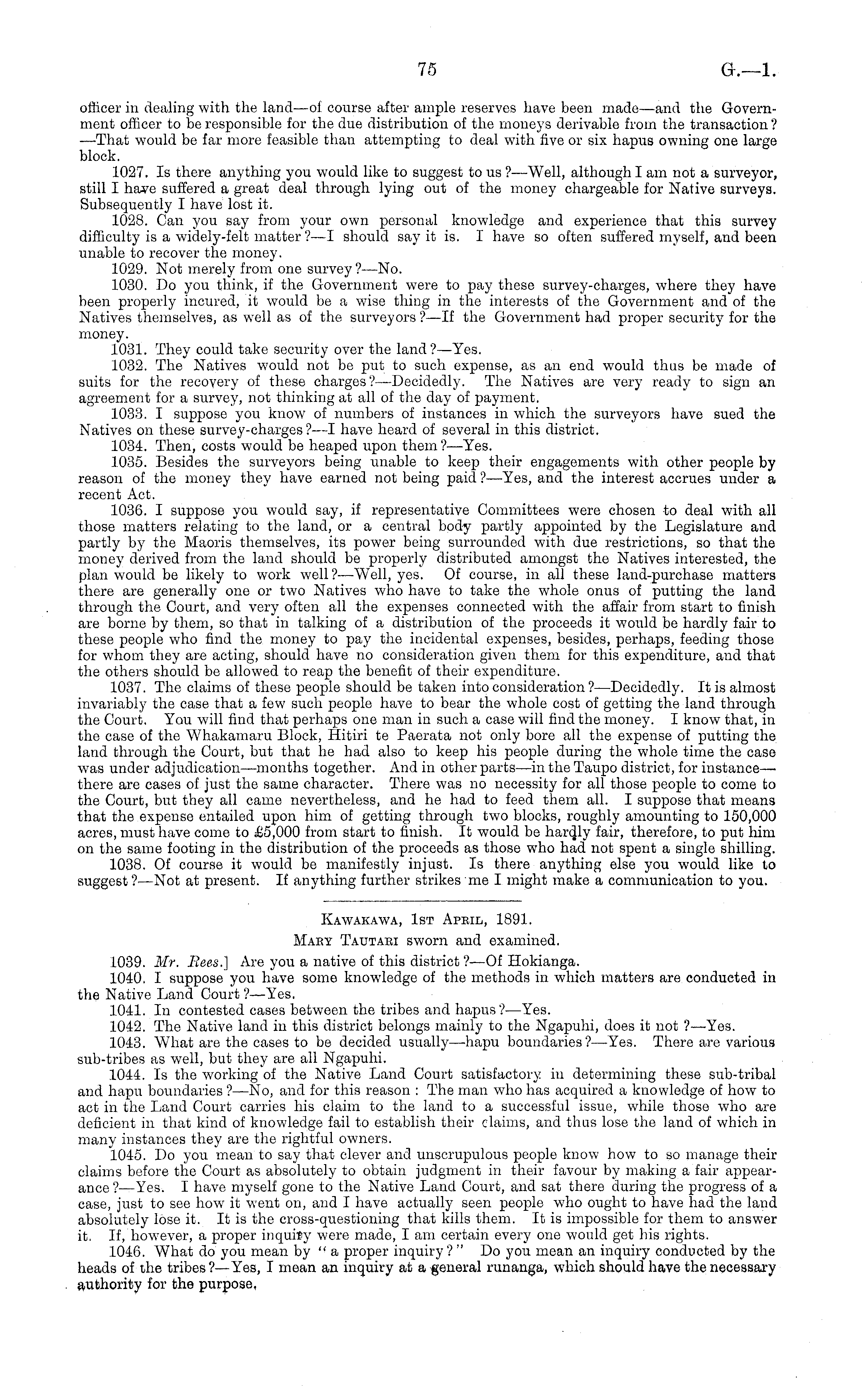 officer in dealing Avith the land—of course after ample reserves have been made—and the Government officer to be responsible for the due distribution of the moneys derivable from the transaction? —-That would be far more feasible than attempting to deal AA'ith five or six hapus owning one large block. 1027. Is there anything you would like to suggest to us ? —Well, although I am not a surveyor, still I have suffered a great deal through lying out of the money chargeable for Native surveys. Subsequently I have lost it. 1028. Can you say from your own personal knowledge and experience that this survey difficulty is a widely-felt matter ?—I should say it is. I have so often suffered myself, and been unable to recover the money. 1029. Not merely from one survey ?—No. 1030. Do you think, if the Government were to pay these survey-charges, Avhere they have been properly incured, it Avould be a wise thing in the interests of the Government and of the Natives themselves, as well as of the surveyors ? —lf the Government had proper security for the money. 1031. They could take security over the land?—Yes. 1032. The Natives would not be put to such expense, as an end would thus be made of suits for the recovery of these charges?—Decidedly. The Natives are very ready to sign an agreement for a survey, not thinking at all of the day of payment. 1033. I suppose you know of numbers of instances in which the surveyors have sued the Natives on these survey-charges?—l have heard of several in this district. 1034. Then, costs would be heaped upon them ? —Yes. 1.035. Besides the surveyors being unable to keep their engagements Avith other people by reason of the money they have earned not being paid ? —Yes, and the interest accrues under a recent Act. 1036. I suppose you would say, if representative Committees were chosen to deal with all those matters relating to the land, or a central body partly appointed by the Legislature and partly by the Maoris themselves, its power being surrounded with due restrictions, so that the money derived from the land should be properly distributed amongst the Natives interested, the plan would be likely to work Avell? —Well, yes. Of course, in all these land-purchase matters there are generally one or tAvo Natives Avho have to take the whole onus of putting the land through the Court, and very often all the expenses connected with the affair from start to finish are borne by them, so that in talking of a distribution of the proceeds it would be hardly fair to these people who find the money to pay the incidental expenses, besides, perhaps, feeding those for whom they are acting, should have no consideration given them for this expenditure, and that the others should be allowed to reap the benefit of their expenditure. 1037. The claims of these people should be taken into consideration ? —Decidedly. It is almost invariably the case that a few such people have to bear the whole cost of getting the land through the Court. You will find that perhaps one man in such a case will find the money. I know that, in the case of the Whakamaru Block, Hitiri te Paerata not only bore all the expense of putting the land through the Court, but that he had also to keep his people during the whole time the case was under adjudication—months together. And in other parts—in the Taupo district, for instancethere are cases of just the same character. There was no necessity for all those people to come to the Court, but they all came nevertheless, and he had to feed them all. I suppose that means that the expense entailed upon him of getting through two blocks, roughly amounting to 150,000 acres, must have come to £5,000 from start to finish. It would be hardly fair, therefore, to put him on the same footing in the distribution of the proceeds as those who had not spent a single shilling. 1038. Of course it Avould be manifestly injust. Is there anything else you would like to suggest ?—Not at present. If anything further strikes me I might make a communication to you.