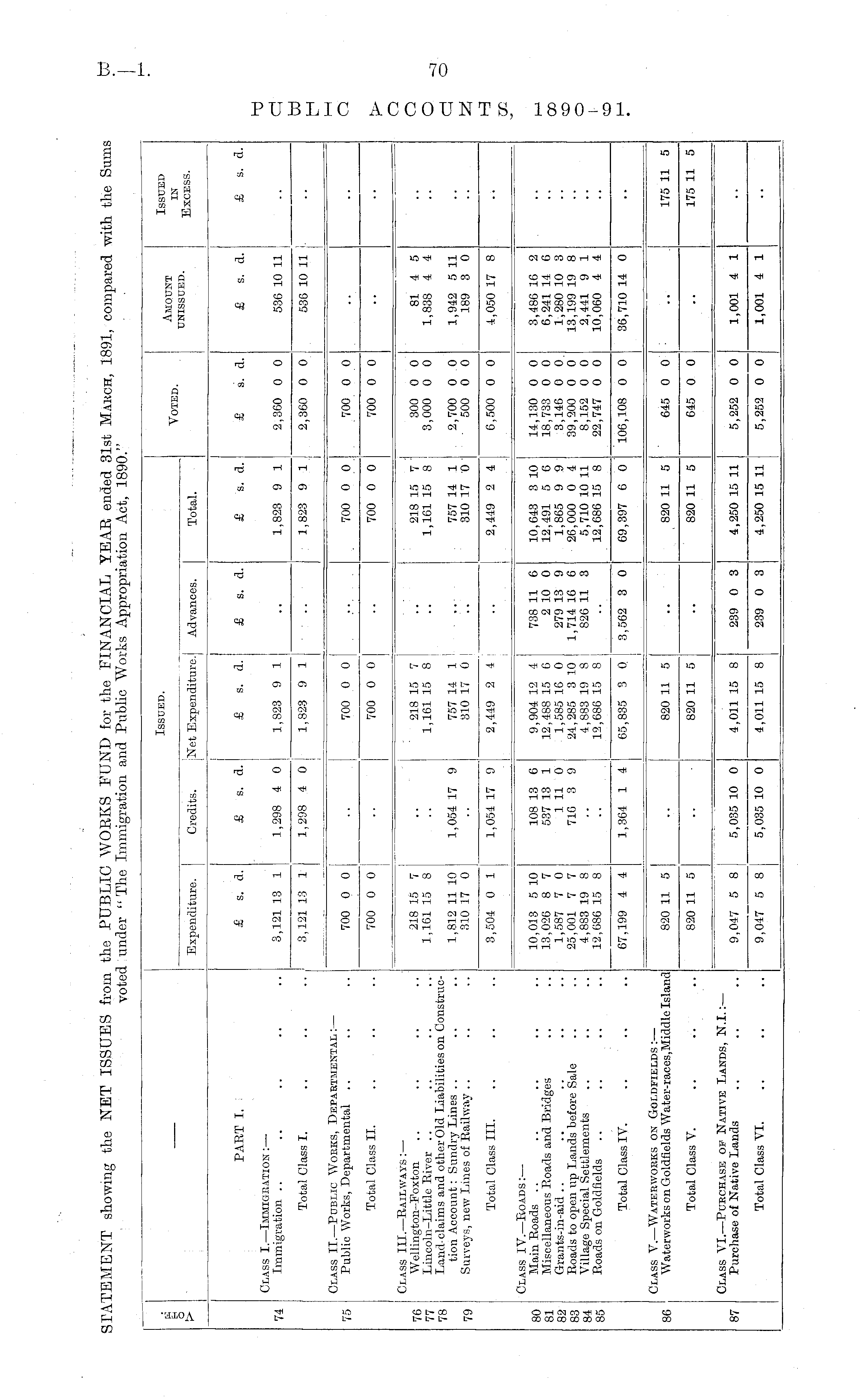 STATEMENT showing the NET ISSUES from the PUBLIC WORKS FUND for the FINANCIAL YEAR ended 31st March, 1891, compared with the Sums voted under "The Immigration and Public Works Appropriation Act, 1890."