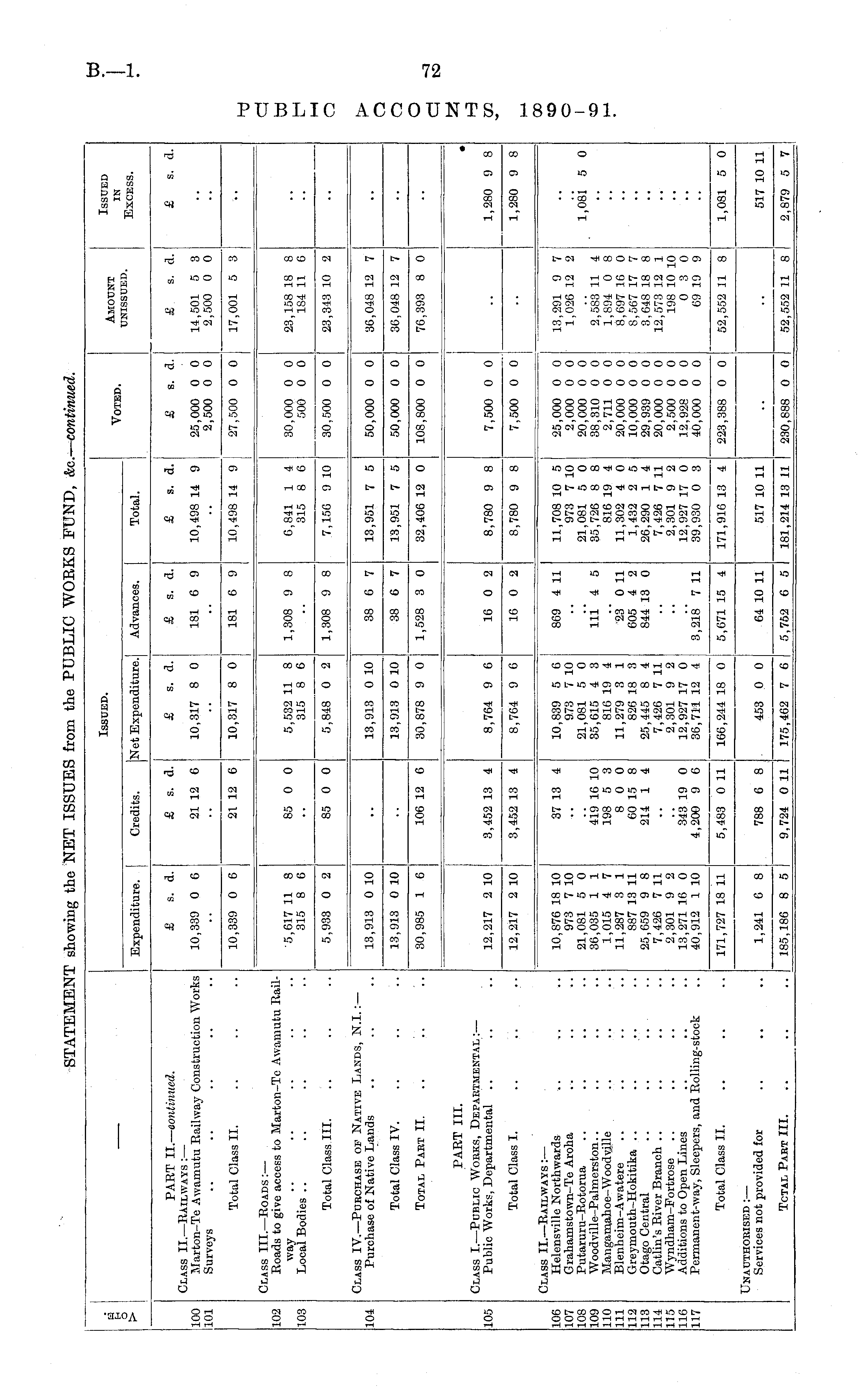 Issued. Issued in Excess. a o Voted. Amount unissued. Expenditure. Credits. Net Expenditure. Advances. Total. PART II.— continued. Class II. —Railways :— Marton-Te Awamutu Railway Construction Works Surveys £ s. d. £ s. a. £ s. d. £ s. d. £ s. a. £ s. d. £ s. d. £ s. d. 100 101 10,339 0 6 21 12 6 10,317 8 0 181 6 9 10,498 14 9 25,000 0 0 2,500 0 0 14,501 5 3 2,500 0 0 Total Class II. 10,339 0 6 21 12 6 10,317 8 0 181 6 9 10,498 14 9 27,500 0 0 17,001 5 3 102 Class III. —Roads :— Roads to give access to Marton-Te Awamutu Railway Local Bodies 103 5,617 11 8 315 8 6 85 0 0 5,532 11 8 315 8 6 1,308 9 8 6,841 1 4 315 8 6 30,000 0 0 500 0 0 23,158 18 8 184 11 6 ■■ Total Class III. 5,848 0 2 5,933 0 2 85 0 0 1,308 9 8 7,150 9 10 30,500 0 0 23,343 10 2 .. Class IV.—Purchase of Native Lands, N.I.: — Purchase of Native Lands 104 13,913 0 10 13,913 0 10 38 6 7 13,951 7 5 50,000 0 0 36,048 12 7 Total Class IV. 13,913 0 10 13,913 0 10 38 6 7 13,951 7 5 50,000 0 0 36,048 12 7 Total Part II. 30,985 1 6 106 12 6 30,878 9 0 1,528 3 0 32,406 12 0 108,800 0 0 76,393 8 0 PART III. Class I.—Public Wobks, Departmental: — Public Works, Departmental • 105 12,217 2 10 3,452 13 4 8,764 9 6 16 0 2 8,780 9 8 7,500 0 0 1,280 9 8 Total Class I. 12,217 2 10 3,452 13 4 8,764 9 6 16 0 2 8,780 9 8 7,500 0 0 1,280 9 8 106 107 108 109 110 111 112 113 114 115 116 117 Class II. —Railways :— Helensville Northwards G rahamstown-Te Aroha Putaruru-Rotorua Woodville-Palmerston.. Mangamahoe-Woodville Blenheim-Awatere Greymouth-Hokitika Otago Central .. .. Catlin's River Branch .. Wyndham-Fortrose Additions to Open Lines Permanent-way, Sleepers, and Rolling-stock 10,876 18 10 973 7 10 21,081 5 0 36,035 1 1 1,015 4 7 11,287 3 1 887 13 11 25,659 9 8 7,426 7 11 2,301 9 2 13,271 16 0 40,912 1 10 37 13 4 419 16 10 198 5 3 8 0 0 60 15 8 214 1 4 10,839 5 6 973 7 10 21,081 5 0 35,615 4 3 816 19 4 11,279 3 1 826 18 3 25,445 8 4 7,426 7 11 2,301 9 2 12,927 17 0 36,711 12 4 166,244 18 0 869 4 11 111" 4 5 23 0 11 605 4 2 844 13 0 11,708 10 5 973 7 10 21,081 5 0 35,726 8 8 816 19 i 11,302 4 0 1,432 2 5 26,290 1 1 7,426 7 11 2,301 9 2 12,927 17 0 39,930 0 3 25,000 0 0 2,000 0 0 20,000 0 0 38,310 0 0 2,711 0 0 20,000 0 0 10,000 0 0 29,939 0 0 20,000 0 0 2,500 0 0 12,928 0 0 40,000 0 0 13,291 9 7 1,026 12 2 2,583 11 4 1,894 0 8 8,697 16 0 8,567 17 7 3,648 18 8 12,573 12 1 198 10 10 0 3 0 69 19 9 1,081 5 0 343 19 0 4,200 9 6 3,218' 7 11 Total Class II. 171,727 18 11 1 5,671 15 4 5,483 0 11 171,916 13 4 223,388 0 0 52,552 11 1,081 5 0 Unauthorised :— Services not provided for 1,241 6 8 788 6 8 453 0 0 64 10 11 517 10 11 517 10 11 •• Total Past III. 175,462 7 6 5,752 6 5 181,214 13 11 230,888 0 0 185,186 8 5 9,724 0 11 52,552 11 8 2,879 5 7