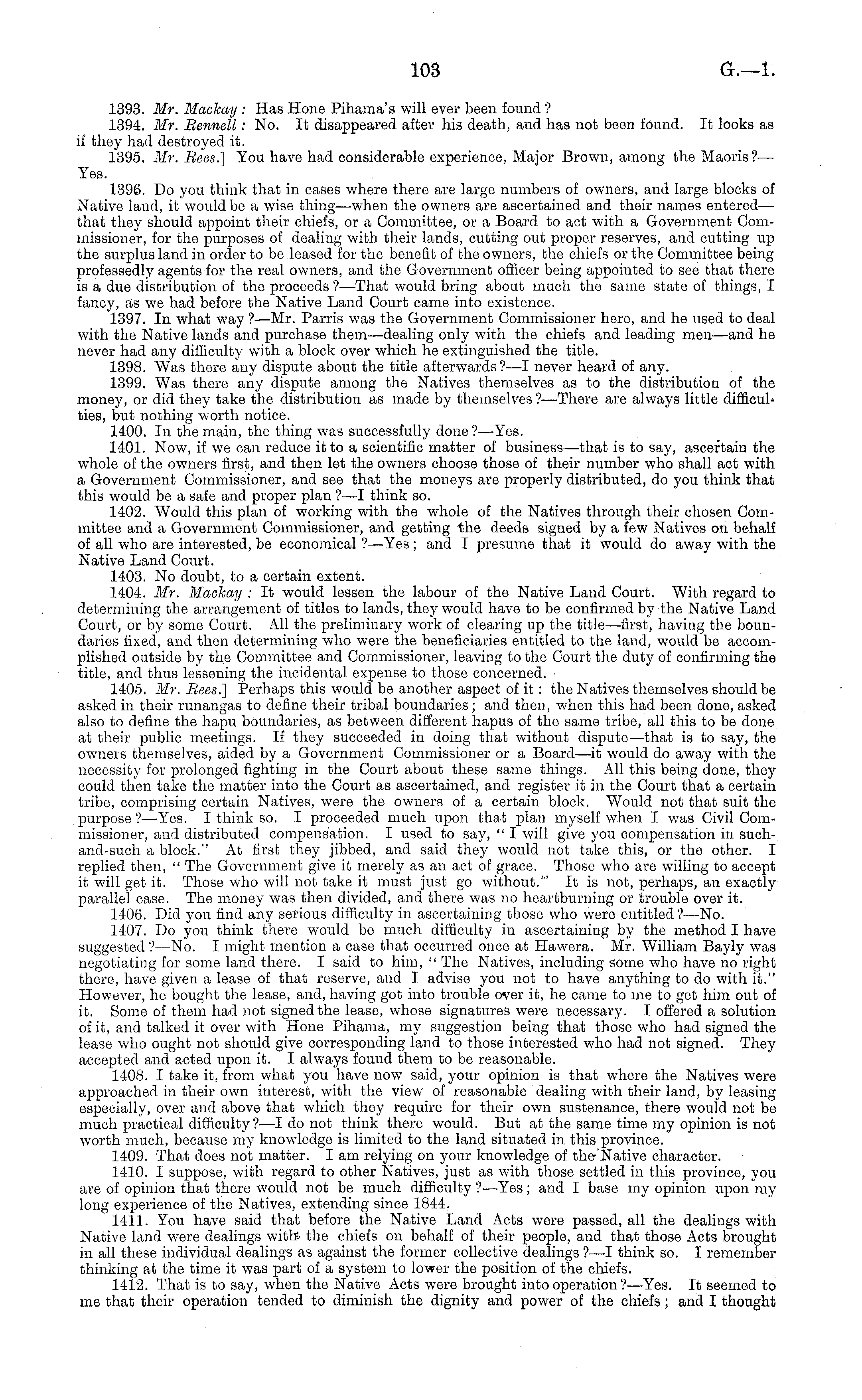 1393. Mr. Mackay : Has Hone Pihama's will ever been found ? 1394. Mr. Bennett : No. It disappeared after his death, and has not been found. It looks as if they had destroyed it. 1395. Mr. Bees.] You have had considerable experience, Major Brown, among the Maoris ?— Yes. 1396. Do you think that in cases where there are large numbers of owners, and large blocks of Native laud, it Avouldbe a wise thing—when the owners are ascertained and their names entered — that they should appoint their chiefs, or a Committee, or a Board to act with a Government Commissioner, for the purposes of dealing with their lands, cutting out proper reserves, and cutting up the surplus land in order to be leased for the benefit of the owners, the chiefs or the Committee being professedly agents for the real owners, and the Government officer being appointed to see that there is a due distribution of the proceeds ?—That would bring about much the same state of things, I fancy, as we had before the Native Land Court came into existence. 1397. In what way ?—Mr. Parris was the Government Commissioner here, and he used to deal with the Native lands and purchase them—dealing only with the chiefs and leading men—and he never had any difficulty with a block over which he extinguished the title. 1398. Was there any dispute about the title afterAvards ?—I never heard of any. 1399. Was there any dispute among the Natives themselves as to the distribution of the money, or did they take the distribution as made by themselves ? —There are ahvays little difficulties, but nothing worth notice. 1400. In the main, the thing was successfully done?—Yes. 140.1. Noav, if we can reduce it to a scientific matter of business—that is to say, ascertain the whole of the owners first, and then let the owners choose those of their number who shall act with a Government Commissioner, and see that the moneys are properly distributed, do you think that this would be a safe and proper plan ? —I think so. 1402. Would this plan of working with the whole of the Natives through their chosen Committee and a Government Commissioner, and getting the deeds signed by a few Natives on behalf of all who are interested, be economical ?—Yes; and I presume that it would do away with the Native Land Court. 1403. No doubt, to a certain extent. 1404. Mr. Mackay : It would lessen the labour of the Native Land Court. With regard to determining the arrangement of titles to lands, they would have to be confirmed by the Native Land Court, or by some Court. All the preliminary Avork of clearing up the title —first, having the boundaries fixed, and then determining who were the beneficiaries entitled to the land, would be accomplished outside by the Committee and Commissioner, leaving to the Court the duty of confirming the title, and thus lessening the incidental expense to those concerned. 1405. Mr. Bees.] Perhaps this would be another aspect of it: the Natives themselves should be asked in their runangas to define their tribal boundaries; and then, when this had been done, asked also to define the hapu boundaries, as between different hapus of the same tribe, all this to bo done at their public meetings. If they succeeded in doing that Avithout dispute—that is to say, the owners themselves, aided by a Government Commissioner or a Board—it would do away with the necessity for prolonged fighting in the Court about these same things. All this being done, they could then take the matter into the Court as ascertained, and register it in the Court that a certain tribe, comprising certain Natives, were the owners of a certain block. Would not that suit the purpose ? —Yes. I think so. I proceeded much upon that plan myself when I was Civil Commissioner, and distributed compensation. I used to say, " I will give you compensation in such-and-such a block." At first they jibbed, and said they Avould not take this, or the other. I replied then, " The Government give it merely as an act of grace. Those who are willing to accept it will get it. Those who will not take it must just go without." It is not, perhaps, an exactly parallel case. The money Avas then divided, and there was no heartburning or trouble over it. 1406. Did you find any serious difficulty in ascertaining those who were entitled?—No. 1407. Do you think there would be much difficulty in ascertaining by the method I have suggested ?—No. I might mention a case that occurred once at Hawera. Mr. William Bayly was negotiating for some land there. I said to him, " The Natives, including some who have no right there, have given a lease of that reserve, and I advise you not to have anything to do Avith it." However, he bought the lease, and, having got into trouble over it, he came to me to get him out of it. Some of them had not signed the lease, whose signatures were necessary. I offered a solution of it, and talked it over with Hone Pihama, my suggestion being that those who had signed the lease who ought not should give corresponding land to those interested who had not signed. They accepted and acted upon it. I always found them to be reasonable. 1408. I take it, from what you have now said, your opinion is that where the Natives were approached in their OAvn interest, with the view of reasonable dealing wifth their land, by leasing especially, over and above that which they require for their own sustenance, there would not be much practical difficulty?—l do not think there would. But at the same time my opinion is not worth much, because my knowledge is limited to the land situated in this province. 1409. That does not matter. lam relying on your knowledge of the'Native character. 1410. I suppose, with regard to other Natives, just as Avith those settled in this province, you are of opinion that there Avould not be much difficulty ?—Yes; and I base my opinion upon my long experience of the Natives, extending since 1844. 1411. You have said that before the Native Land Acts Ave