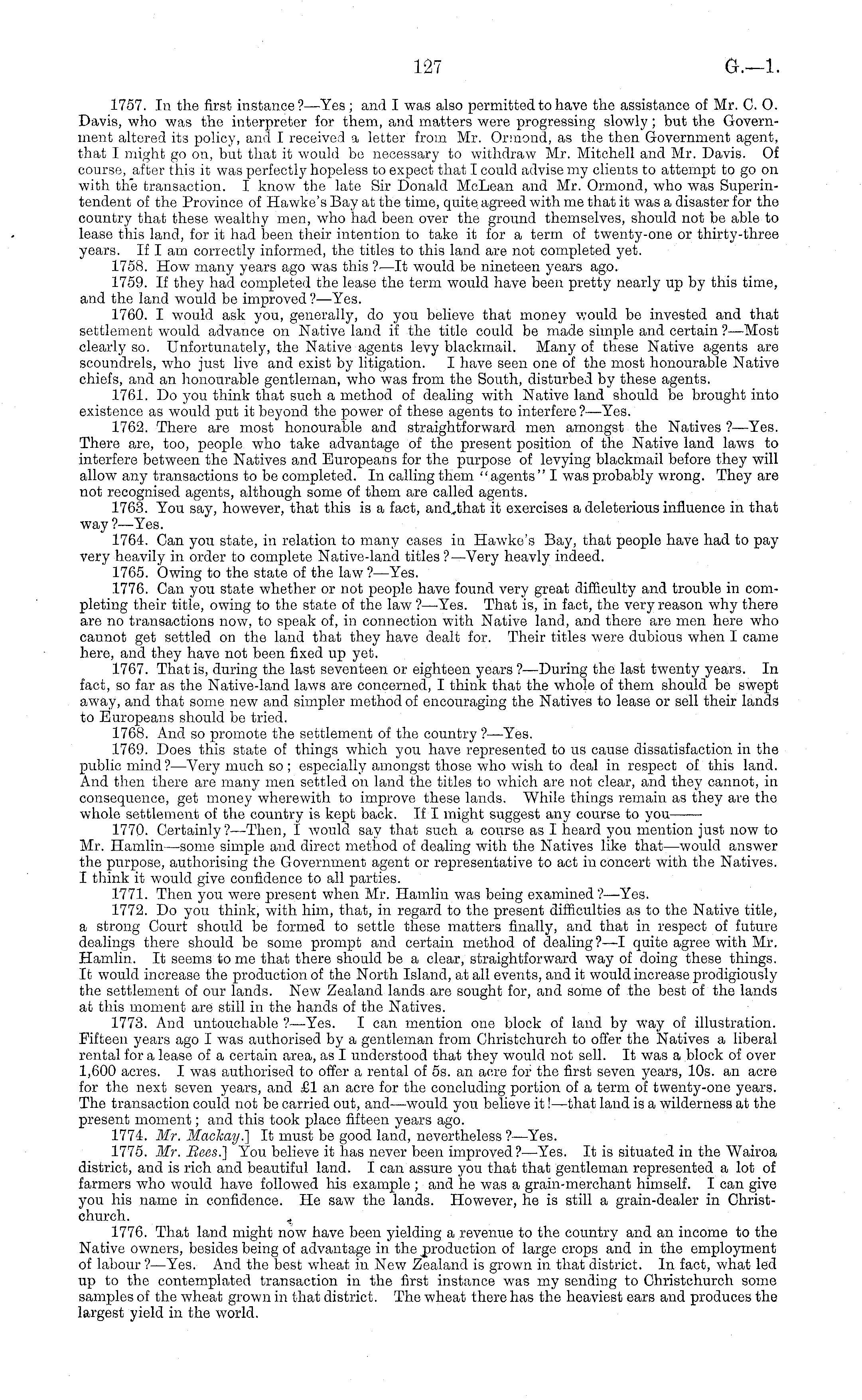 1757. In the first instance? —Yes ; and I was also permitted to have the assistance of Mr. C. 0. Davis, who was the interpreter for them, and matters were progressing slowly ; but the Government altered its policy, and I received a letter from Mr. Ormond, as the then Government agent, that I might go on, but that it would bo necessary to withdraw Mr. Mitchell and Mr. Davis. Of course, after this it was perfectly hopeless to expect that I could advise my clients to attempt to go on with the transaction. I know the late Sir Donald McLean and Mr. Ormond, who was Superintendent of the Province of Hawke's Bay at the time, quite agreed with me that it was a disaster for the country that these wealthy men, Avho had been over the ground themselves, should not be able to lease this land, for it had been their intention, to take it for a term of twenty-one or thirty-three years. If lam correctly informed, the titles to this land are not completed yet. 1758. How many years ago was this ?—lt would be nineteen years ago. 1759. If they had completed the lease the term would have been pretty nearly up by this time, and the land would be improved ? —Yes. 1760. I would ask you, generally, do you believe that money would be invested and that settlement would advance on Native land if the title could be made simple and certain ? —Most clearly so. Unfortunately, the Native agents levy blackmail. Many of these Native agents are scoundrels, Avho just live and exist by litigation. I have seen one of the most honourable Native chiefs, and an honourable gentleman, Avho was from the South, disturbed by these agents. 1761. Do you think that such a method of dealing with Native land should be brought into existence as would put it beyond the power of these agents to interfere?—Yes. 1762. There are most honourable and straightforward men amongst the Natives ? —Yes. There are, too, people who take advantage of the present position, of the Native land laws to interfere between the Natives and Europeans for the purpose of levying blackmail before they will allow any transactions to be completed. In calling them "agents" I was probably Avrong. They are not recognised agents, although some of them are called agents. 1763. You say, however, that this is a fact, and,that it exercises a deleterious influence in that way?—Yes. 1764. Can you state, in relation to many cases in HaAvko's Bay, that people have had to pay very heavily in order to complete Native-land titles?—Very heavly indeed. 1765. Owing to the state of the law ? —Yes. 1776. Can you state whether or not people have found very great difficulty and trouble in completing their title, owing to the state of the IaAV ?—Yes. That is, in fact, the very reason why there are no transactions noAV, to speak of, in connection with Native land, and there are men here who cannot get settled on the land that they have dealt for. Their titles were dubious when I came here, and they have not been fixed up yet. 1767. That is, during the last seventeen or eighteen years ?—During the last twenty years. In fact, so far as the Native-land laws are concerned, I think that the whole of them should be swept away, and that some new and simpler method of encouraging the Natives to lease or sell their lands to Europeans should be tried. 1768. And so promote the settlement of the country?—Yes. 1769. Does this state of things which you have represented to us cause dissatisfaction in the public mind ? —Very much so ; especially amongst those who wish to deal in respect of this land. And then there are many men settled on land the titles to Avhich are not clear, and they cannot, in consequence, get money Avherewith to improve these lands. While things remain as they are the whole settlement of the country is kept back. If I might suggest any course to you • 1770. Certainly?—Then, I Avould say that such a course as I heard you mention just now to Mr. Hamlin—some simple and direct method of dealing Avith the Natives like that—would answer the purpose, authorising the Government agent or representative to act in concert with the Natives. I think it would give confidence to all parties. 1771. Then you were present when Mr. Hamlin was being examined? —-Yes. 1772. Do you think, with him, that, in regard to the present difficulties as to the Native title, a strong Court should be formed to settle these matters finally, and that in respect of future dealings there should be some prompt and certain method of dealing?—l quite agree with Mr. Hamlin. It seems to me that there should be a clear, straightforward way of doing these things. It would increase the production of the North Island, at all events, and it would increase prodigiously the settlement of our lands. New Zealand lands are sought for, and some of the best of the lands at this moment are still in the hands of the Natives. 1773. And untouchable ?—Yes. I can mention one block of land by way of illustration. Fifteen years ago I was authorised by a gentleman from Christchurch to offer the Natives a liberal rental for a lease of a certain area, as I understood that they would not sell. It Avas a block of over 1,600 acres. I Avas authorised to offer a rental of ss. an acre for the first seven years, 10s. an acre for the next seven years, and £1 an acre for the concluding portion of a term of tAventy-one years. The transaction could not be carried out, and—would you believe it!—that land is a wilderness at the present moment; and this took place fifteen years ago. 1774. Mr. Mackay.] It must be good land, nevertheless ?—Yes. 1775. Mr. Bees.] You believe it has never been improved? —Yes. It is situated in the Wairoa district, and is rich and beautiful land. I can assure you that that gentleman represented a lot of farmers who would have followed his example ; and he was a grain-merchant himself. I can give you his name in confidence. He saw the lands. However, he is still a grain-dealer in Christchurc