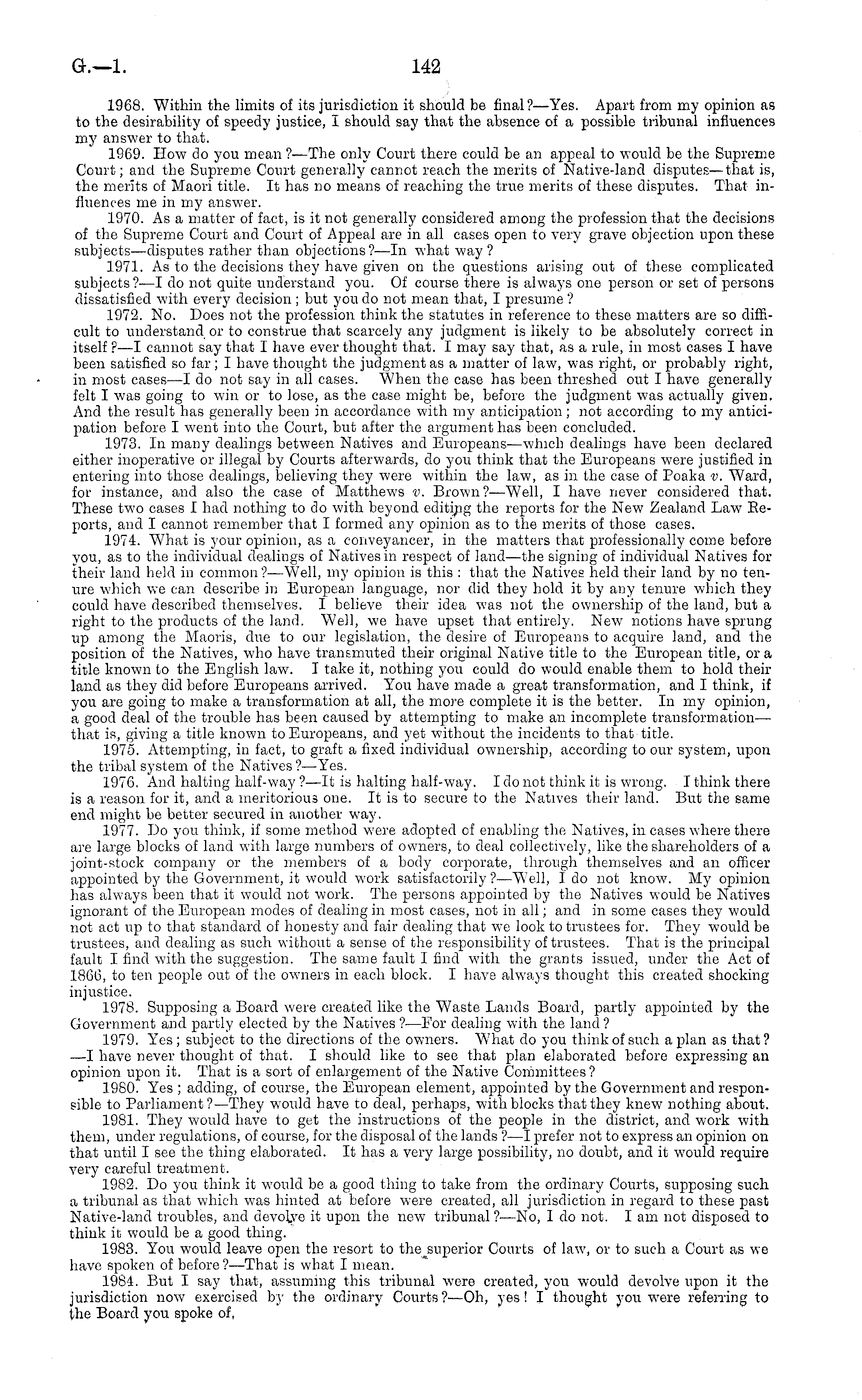 1968. Within the limits of its jurisdiction it should be final?—Yes. Apart from my opinion as to the desirability of speedy justice, I should say that the absence of a possible tribunal influences my answer to that. 1969. How do you mean ?—The only Court there could be an appeal to would be the Supreme Court; and the Supreme Court generally cannot reach the merits of Native-land disputes—that is, the merits of Maori title. It has no means of reaching the true merits of these disputes. That influences me in my answer. 1970. As a matter of fact, is it not generally considered among the profession that the decisions of the Supreme Court and Court of Appeal are in all cases open to very grave objection upon these subjects—disputes rather than objections?-—ln what way? 1971. As to the decisions they have given on the questions arising out of these complicated subjects?—l do not quite understand you. Of course there is always one person or set of persons dissatisfied Avith every decision ; but you do not mean that, I presume ? 1972. No. Does not the profession think the statutes in reference to these matters are so difficult to understand or to construe that scarcely any judgment is likely to be absolutely correct in itself ?- —I cannot say that I have ever thought that. I may say that, as a rule, in most cases I have been satisfied so far; I have thought the judgment as a matter of law, was right, or probably right, in most cases —I do not say in all cases. When the case has been threshed out I have generally felt I Avas going to Avin or to lose, as the case might be, before the judgment was actually given. And the result has generally been in accordance with my anticipation; not according to my anticipation before I went into the Court, but after the argument has been concluded. 1973. In many dealings between Natives and Europeans—which dealings have been declared either inoperative or illegal by Courts afterwards, do you think that the Europeans were justified in entering into those dealings, believing they were within the law, as in the case of Poaka v. Ward, for instance, and also the case of Matthews v. BroAvn?—Well, I have never considered that. These two cases I had nothing to do with beyond editing the reports for the New Zealand Law Reports, and I cannot remember that I formed any opinion as to the merits of those cases. 1974. What is your opinion, as a conveyancer, in the matters that professionally come before you, as to the individual dealings of Natives in respect of land—the signing of individual Natives for their land held in common ? —Well, my opinion is this : that the Natives held their land by no tenure Avhich Ave can describe in European language, nor did they hold it by any tenure Avhich they could have described themselves. I belieA'e their idea Avas not the ownership of the land, but a right to the products of the land. Well, we have upset that entirely. NeAv notions haA'e sprung up among the Maoris, due to our legislation, the desire of Europeans to acquire land, and the position of the Natives, who have transmuted their original Native title to the European title, or a title known to the English law. I take it, nothing you could do would enable them to hold their land as they did before Europeans arrived. You have made a great transformation, and I think, if you are going to make a transformation at all, the more complete it is the better. In my opinion, a good deal of the trouble has been caused by attempting to make an incomplete transformation — that is, giving a title knoAvn to Europeans, and yet without the incidents to that title. 1975. Attempting, in fact, to graft a fixed individual ownership, according to our system, upon the tribal system of the Natives ? —Y'es. 1976. And halting half-way ?—lt is halting half-Avay. Ido not think it is Avrong. I think there is a reason for it, and a meritorious one. It is to secure to the Natives their land. But the same end might be better secured in another Avay. 1977. Do you think, if some method were adopted of enabling the Natives, in cases AA'here there are large blocks of land with large numbers of owners, to deal collectively, like the shareholders of a joint-stock company or the members of a body corporate, through themselves and an officer appointed by the Government, it would Avork satisfactorily ?—Well, Ido not knoAV. My opinion has always been that it Avould not work. The persons appointed by the Natives would be NatiA'es ignorant- of the European modes of dealing in most cases, not in all; and in some cases they would not act up to that standard of honesty and fair dealing that avo look to trustees for. They would be trustees, and dealing as such without a sense of the responsibility of trustees. That is the principal fault I find Avith the suggestion. The same fault I find with the grants issued, under the Act of 1866, to ten people out of the OAvners in each block. I have always thought this created shocking injustice. 1978. Supposing a Board Avere created like the Waste Lands Board, partly appointed by the Government and partly elected by the Natives?—For dealing with the land? 1979. Yfes; subject to the directions of the OAvners. What do you think of such apian as that? —I have never thought of that. I should like to see that plan elaborated before expressing an opinion upon it. That is a sort of enlargement of the Native Committees? 1980. Yes ; adding, of course, the European element, appointed by the Government and responsible to Parliament?—They would have to deal, perhaps, with blocks that they knew nothing about. 1981. They Avould haA'e to get the instructions of the people in tho district, and work with them, under regulations, of course, for the disposal of the lands ?—I prefer not to express an opinion on that until I see the thing elaborated. It has a very large possibility, no doubt, and it Avould require very careful treatment. 1982. Do you think it would be