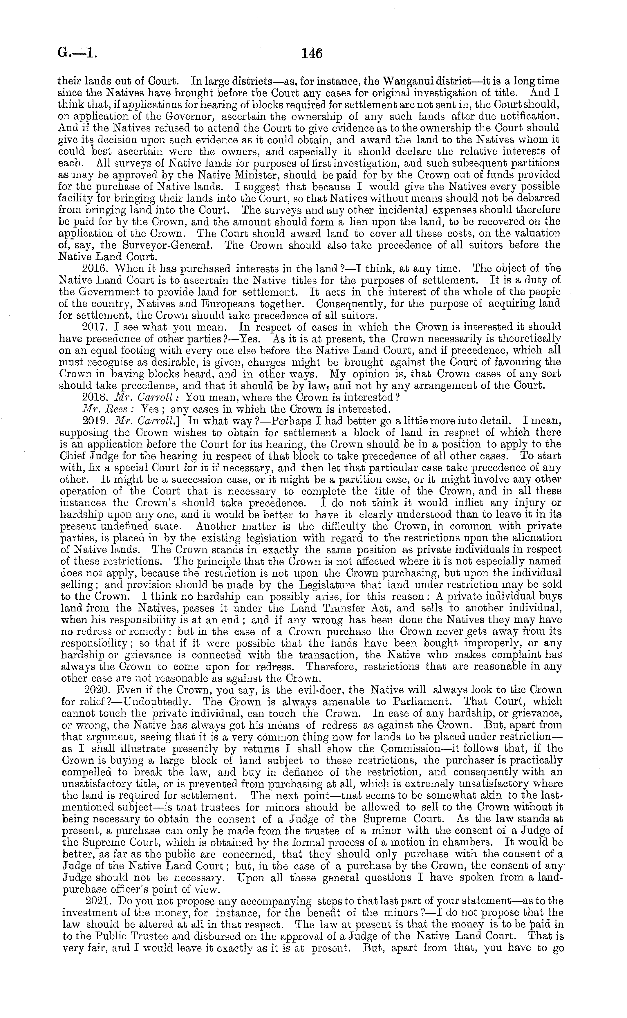 their lands out of Court. In large districts—as, for instance, the Wanganui district —it is a long time since the Natives have brought before the Court any cases for original investigation of title. And I think that, if applications for hearing of blocks required for settlement are not sent in, the Court should, on application of the Governor, ascertain the ownership of any such lands after due notification. And if the Natives refused to attend the Court to giA'e evidence as to the ownership the Court should give its decision upon such evidence as it could obtain, and award the land to the Natives whom it could best ascertain were the owners, and especially it should declare the relative interests of each. All surveys of NatiA'e lands for purposes of first investigation, and such subsequent partitions as may be approved by the Native Minister, should be paid for by the Crown out of funds provided for the purchase of Native lands. I suggest that because I would give the Natives every possible facility for bringing their lands into the Court, so that Natives without means should not be debarred from bringing land into the Court. The surveys and any other incidental expenses should therefore be paid for by the Crown, and the amount should form a lien upon the land, to be recovered on the application of the Crown. The Court should award land to cover all these costs, on the valuation of, say, the Surveyor-General. The Crown should also take precedence of all suitors before the Native Land Court. 2016. When it has purchased interests in the land ?—I think, at any time. The object of the Native Land Court is to ascertain the Native titles for the purposes of settlement. It is a duty of the Government to provide land for settlement. It acts in the interest of the whole of the people of the country, Natives and Europeans together. Consequently, for the purpose of acquiring land for settlement, the Crown should take precedence of all suitors. 2017. I see what you mean. In respect of cases in which the Crown is interested it should have precedence of other parties ?—Yes. As it is at present, the Crown necessarily is theoretically on an equal footing with every one else before the Native Land Court, and if precedence, which all must recognise as desirable, is given, charges might be brought against the Court of favouring the Crown in having blocks heard, and in other ways. My opinion is, that Crown cases of any sort should take precedence, and that it should be by law* and not by any arrangement of the Court. 2018. Mr. Carroll: You mean, where the Crown is interested? Mr. Bees : Yes ; any cases in which the Crown is interested. 2019. Mr. Carroll.] In what way ?—Perhaps I had better go a little more into detail. I mean, supposing the Crown wishes to obtain for settlement a block of land in respect of which there is an application before the Court for its hearing, the Crown should be in a position to apply to the Chief Judge for the hearing in respect of that block to take precedence of all other cases. To start with, fix a special Court for it if necessary, and then let that particular case take precedence of any other. It might be a succession case, or it might be a partition case, or it might involve any other operation of the Court that is necessary to complete the title of the Crown, and in all these instances tho Crown's should take precedence. Ido not think it would inflict any injury or hardship upon any one, and it would be better to have it clearly understood than to leave it in its present undefined state. Another matter is the difficulty the Crown, in common with private parties, is placed in by the existing legislation with regard to the restrictions upon the alienation of Native lands. The Crown stands in exactly the same position as private individuals in respect of these restrictions. The principle that the Crown is not affected where it is not especially named does not apply, because the restriction is not upon the Crown purchasing, but upon the individual selling; and provision should be made by the Legislature that land under restriction may be sold to the Crown. I think no hardship can possibly arise, for this reason : A private individual buys land from the Natives, passes it under the Land Transfer Act, and sells to another individual, when his responsibility is at an end ; and if any wrong has been done the Natives they may have no redress or remedy : but in the case of a Crown purchase the Crown never gets away from its responsibility; so that if it were possible that the lands have been bought improperly, or any hardship or grievance is connected with the transaction, the Native who makes complaint has always the Crown to come upon for redress. Therefore, restrictions that are reasonable in any other case are not reasonable as against the Crown. 2020. Even if the Crown, you say, is the evil-doer, the Native will always look to the Crown for relief?—Undoubtedly. The Crown is always amenable to Parliament. That Court, which cannot touch the private individual, can touch the CroAvn. In case of any hardship, or grievance, or wrong, the Native has always got his means of redress as against the Crown. But, apart from that argument, seeing that it is a very common thing now for lands to be placed under restriction— as I shall illustrate presently by returns I shall show the Commission—it follows that, if the Crown is buying a large block of land subject to these restrictions, the purchaser is practically compelled to break the law, and buy in defiance of the restriction, and consequently with an unsatisfactory title, or is prevented from purchasing at all, which is extremely unsatisfactory where the land is required for settlement. The next point—that seems to be somewhat akin to the lastmentioned subject—is that trustees for minors should be allowed to sell to the Crown without it being necessary to obtain the consent of a Judge of the Supreme Court. As the law 