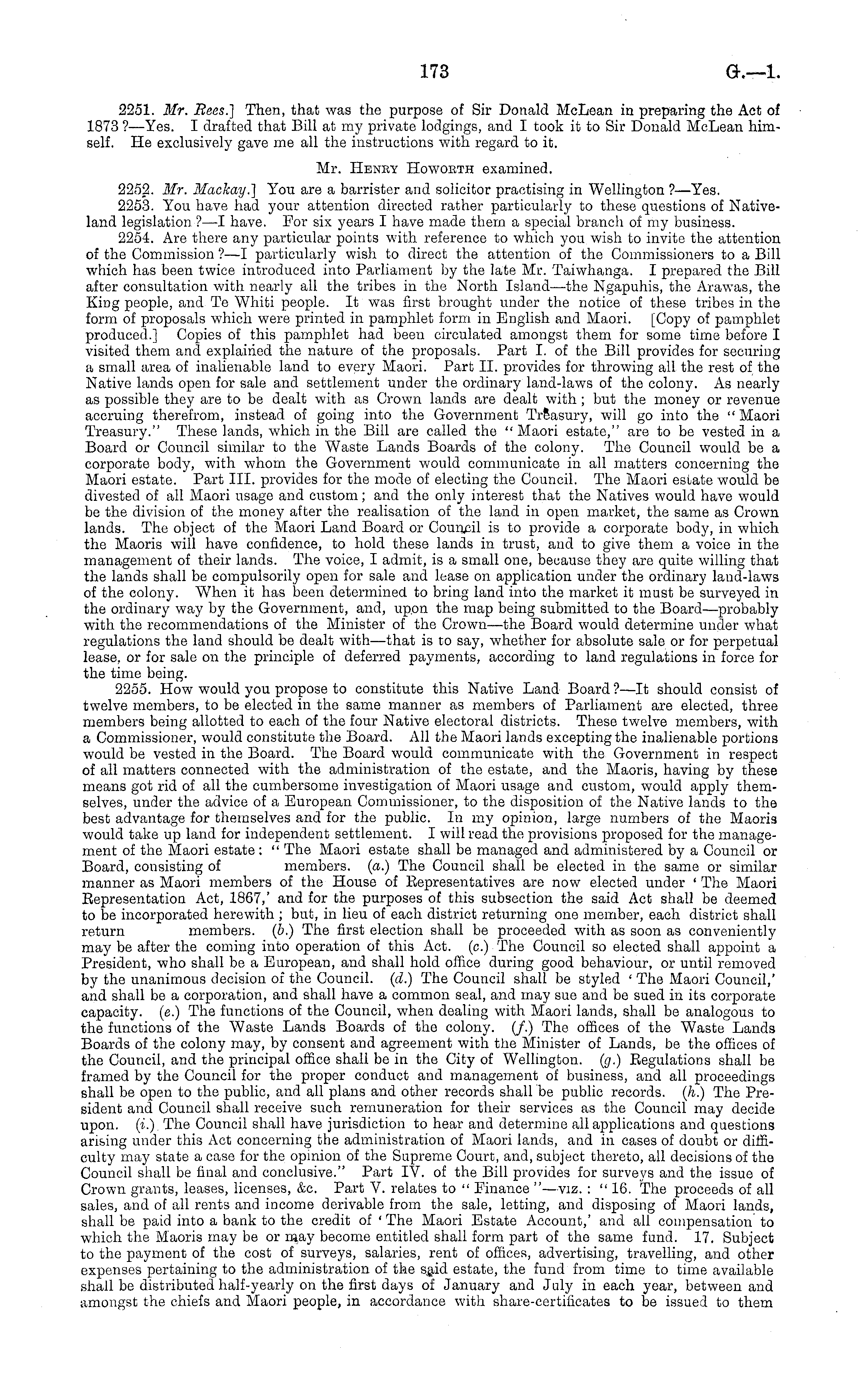 2251. Mr. Bees.] Then, that was the purpose of Sir Donald McLean in preparing the Act of 1873 ?—Yes. I drafted that Bill at my private lodgings, and I took it to Sir Donald McLean himself. He exclusively gave me all the instructions with regard to it. Mr. Heney Howoeth examined. 2252. Mr. Mackay.] You are a barrister and solicitor practising in Wellington ?—Yes. 2253. You have had your attention directed rather particularly to these questions of Nativeland legislation ?—I have. For six years I have made them a special branch of my business. 2254. Are there any particular points with reference to which you wish to invite the attention of the Commission ?—I particularly wish to direct the attention of the Commissioners to a Bill which has been twice introduced into Parliament by the late Mr. Taiwhanga. I prepared the Bill after consultation with nearly all the tribes in the North Island—the Ngapuhis, the Arawas, the King people, and Te Whiti people. It was first brought under the notice of these tribes in the form of proposals which were printed in pamphlet form in English and Maori. [Copy of pamphlet produced.] Copies of this pamphlet had been circulated amongst them for some time before I visited them and explained the nature of the proposals. Part I. of the Bill provides for securing a small area of inalienable land to every Maori. Part 11. provides for throwing all the rest of the Native lands open for sale and settlement under the ordinary land-laws of the colony. As nearly as possible they are to be dealt with as Crown lands are dealt with ; but the money or revenue accruing therefrom, instead of going into the Government Treasury, will go into the " Maori Treasury." These lands, which in the Bill are called the "Maori estate," are to be vested in a Board or Council similar to the Waste Lands Boards of the colony. The Council would be a corporate body, with whom the Government would communicate in all matters concerning the Maori estate. Part 111. provides for the mode of electing the Council. The Maori estate would be divested of all Maori usage and custom; and the only interest that the Natives Avould have would be the division of the money after the realisation of the land in open market, the same as CroAvn lands. The object of the Maori Land Board or Council is to provide a corporate body, in which the Maoris will have confidence, to hold these lands in trust, and to give them a voice in the management of their lands. The voice, I admit, is a small one, because they are quite Avilling that the lands shall be eompulsorily open for sale and lease on application under the ordinary laud-laws of the colony. When it has been determined, to bring land into the market it must be surveyed in the ordinary way by the Government, and, upon the map being submitted to the Board—probably with the recommendations of the Minister of the Crown—the Board would determine under what regulations the land should be dealt with—that is to say, whether for absolute sale or for perpetual lease, or for sale on the principle of deferred payments, according to land regulations in force for the time being. 2255. How would you propose to constitute this Native Land Board ?—-It should consist of twelve members, to be elected in the same manner as members of Parliament are elected, three members being allotted to each of the four Native electoral districts. These twelve members, with a Commissioner, would constitute the Board. All the Maori lands excepting the inalienable portions would be vested in the Board. The Board would communicate with the Government in respect of all matters connected with the administration of the estate, and the Maoris, having by these means got rid of all the cumbersome investigation of Maori usage and custom, would apply themselves, under the advice of a European Commissioner, to the disposition of the Native lands to the best advantage for themselves and for the public. In my opinion, large numbers of the Maoris would take up land for independent settlement. I will read the provisions proposed for the management of the Maori estate : " The Maori estate shall be managed and administered by a Council or Board, consisting of members, (a.) The Council shall be elected in the same or similar manner as Maori members of the House of Bepresentatives are now elected under ' The Maori Bepresentation Act, 1867,' and for the purposes of this subsection the said Act shall be deemed to be incorporated herewith ; but, in lieu of each district returning one member, each district shall return members, (b.) The first election shall be proceeded with as soon as conveniently may be after the coming into operation of this Act. (c.) The Council so elected shall appoint a President, who shall be a European, and shall hold office during good behaviour, or until removed by the unanimous decision of the Council, (d.) The Council shall be styled ' The Maori Council,' and shall be a corporation, and shall have a common seal, and may sue and be sued in its corporate capacity, (e.) The functions of the Council, when dealing with Maori lands, shall be analogous to the functions of the Waste Lands Boards of the colony. (/.) The offices of the Waste Lands Boards of the colony may, by consent and agreement with the Minister of Lands, be the offices of the Council, and the principal office shall be in the City of Wellington, (g.) Begulations shall be framed by the Council for the proper conduct and management of business, and all proceedings shall be open to the public, and all plans and other records shall be public records, (h.) The President and Council shall receive such remuneration for their services as the Council may decide upon, (i.) The Council shall have jurisdiction to hear and determine all applications and questions arising under this Act concerning the administration of Maori lands, and in cases of doubt or difficulty may state a case for the opinion of the Supreme Court, and, subject 