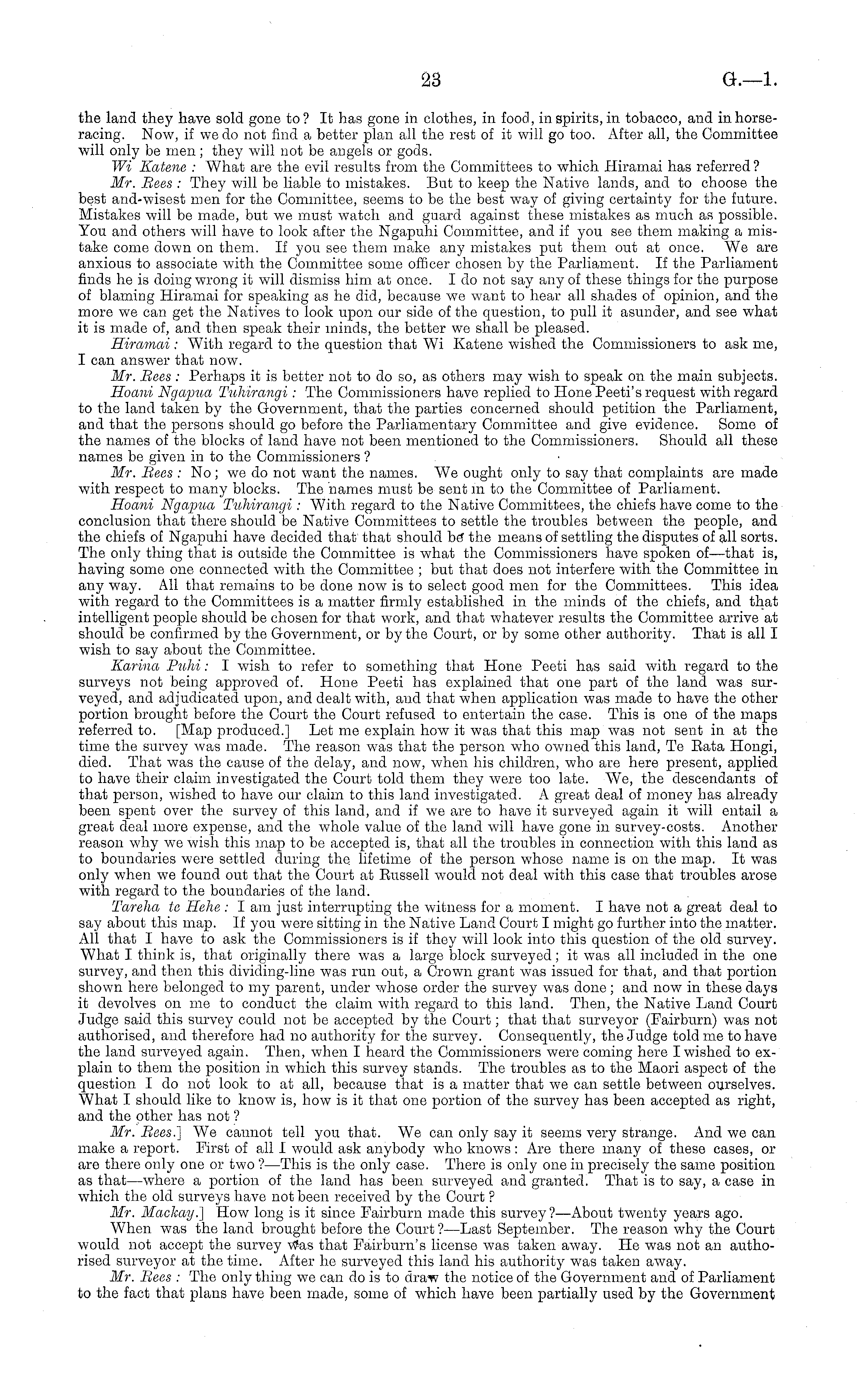 the land they have sold gone to ? It has gone in clothes, in food, in spirits, in tobacco, and in horseracing. Noav, if Ave do not find a better plan all the rest of it will go too. After all, the Committee will only be men; they will not be angels or gods. Wi Katene : What are the evil results from the Committees to which Hiramai has referred ? Mr. Bees : They will be liable to mistakes. But to keep the Native lands, and to choose the best and-wisest men for the Committee, seems to be the best way of giving certainty for the future. Mistakes will be made, but we must watch and guard against these mistakes as much as possible. You and others will have to look after the Ngapuhi Committee, and if you see them making a mistake come doAvn on them. If you see them make any mistakes put them out at once. We are anxious to associate with the Committee some officer chosen by the Parliament. If the Parliament finds he is doing wrong it will dismiss him at once. Ido not say any of these things for the purpose of blaming Hiramai for speaking as he did, because avo Avant to hear all shades of opinion, and the more we can get the Natives to look upon our side of the question, to pull it asunder, and see Avhat it is made of, and then speak their minds, the better we shall be pleased. Hiramai : With regard to the question that Wi Katene Avished the Commissioners to ask me, I can answer that now. Mr. Bees : Perhaps it is better not to do so, as others may wish to speak on the main subjects. Hoani Ngapua Tuliirangi : The Commissioners have replied to Hone Peeti's request with regard to the land taken by the Government, that the parties concerned should petition the Parliament, and that the persons should go before the Parliamentary Committee and give evidence. Some of the names of the blocks of land have not been mentioned to the Commissioners. Should all these names be given in to the Commissioners ? Mr. Bees : No; we do not want the names. We ought only to say that complaints are made with respect to many blocks. The names must be sent mto the Committee of Parliament. Hoani Ngapua Tuhirangi : With regard to the Native Committees, the chiefs have come to the conclusion that there should be Native Committees to settle the troubles between the people, and the chiefs of Ngapuhi have decided that that should be* the means of settling the disputes of all sorts. The only thing that is outside the Committee is what the Commissioners have spoken of—that is, having some one connected with the Committee ; but that does not interfere with the Committee in any way. All that remains to be done now is to select good men for the Committees. This idea with regard to the Committees is a matter firmly established in the minds of the chiefs, and that intelligent people should be chosen for that work, and that whatever results the Committee arrive at should be confirmed by the Government, or by the Court, or by some other authority. That is all I wish to say about the Committee. Karina Puhi: I wish to refer to something that Hone Peeti has said with regard to the surveys not being approved of. Hone Peeti has explained that one part of the land was surveyed, and adjudicated upon, and dealt with, and that when application was made to have the other portion brought before the Court the Court refused to entertain the case. This is one of the maps referred to. [Map produced.] Let me explain how it Avas that this map was not sent in at the time the survey was made. The reason w ras that the person Avho owned this land, Te Rata Hongi, died. That was the cause of the delay, and iioav, when his children, who are here present, applied to have their claim investigated the Court told them they were too late. We, the descendants of that person, wished to have our claim to this land investigated. A great deal of money has already been spent over the survey of this land, and if avo are to have it surveyed again it will entail a great deal more expense, and the Avhole value of the land will have gone in survey-costs. Another reason Avhy Ave Avish this map to be accepted is, that all the troubles hi connection with this land as to boundaries were settled during the. lifetime of the person whose name is on the map. It was only when we found out that the Court at Russell avoulcl not deal with this case that troubles arose with regard to the boundaries of the land. Tareha te Hehe : lam just interrupting the Avitness for a moment. I have not a great deal to say about this map. If you were sitting in the Native Land Court I might go further into the matter. All that I have to ask the Commissioners is if they will look into this question of the old survey. What I think is, that originally there Avas a large block surveyed; it Avas all included in the one survey, and then this dividing-line was run out, a CroAvn grant was issued for that, and that portion slioaati here belonged to my parent, under whose order the survey was done; and now in these days it devolves on me to conduct the claim with regard to this land. Then, the Native Land Court Judge said this survey could not be accepted by the Court; that that surveyor (Fairburn) was not authorised, and therefore had no authority for the survey. Consequently, the Judge told me to have the land surveyed again. Then, when I heard the Commissioners were coming here I wished to explain to them the position in which this survey stands. The troubles as to the Maori aspect of the question I do not look to at all, because that is a matter that we can settle between ourselves. What I should like to knoAV is, lioav is it that one portion of the survey has been accepted as right, and the other has not ? Mr. Bees.] We cannot tell you that. We can only say it seems very strange. And we can make a report. First of all I would ask anybody who knows : Are there many of these cases, or are there only one or two ?—This is the only case. There is only one in precisely the same position as that —Avhere a porti
