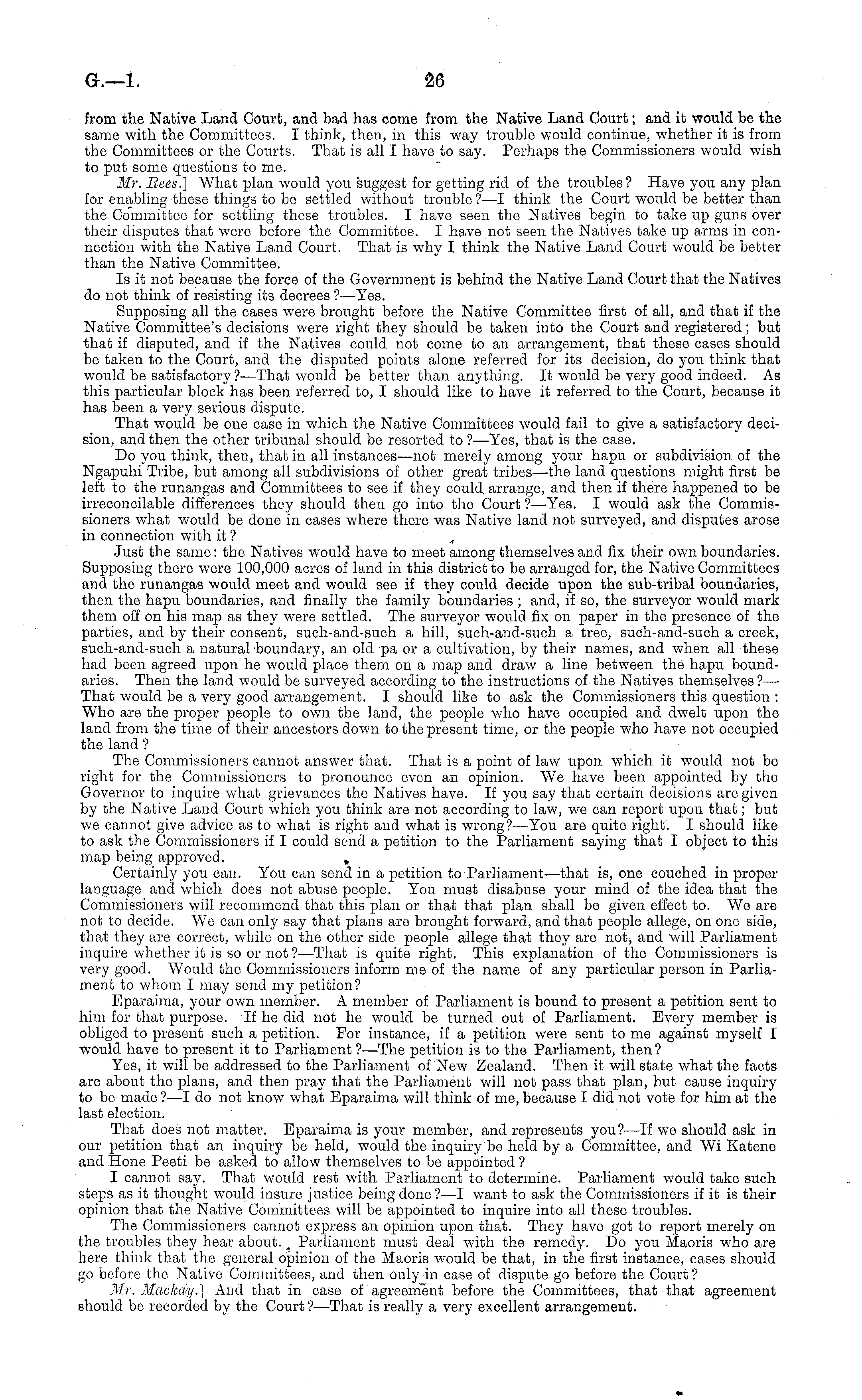 from the Native Land Court, and bad has come from the Native Land Court; and it would be the same with the Committees. I think, then, in this way trouble would continue, whether it is from the Committees or the Courts. That is all I have to say. Perhaps the Commissioners would wish to put some questions to me. Mr. Bees.] What plan would you suggest for getting rid of the troubles? Have you any plan for enabling these things to be settled without trouble ?—I think the Court would be better than the Committee for settling these troubles. I have seen the Natives begin to take up guns over their disputes that were before the Committee. I have not seen the Natives take up arms in connection with the Native Land Court. That is why I think the Native Land Court would be better than the Native Committee. Is it not because the force of the Government is behind the Native Land Court that the Natives do not think of resisting its decrees ?—Yes. Supposing all the cases were brought before the Native Committee first of all, and that if the Native Committee's decisions Avere right they should be taken into the Court and registered; but that if disputed, and if the Natives could not come to an arrangement, that these cases should be taken to the Court, and the disputed points alone referred for its decision, do you think that would be satisfactory ?—That would be better than anything. It Avould be very good indeed. As this particular block has been referred to, I should like to have it referred to the Court, because it has been a very serious dispute. That would be one case in which the Native Committees would fail to give a satisfactory decision, and then the other tribunal should be resorted to ? —Yes, that is the case. Do you think, then, that in all instances—not merely among your hapu or subdivision of the Ngapuhi Tribe, but among all subdivisions of other great tribes—the land questions might first be left to the runangas and Committees to see if they could arrange, and then if there happened to be irreconcilable differences they should then go into the Court ?—Yes. I would ask the Commissioners what would be done in cases where there Avas Native land not surveyed, and disputes arose in connection with it ? Just the same: the Natives Avould have to meet among themselves and fix their own boundaries. Supposing there were 100,000 acres of land in this district to be arranged for, the Native Committees and the runangas would meet and would see if they could decide upon the sub-tribal boundaries, then the hapu boundaries, and finally the family boundaries ; and, if so, the surveyor would mark them off on his map as they were settled. The surveyor would fix on paper in the presence of the parties, and by their consent, such-and-such a hill, such-and-such a tree, such-and-such a creek, such-and-such a natural boundary, an old pa or a cultivation, by their names, and when all these had been agreed upon he would place them on a map and draw a line between the hapu boundaries. Then the land Avould be surveyed according to the instructions of the Natives themselves? — That would be a very good arrangement. I should like to ask the Commissioners this question : Who are the proper people to own the land, the people who have occupied and dwelt upon the land from the time of their ancestors down to the present time, or the people who have not occupied the land ? The Commissioners cannot answer that. That is a point of laAv upon Avhich it would not be right for the Commissioners to pronounce even an opinion. We have been appointed by the Governor to inquire what grievances the Natives hav Te. If you say that certain decisions are given by the Native Land Court Avhich you think are not according to law, we can report upon that; but we cannot give advice as to what is right and what is wrong?—You are quite right. I should like to ask the Commissioners if I could send a petition to the Parliament saying that I object to this map being approved. % Certainly you can. You can send in a petition to Parliament —that is, one couched in proper language and which does not abuse people. You must disabuse your mind of the idea that the Commissioners will recommend that this plan or that that plan shall be given effect to. We are not to decide. We can only say that plans are brought forward, and that people allege, on one side, that they are correct, while on the other side people allege that they are not, and will Parliament inquire Avhether it is so or not ?—That is quite right. This explanation of the Commissioners is very good. Would the Commissioners inform me of the name of any particular person in Parliament to Avhom I may send my petition? Eparaima, your own member. A member of Parliament is bound to present a petition sent to him for that purpose. If he did not he would be turned out of Parliament. Every member is obliged to present such a petition. For instance, if a petition were sent to me against myself I would have to present it to Parliament ?—The petition is to the Parliament, then ? Yes, it will be addressed to the Parliament of New Zealand. Then it will state what the facts are about the plans, and then pray that the Parliament will not pass that plan, but cause inquiry to be made ?—I do not know what Eparaima will think of me, because I did not vote for him at the last election. That does not matter. Eparaima is your member, and represents you?—lf we should ask in our petition that an inquiry be held, would the inquiry be held by a Committee, and Wi Katene and Hone Peeti be asked to allow themselves to be appointed ? I cannot say. That would rest with Parliament to determine. Parliament would take such steps as it thought would insure justice being done ?—I Avant to ask the Commissioners if it is their opinion that the Native Committees will be appointed to inquire into all these troubles. The Commissioners cannot express an opinion upon that. They have got to report merely on