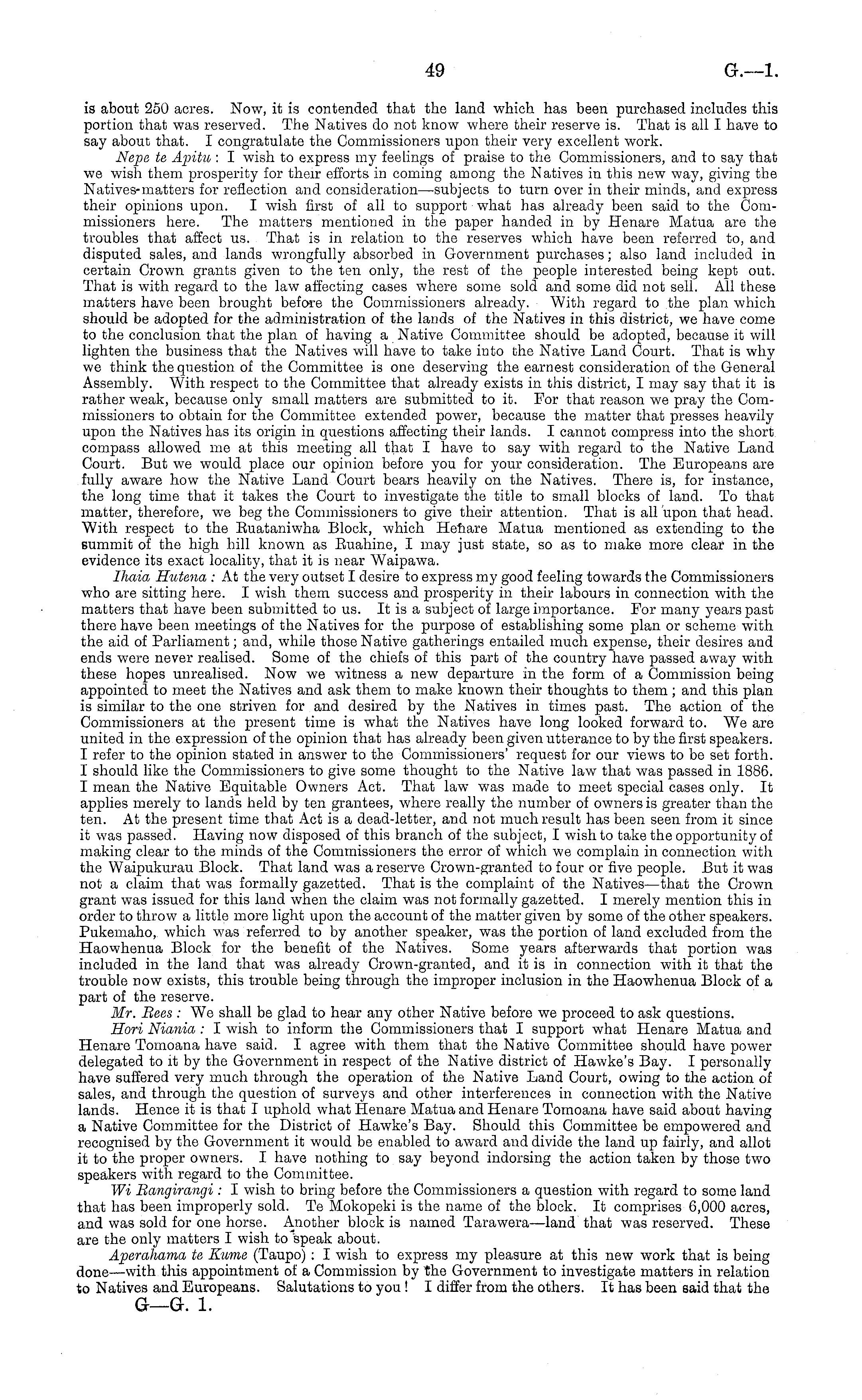 is about 250 acres. Now, it is contended that the land which has been purchased includes this portion that was reserved. The Natives do not know where their reserve is. That is all I have to say about that. I congratulate the Commissioners upon their very excellent work. Nepe te Apitu : I wish to express my feelings of praise to the Commissioners, and to say that we wish them prosperity for their efforts in coming among the Natives in this new way, giving the Natives-matters for reflection and consideration—subjects to turn over in their minds, and express their opinions upon. I wish first of all to support what has already been said to the Commissioners here. The matters mentioned in the paper handed in by Henare Matua are the troubles that affect us. That is in relation to the reserves which have been referred to, and disputed sales, and lands wrongfully absorbed in Government purchases; also land included in certain Crown grants given to the ten only, the rest of the people interested being kept out. That is with regard to the law affecting cases where some sold and some did not sell. All these matters have been brought before the Commissioners already. With regard to the plan which should be adopted for the administration of the lands of the Natives in this district, we have come to the conclusion that the plan of having a Native Committee should be adopted, because it will lighten the business that the Natives will have to take into the Native Land Court. That is why we think the question of the Committee is one deserving the earnest consideration of the General Assembly. With respect to the Committee that already exists in this district, I may say that it is rather weak, because only small matters are submitted to it. For that reason we pray the Commissioners to obtain for the Committee extended power, because the matter that presses heavily upon the Natives has its origin in questions affecting their lands. I cannot compress into the short compass allowed me at this meeting all that I have to say with regard to the Native Land Court. But we would place our opinion before you for your consideration. The Europeans are fully aware how the Native Land Court bears heavily on the Natives. There is, for instance, the long time that it takes the Court to investigate the title to small blocks of land. To that matter, therefore, we beg the Commissioners to give their attention. That is all upon that head. With respect to the Euataniwha Block, which Hehare Matua mentioned as extending to the summit of the high hill known as Euahine, I may7 just state, so as to make more clear in the evidence its exact locality, that it is near Waipawa. Ihaia Hutena : At the very outset I desire to express my good feeling towards the Commissioners who are sitting here. I wish them success and prosperity in their labours in connection with the matters that have been submitted to us. It is a subject of large importance. For many y 7earspast there have been meetings of the Natives for the purpose of establishing some plan or scheme with the aid of Parliament; and, while those Native gatherings entailed much expense, their desires and ends were never realised. Some of the chiefs of this part of the country have passed away with these hopes unrealised. Now we witness a new departure in the form of a Commission being appointed to meet the Natives and ask them to make known their thoughts to them ; and this plan is similar to the one striven for and desired by the Natives in times past. The action of the Commissioners at the present time is what the Natives have long looked forward to. We are united in the expression of the opinion that has already been given utterance to by the first speakers. I refer to the opinion stated in answer to the Commissioners' request for our views to be set forth. I should like the Commissioners to give some thought to the Native law that was passed in 1886. I mean the Native Equitable Owners Act. That law was made to meet special cases only. It applies merely to lands held by ten grantees, where really the number of owners is greater than the ten. At the present time that Act is a dead-letter, and not much result has been seen from it since it was passed. Having now disposed of this branch of the subject, I wish to take the opportunity of making clear to the minds of the Commissioners the error of which we complain in connection with the Waipukurau Block. That land was a reserve Crown-granted to four or five people. But it was not a claim that was formally gazetted. That is the complaint of the Natives—that the Crown grant was issued for this land when the claim was not formally gazetted. I merely mention this in order to throw a little more light upon the account of the matter given by some of the other speakers. Pukemaho, which was referred to by another speaker, was the portion of land excluded from the Haowhenua Block for the benefit of the Natives. Some years afterwards that portion was included in the land that was already Crown-granted, and it is in connection with it that the trouble now exists, this trouble being through the improper inclusion in the Haowhenua Block of a part of the reserve. Mr. Bees : We shall be glad to hear any other Native before we proceed to ask questions. Hori Niania : I wish to inform the Commissioners that I support what Henare Matua and Henare Tomoana have said. I agree with them that the Native Committee should have power delegated to it by the Government in respect of the Native district of Hawke's Bay. I personally have suffered very much through the operation of the Native Land Court, owing to the action of sales, and through the question of surveys and other interferences in connection with the Native lands. Hence it is that I uphold what Henare Matua and Henare Tomoana have said about having a Native Committee for the District of Hawke's Bay. Should this Committee be empowered and recognised by the Government it would be enabled to award an