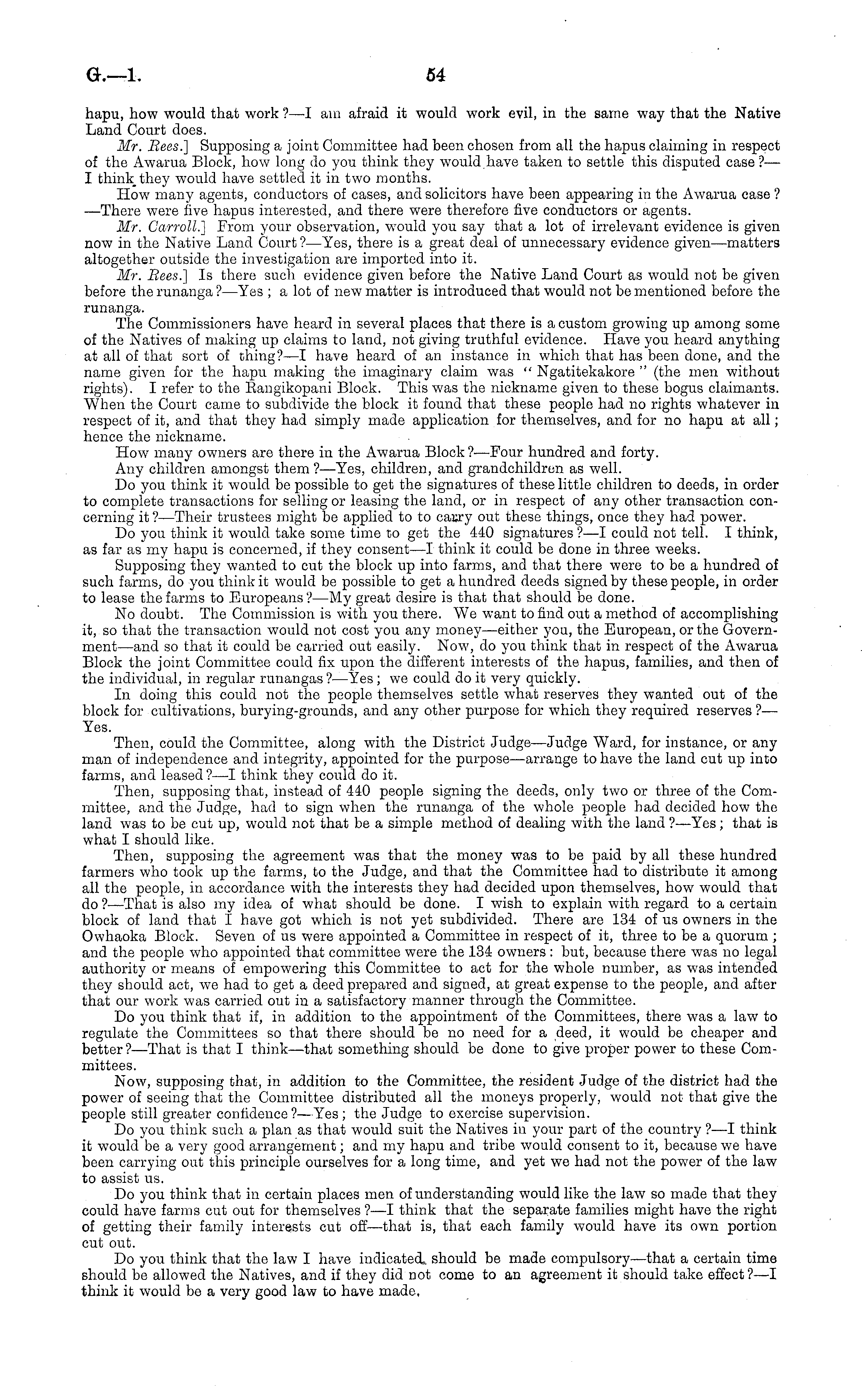 hapu, how would that work ? —I am afraid it would work evil, in the same way that the Native Land Court does. Mr. Bees.] Supposing a joint Committee had been chosen from all the hapus claiming in respect of the Awarua Block, how long do you think they would have taken to settle this disputed case ?— I think they would have settled it in two months. How many agents, conductors of cases, and solicitors have been appearing in the Awarua case ? —There were five hapus interested, and there were therefore five conductors or agents. Mr. Carroll.] From your observation, w rould you say that a lot of irrelevant evidence is given now in the Native Land Court ?—Yes, there is a great deal of unnecessary evidence given—matters altogether outside the investigation are imported into it. Mr. Bees.] Is there such evidence given before the Native Land Court as would not be given before the runanga ? —Yes ; a lot of new matter is introduced that would not be mentioned before the runanga. The Commissioners have heard in several places that there is a custom growing up among some of the Natives of making up claims to land, not giving truthful eAidence. Have you heard anything at all of that sort of thing?—l have heard of an instance in which that has been done, and the name given for the hapu making the imaginary claim was " Ngatitekakore " (the men without rights). I refer to the Bangikopani Block. This was the nickname given to these bogus claimants. When the Court came to subdivide the block it found that these people had no rights whatever in respect of it, and that they had simply made application for themselves, and for no hapu at all; hence the nickname. Hoav many owners are there in the Awarua Block ?■—Four hundred and forty. Any children amongst them?—Yes, children, and grandchildren as well. Do you think it would be possible to get the signatures of these little children to deeds, in order to complete transactions for selling or leasing the land, or in respect of any other transaction concerning it ?—Their trustees might be applied to to carry out these things, once they had power. Do you think it would take some time to get the 410 signatures ?—I could not tell. I think, as far as my hapu is concerned, if they consent —I think it could be done in three weeks. Supposing they wanted to cut the block up into farms, and that there were to be a hundred of such farms, do you think it would be possible to get a hundred deeds signed by these people, in order to lease the farms to Europeans? —My great desire is that that should be done. No doubt. The Commission is with you there. We want to find out a method of accomplishing it, so that the transaction would not cost you any money —either you, the European, or the Government—and so that it could be carried out easily. Now, do you think that in respect of the Awarua Block the joint Committee could fix upon the different interests of the hapus, families, and then of the individual, in regular runangas ?—Yes; we could do it very quickly. In doing this could not the people themselves settle what reserves they wanted out of the block for cultivations, burying-grounds, and any other purpose for which they required reserves ?— Yes. Then, could the Committee, along with the District Judge—Judge Ward, for instance, or any man of independence and integrity, appointed for the purpose—arrange to have the land cut up into farms, and leased ?—I think they could do it. Then, supposing that, instead of 440 people signing the deeds, only two or three of the Committee, and the Judge, had to sign Avhen the runanga of the Avhole people bad decided how the land was to be cut up, would not that be a simple method of dealing with the land ? —Yes; that is what I should like. Then, supposing the agreement was that the money was to be paid by all these hundred farmers who took up the farms, to the Judge, and that the Committee had to distribute it among all the people, in accordance with the interests they had decided upon themselves, how would that do ?—That is also my idea of what should be done. I wish to explain with regard to a certain block of land that I have got which is not yet subdivided. There are 134 of us owners in the Owhaoka Block. Seven of us were appointed a Committee in respect of it, three to be a quorum ; and the people avlio appointed that committee were the 134 owners : but, because there was no legal authority or means of empowering this Committee to act for the whole number, as was intended thoy should act, we had to get a deed prepared and signed, at great expense to the people, and after that our work was carried out in a satisfactory manner through the Committee. Do you think that if, in addition to the appointment of the Committees, there was a laAv to regulate the Committees so that there should be no need for a deed, it Avould be cheaper and better?—That is that I think—that something should be done to give proper power to these Committees. Now, supposing that, in addition to the Committee, the resident Judge of the district had the power of seeing that the Committee distributed all the moneys properly, Avould not that give the people still greater confidence?—Yes; the Judge to exercise supervision. Do you think such a plan as that would suit the Natives in your part of the country ? —I think it would be a very good arrangement; and my hapu and tribe would consent to it, because we have been carrying out this principle ourselves for a long time, and yet we had not the power of the law to assist us. Do you think that in certain places men of understanding Avould like the law so made that they could have farms cut out for themselves ? —I think that the separate families might have the right of getting their family interests cut off—that is, that each family Avould have its own portion cut out. Do you think that the law I have indicated should be made compulsory —that a certain time should be all