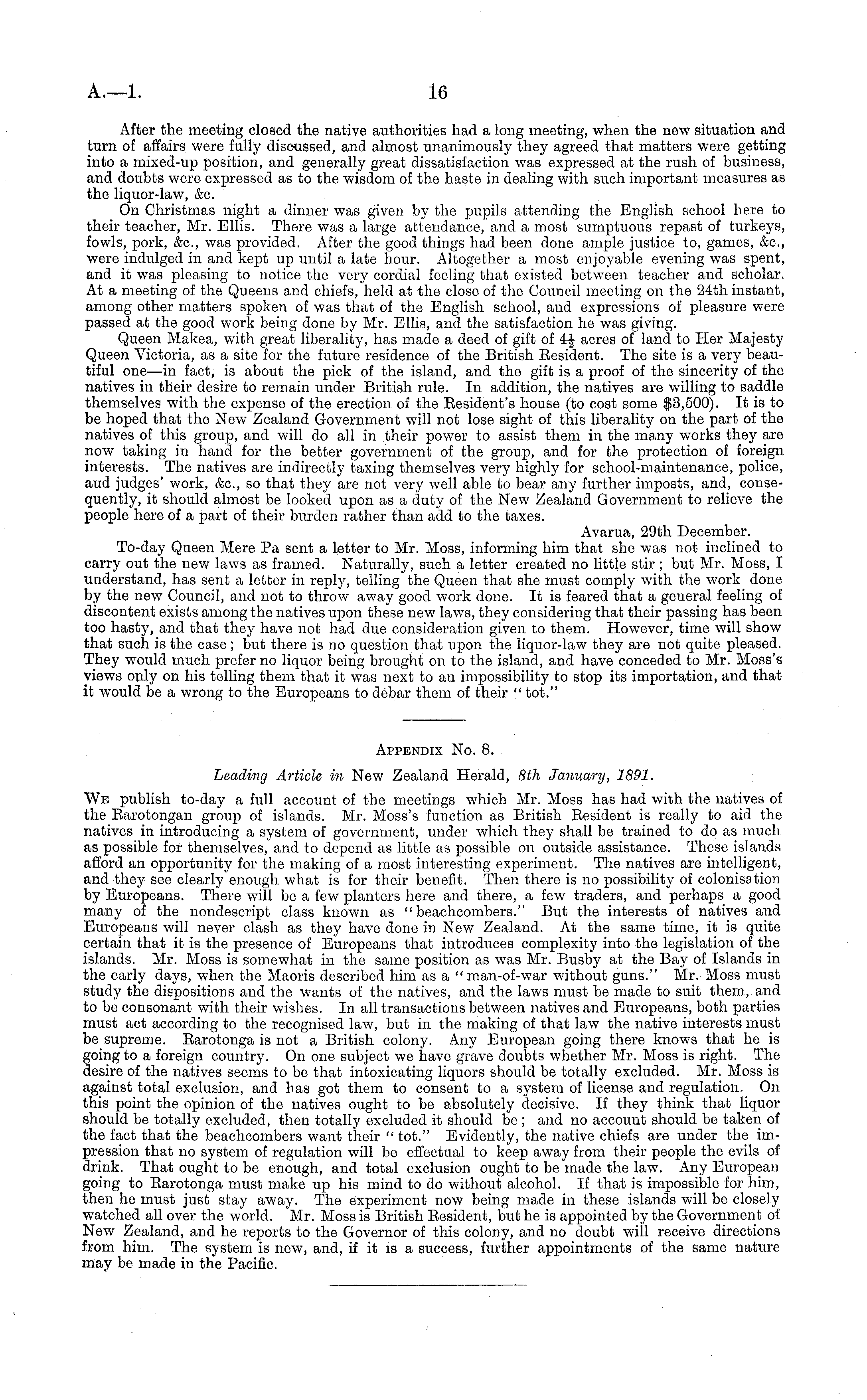 Appendix No. 8. Leading Article in New Zealand Herald, Bth January, 1891. We publish to-day a full account of the meetings which Mr. Moss has had with the natives of the Rarotongan group of islands. Mr. Moss's function as British Resident is really to aid the natives in introducing a system of government, under which they shall be trained to do as much as possible for themselves, and to depend as little as possible on outside assistance. These islands afford an opportunity for the making of a most interesting experiment. The natives are intelligent, and they see clearly enough what is for their benefit. Then there is no possibility of colonisation by Europeans. There will be a few planters here and there, a few traders, and perhaps a good many of the nondescript class known as "beachcombers." But the interests of natives and Europeans will never clash as they have done in New Zealand. At the same time, it is quite certain that it is the presence of Europeans that introduces complexity into the legislation of the islands. Mr. Moss is somewhat in the same position as was Mr. Busby at the Bay of Islands in the early days, when the Maoris described him as a " man-of-war without guns." Mr. Moss must study the dispositions and the wants of the natives, and the laws must be made to suit them, and to be consonant with their wishes. In all transactions between natives and Europeans, both parties must act according to the recognised law, but in the making of that law the native interests must be supreme. Earotonga is not a British colony. Any European going there knows that he is going to a foreign country. On one subject we have grave doubts whether Mr. Moss is right. The desire of the natives seems to be that intoxicating liquors should be totally excluded. Mr. Moss is against total exclusion, and has got them to consent to a system of license and regulation. On this point the opinion of the natives ought to be absolutely decisive. If they think that liquor should be totally excluded, then totally excluded it should be; and no account should be taken of the fact that the beachcombers want their " tot." Evidently, the native chiefs are under the impression that no system of regulation will be effectual to keep away from their people the evils of drink. That ought to be enough, and total exclusion ought to be made the law. Any European going to Earotonga must make up his mind to do without alcohol. If that is impossible for him, then he must just stay away. The experiment now being made in these islands will be closely watched all over the world. Mr. Moss is British Eesident, but he is appointed by the Government of New Zealand, and he reports to the Governor of this colony, and no doubt will receive directions from him. The system is new, and, if it is a success, further appointments of the same nature may be made in the Pacific.