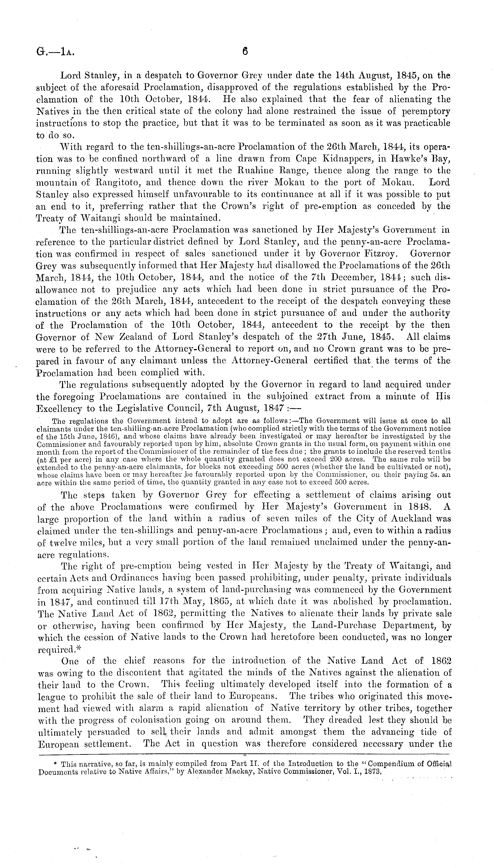 Lord Stanley, in a despatch to Governor Grey under date the 14th August, 1845, on the subject of the aforesaid Proclamation, disapproved of the regulations established by the Proclamation of the 10th October, 1844. He also explained that the fear of alienating the Natives in the then critical state of the colony had alone restrained the issue of peremptory instructions to stop the practice, but that it was to be terminated as soon as it was practicable to do so. With regard to the ten-shillings-an-acre Proclamation of the 26th March, 1844, its operation was to be confined northward of a line drawn from Cape Kidnappers, in Hawke's Bay, running slightly westward until it met the Ruahine Range, thence along the range to the mountain of Rangitoto, and thence down the river Mokau to the port of Mokau. Lord Stanley also expressed himself unfavourable to its continuance at all if it was possible to put an end to it, preferring rather that the Crown's right of pre-emption as conceded by the Treaty of Waitangi should be maintained. The ten-shillings-an-acre Proclamation was sanctioned by Her Majesty's Government in reference to the particular district defined by Lord Stanley, and the penny-an-acre Proclamation was confirmed in respect of sales sanctioned under it by Governor Fitzroy. Governor Grey was subsequently informed that Her Majesty had disallowed the Proclamations of the 26th March, 1844, the 10th October, 1844, and the notice of the 7th December, 1844; such disallowance not to prejudice any acts which had been done in strict pursuance of the Proclamation of the 26th March, 1844, antecedent to the receipt of the despatch conveying these instructions or any acts which had been done in strict pursuance of and under the authority of the Proclamation of the 10th October, 1.844, antecedent to the receipt by the then Governor of New Zealand of Lord Stanley's despatch of the 27th June, 1845. All claims were to be referred to the Attorney-General to report on, and no Crown grant was to be prepared in favour of any claimant unless the Attorney-General certified that the terms of the Proclamation had been complied with. The regulations subsequently adopted by the Governor in regard to land acquired under the foregoing Proclamations are contained in the subjoined extract from a minute of His Excellency to the Legislative Council, 7th August, 1847 : —- The regulations the Government intend to adopt are as follows: —The Government will issue at once to all claimants under the ten-shilling-an-acre Proclamation (who complied strictly with the terms of the Government notice of the 15th June, 1846), and whose claims have already been investigated or may hereafter be investigated by the Commissioner and favourably reported upon by him, absolute Crown grants in the usual form, on payment within one month from the report of the Commissioner of the remainder of the fees due ; the grants to include the reserved tenths (at £1 per acre) in any case where the whole quantity granted does not exceed 200 acres. The same rule will be extended to the penny-an-acre claimants, for blocks not exceeding 500 acres (whether the land be cultivated or not), whose claims have been or may hereafter .be favourably reported upon by the Commissioner, on their paying ss. an acre within the same period of time, the quantity granted in any case not to exceed 500 acres. The steps taken by Governor Grey for effecting a settlement of claims arising out of the above Proclamations were confirmed by Her Majesty's Government in 1848. A large proportion of the land within a radius of seven miles of the City of Auckland was claimed under the ten-shillings and penny-an-acre Proclamations ; and, even to within a radius of twelve miles, but a very small portion of the land remained unclaimed under the penny-an-acre regulations. The right of pre-emption being vested in Her Majesty by the Treaty of Waitangi, and certain Acts and Ordinances having been passed prohibiting, under penalty, private individuals from acquiring Native lands, a system of land-purchasing was commenced by the Government in 1847, and continued till 17th May, 1865, at which date it was abolished by proclamation. The Native Land Act of 1862, permitting the Natives to alienate their lands by private sale or otherwise, having been confirmed by Her Majesty, tlie Land-Purchase Department, by which the cession of Native lands to the Crown had heretofore been conducted, was no longer required.* One of the chief reasons for the introduction of the Native Land Act of 1862 was owing to the discontent that agitated the minds of the Natives against the alienation of their laud to the Crown. This feeling ultimately developed itself into the formation of a league to prohibit the sale of their land to Europeans. The tribes who originated this movement had viewed with alarm a rapid alienation of Native territory by other tribes, together with the progress of colonisation going on around them. They dreaded lest they should be ultimately persuaded to sell, their lands and admit amongst them the advancing tide of European settlement. The Act in question was therefore considered necessary under the