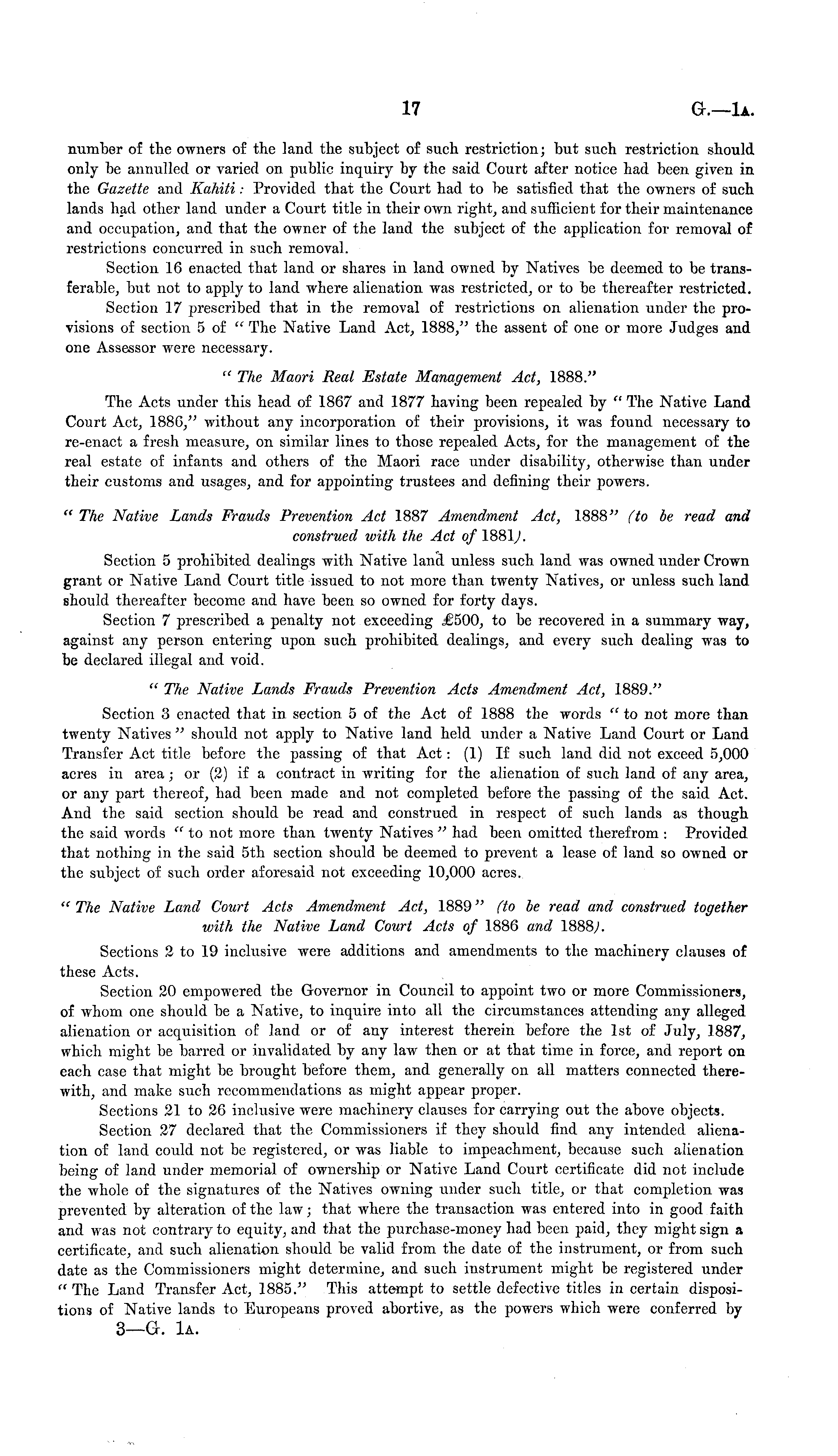 number of the owners of the land the subject of such restriction; but such restriction should only be annulled or varied on public inquiry by the said Court after notice had been given in the Gazette and Kahiti: Provided that the Court had to be satisfied that the owners of such lands had other land under a Court title in their own right, and sufficient for their maintenance and occupation, and that the owner of the land the subject of the application for removal of restrictions concurred in such removal. Section 16 enacted that land or shares in land owned by Natives be deemed to be transferable, but not to apply to land where alienation was restricted, or to be thereafter restricted. Section 17 prescribed that in the removal of restrictions on alienation under the provisions of section 5 of " The Native Land Act, 1888," the assent of one or more Judges and one Assessor were necessary. " The Maori Real Estate Management Act, 1888." The Acts under this head of 1867 and 1877 having been repealed by " The Native Land Court Act, 1886," without any incorporation of their provisions, it was found necessary to re-enact a fresh measure, on similar lines to those repealed Acts, for the management of the real estate of infants and others of the Maori race under disability, otherwise than under their customs and usages, and for appointing trustees and defining their powers. " The Native Lands Frauds Prevention Act 1887 Amendment Act, 1888" (to be read and construed with the Act of 1881;. Section 5 prohibited dealings with Native land unless such land was owned under Crown grant or Native Land Court title issued to not more than twenty Natives, or unless such land should thereafter become and have been so owned for forty days. Section 7 prescribed a penalty not exceeding .2500, to be recovered in a summary way, against any person entering upon such prohibited dealings, and every such dealing was to be declared illegal and void. " The Native Lands Frauds Prevention Acts Amendment Act, 1889." Section 3 enacted that in section 5 of the Act of 1888 the words "to not more than twenty Natives " should not apply to Native land held under a Native Land Court or Land Transfer Act title before the passing of that Act: (1) If such land did not exceed 5,000 acres in area ; or (2) if a contract in writing for the alienation of such land of any area, or any part thereof, had been made and not completed before the passing of the said Act. And the said section should be read and construed in respect of such lands as though the said words "to not more than twenty Natives " had been omitted therefrom : Provided that nothing in the said sth section should be deemed to prevent a lease of land so owned or the subject of such order aforesaid not exceeding 10,000 acres. " The Native Land Court Acts Amendment Act, 1889" (to be read and construed together with the Native Land Court Acts of 1886 and 1888;. Sections 2 to 19 inclusive were additions and amendments to the machinery clauses of these Acts. Section 20 empowered the Governor in Council to appoint two or more Commissioners, of whom one should be a Native, to inquire into all the circumstances attending any alleged alienation or acquisition of land or of any interest therein before the Ist of July, 1887, which might be barred or invalidated by any law then or at that time in force, and report on each case that might be brought before them, and generally on all matters connected therewith, and make such recommendations as might appear proper. Sections 21 to 26 inclusive were machinery clauses for carrying out the above objects. Section 27 declared that the Commissioners if they should find any intended alienation of land could not be registered, or was liable to impeachment, because such alienation being of land under memorial of ownership or Native Land Court certificate did not include the whole of the signatures of the Natives owning under such title, or that completion was prevented by alteration of the law; that where the transaction was entered into in good faith and was not contrary to equity, and that the purchase-money had been paid, they might sign a certificate, and such alienation should be valid from the date of the instrument, or from such date as the Commissioners might determine, and such instrument might be registered under " The Land Transfer Act, 1885." This attempt to settle defective titles in certain dispositions of Native lands to Europeans proved abortive, as the powers which were conferred by 3—G. la.