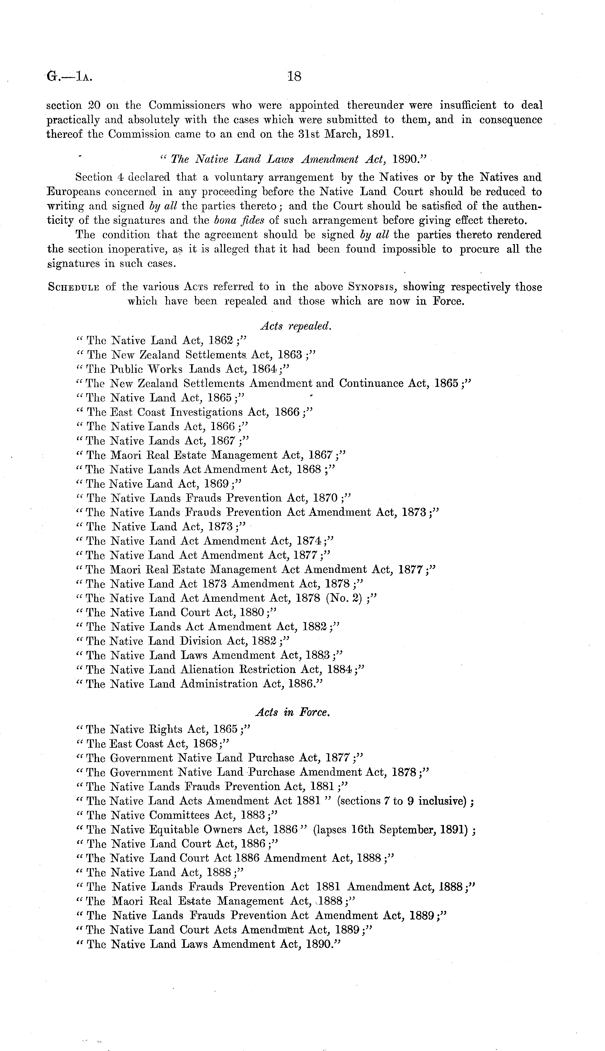section 20 on the Commissioners who were appointed thereunder were insufficient to deal practically and absolutely with the cases which were submitted to them, and in consequence thereof the Commission came to an end on the 31st March, 1891. " The Native Land Laws Amendment Act, 1890." Section 4 declared that a voluntary arrangement by the Natives or by the Natives and Europeans concerned in any proceeding before the Native Land Court should be reduced to writing and signed by all the parties thereto; and the Court should be satisfied of the authenticity of the signatures and the bona fides of such arrangement before giving effect thereto. The condition that the agreement should be signed by all the parties thereto rendered the section inoperative, as it is alleged that it had been found impossible to procure all the signatures in such cases. Schedule of the various Acts referred to in the above Synopsis, showing respectively those which, have been repealed and those which are now in Force. Acts repealed. " The Native Land Act, 1862 ;" " The New Zealand Settlements, Act, 1863 ;" " The Public Works Lands Act, 1864;" " The New Zealand Settlements Amendment and Continuance Act, 1865;" "The Native Land Act, 1865;" " The East Coast Investigations Act, 1866 ;" " The Native Lands Act, 1866 ;" " The Native Lands Act, 1887 ;" " The Maori Real Estate Management Act, 1867;" " The Native Lands Act Amendment Act, 1868 ;" " The Native Land Act, 1869;" " The Native Lands Frauds Prevention Act, 1870;" "The Native Lands Frauds Prevention Act Amendment Act, 1873;" " The Native Land Act, 1873;" " The Native Land Act Amendment Act, 1874;" "The Native Land Act Amendment Act, 1877;" " The Maori Real Estate Management Act Amendment Act, 1877;" " The Native Land Act 1873 Amendment Act, 1878 ;" " The Native Land Act Amendment Act, 1878 (No. 2) ;" " The Native Land Court Act, 1880;" " The Native Lands Act Amendment Act, 1882 ;" " The Native Land Division Act, 1882 ;" " The Native Land Laws Amendment Act, 1883;" " The Native Land Alienation Restriction Act, 1884 •" " The Native Land Administration Act, 1886." Acts in Force. " The Native Rights Act, 1865;" " The East Coast Act, 1868;" "The Government Native Land Purchase Act, 1877;" " The Government Native Land Purchase Amendment Act, 1878 ;" " The Native Lands Frauds Prevention Act, 1881;" " The Native Land Acts Amendment Act 1881 " (sections 7to 9 inclusive) ; " The Native Committees Act, 1883;" "The Native Equitable Owners Act, 1886" (lapses 16th September, 1891) . " The Native Land Court Act, 1886;" " The Native Land Court Act 1886 Amendment Act, 1888 ;" " The Native Land Act, 1888;" " The Native Lands Frauds Prevention Act 1881 Amendment Act, 1888 ;" "The Maori Real Estate Management Act, J888;" " The Native Lands Frauds Prevention Act Amendment Act, 1889 ;'" " The Native Land Court Acts Amendment Act, 1889;" *' The Native Land Laws Amendment Act, 1890."