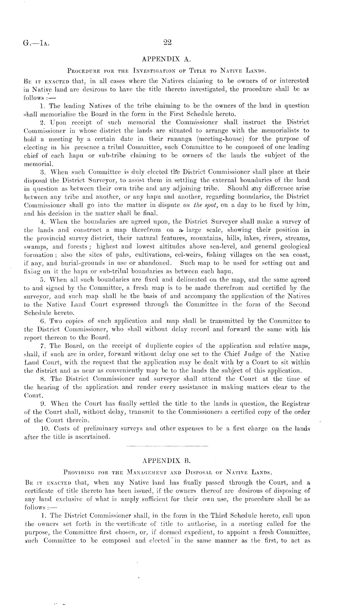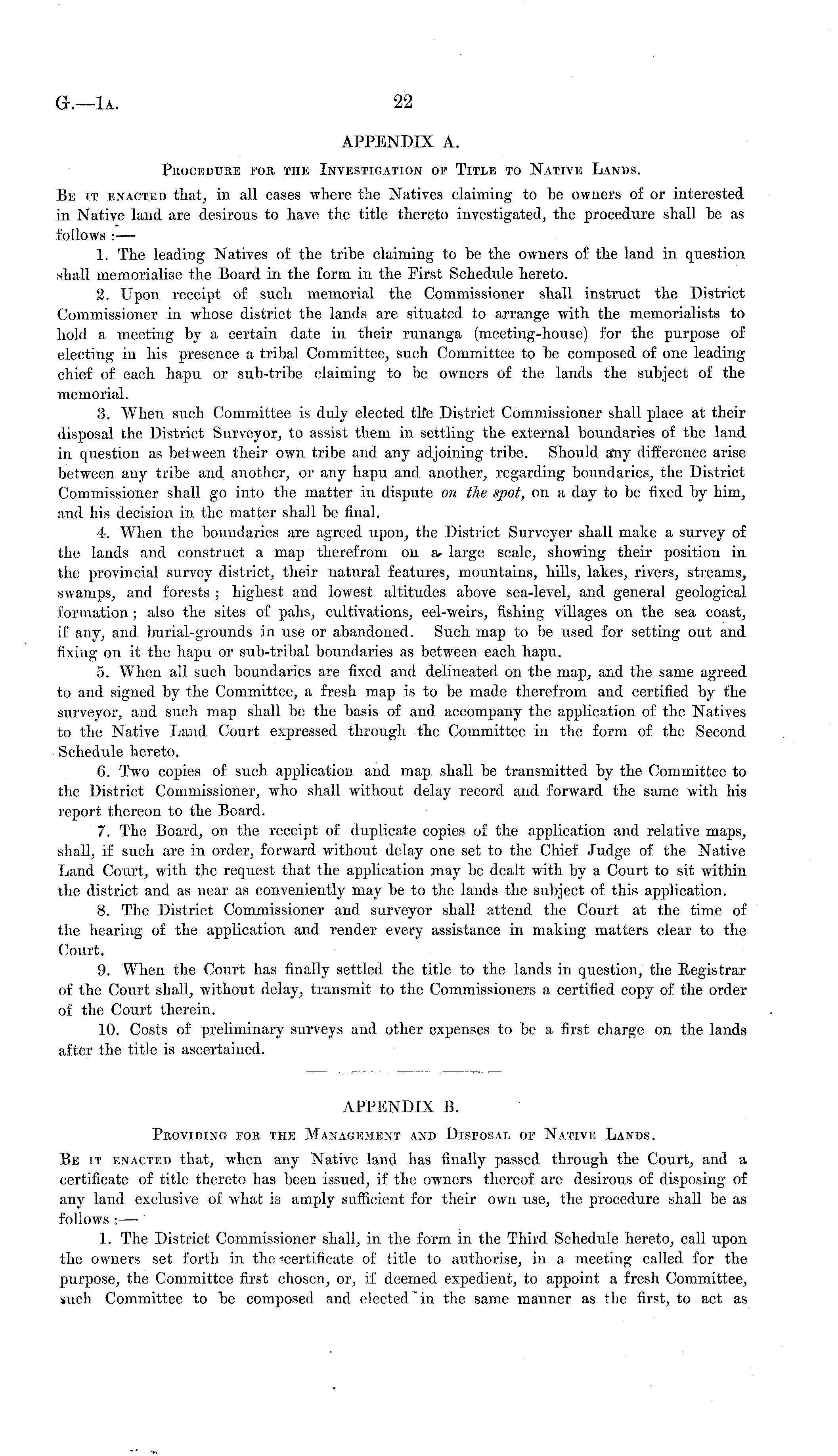 APPENDIX A. Procedure for the Investigation of Title to Native Lands. Be it enacted that, in all cases where the Natives claiming to be owners of or interested in Native land are desirous to have the title thereto investigated, the procedure shall be as follows :— 1. The leading Natives of the tribe claiming to be the owners of the land in question shall memorialise the Board in the form in the First Schedule hereto. 2. Upon receipt of such memorial the Commissioner shall instruct the District Commissioner in whose district the lands are situated to arrange with the memorialists to hold a meeting by a certain date in their runanga (meeting-house) for the purpose of electing in his presence a tribal Committee, such Committee to be composed of one leading chief of each hapu or sub-tribe claiming to be owners of the lands the subject of the memorial. 3. When such Committee is duly elected tile District Commissioner shall place at their disposal the District Surveyor, to assist them in settling the external boundaries of the land in question as between their own tribe and any adjoining tribe. Should any difference arise between any tribe and another, or any hapu and another, regarding boundaries, the District Commissioner shall go into the matter in dispute on. the spot, on a day to be fixed by him, and his decision in the matter shall be final. 4. When the boundaries arc agreed upon, the District Surveyer shall make a survey of the lands and construct a map therefrom on a- large scale, showing their position in the provincial survey district, their natural features, mountains, hills, lakes, rivers, streams, swamps, and forests ; highest and lowest altitudes above sea-level, and general geological formation; also the sites of pahs, cultivations, eel-weirs, fishing villages on the sea coast, if any, and burial-grounds in use or abandoned. Such map to be used for setting out and fixing on it the hapu or sub-tribal boundaries as between each hapu. 5. When all such boundaries are fixed and delineated on the map, and the same agreed to and signed by the Committee, a fresh map is to be made therefrom and certified by the surveyor, and such map shall be the basis of and accompany the application of the Natives to the Native Land Court expressed through the Committee in the form of the Second Schedule hereto. 6. Two copies of such application and map shall be transmitted by the Committee to the District Commissioner, who shall without delay record and forward the same with his report thereon to the Board. 7. The Board, on the receipt of duplicate copies of the application and relative maps, shall, if such are in order, forward without delay one set to the Chief Judge of the Native Land Court, with the request that the application may be dealt with by a Court to sit within the district and as near as conveniently may be to the lands the subject of this application. 8. The District Commissioner and surveyor shall attend the Court at the time of the hearing of the application and render every assistance in making matters clear to the Court. 9. When the Court has finally settled the title to the lands in question, the Registrar of the Court shall, without delay, transmit to the Commissioners a certified copy of the order of the Court therein. 10. Costs of preliminary surveys and other expenses to be a first charge on the lands after the title is ascertained.