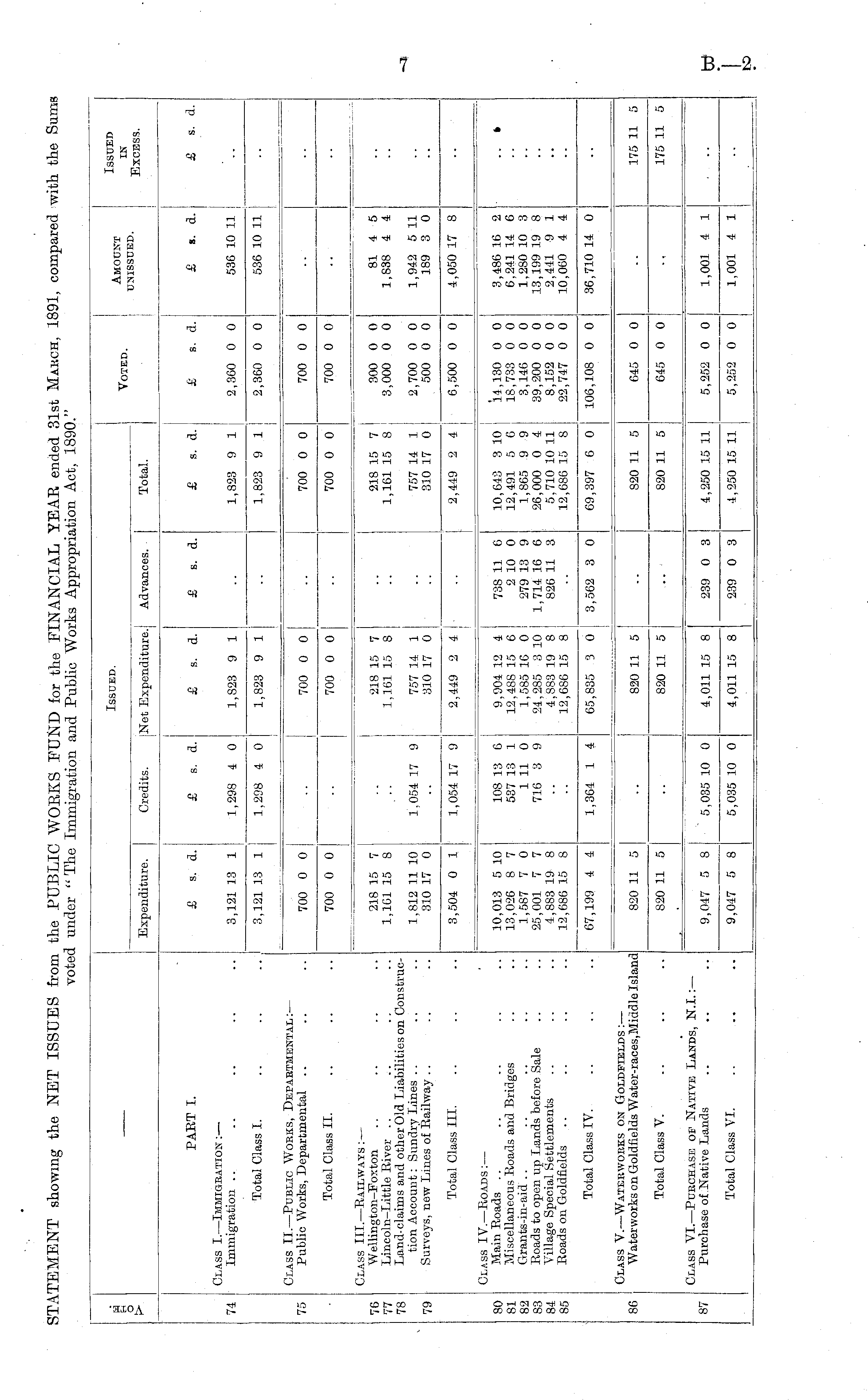 STATEMENT showing the NET ISSUES from the PUBLIC WORKS FUND for the FINANCIAL YEAR ended 31st March, 1891, compared with the Sums voted under "The Immigration and Public Works Appropriation Act, 1890."