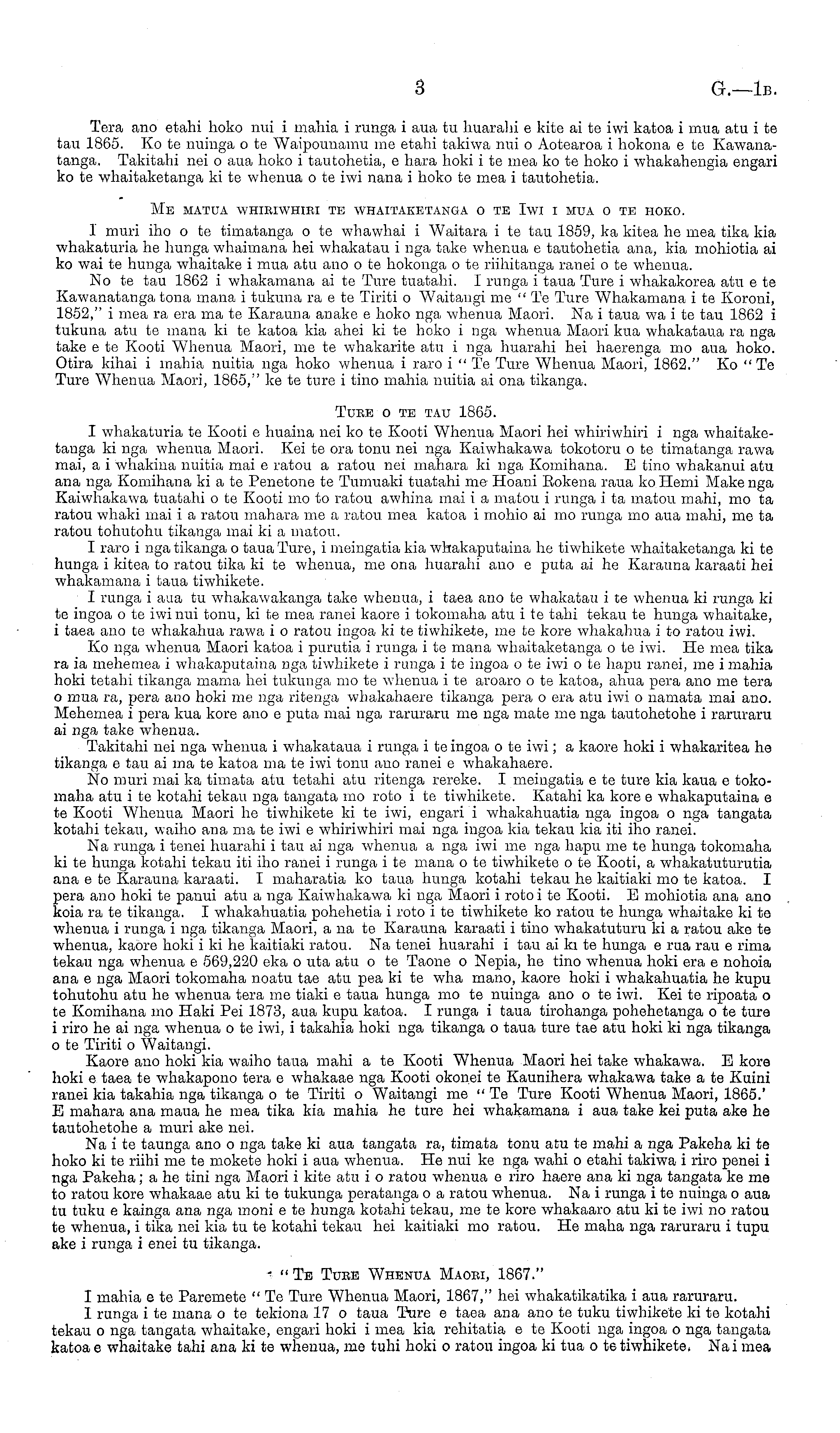Tera ano etahi hoko nui i mahia i runga i aua tv huarahi c kite ai te iwi katoa i mua atu i te tau 1865. Ko te nuinga ote Waipounamu me etahi takiwa nui o Aotearoa i hokona etc Kawanatanga. Takitahi nei o aua hoko i tautohetia, c hara hoki ite mea ko te hoko i whakahengia engari ko te whaitaketanga kite whenua o te iwi nana i hoko te mea i tautohetia. Me matua whieiwhibi tb whaitaketanga o te Iwi i mua o te hoko. 1 muri iho o te timatanga o te whawhai i Waitara i te tau 1859, ka kitea he mea tika Ida whakaturia he hunga whaimana hei whakatau i nga take whenua c tautohetia ana, kia mohiotia ai ko wai te hunga whaitake i mua atu ano o te hokonga o te riihitanga ranei o te whenua. No te tau 1862 i whakamana ai te Ture tuatahi. I runga i taua Ture i whakakorea atu etc Kawanatanga tona mana i tukuna ra c te Tiriti o Waitangi me " Te Ture Whakamana i te Koroni, 1852," i mea ra era ma te Karauna anake c hoko nga whenua Maori. Na i taua wa ite tau 1862 i tukuna atu te mana kite katoa kia ahei kite hoko i nga whenua Maori kua whakataua ra nga take c te Kooti Whenua Maori, me te whakarite atu i nga huarahi hei haerenga mo aua hoko. Otira kihai i mahia nuitia nga hoko whenua i raro i" Te Ture Whenua Maori, 1862." Ko "Te Ture Whenua Maori, 1865," ke te ture i tino mahia nuitia ai ona tikanga. TUEE O TE TAU 1865. I whakaturia te Kooti c huaina nei ko te Kooti Whenua Maori hei whiriwhiri i nga whaitaketanga ki nga whenua Maori. Kei te ora tonu nei nga Kaiwhakawa tokotoru ote timatanga rawa mai, a i whakina nuitia mai c ratou a ratou nei mahara ki nga Komihana. E tino whakanui atu ana nga Komihana ki a te Penetone te Tumuaki tuatahi me Hoani Eokena raua koHemi Make nga Kaiwhakawa tuatahi o te Kooti mo to ratou awhina mai i a matou i runga i ta matou mahi, mo ta ratou whaki mai i a ratou mahara me a ratou mea katoa i mohio ai mo runga mo aua mahi, me ta ratou tohutohu tikanga mai ki a matou. I raro i nga tikanga o taua Ture, i nieingatia kia whakapufcama he tiwhikete whaitaketanga ki to hunga i kitea to ratou tika kite whenua, me ona huarahi ano c puta ai he Karauna karaati hei whakamana i taua tiwhikete. I runga i aua tv whakawakanga take whenua, i taea ano te whakatau i te whenua ki runga ki te ingoa o te iwi nui tonu, kite mea ranei kaore i tokomaha atu i te tahi tekau te hunga whaitake, i taea ano te whakah.ua rawa i o ratou ingoa kite tiwhikete, me te kore whakah.ua i to ratou iwi. Ko nga whenua Maori katoa i purutia i runga ite mana whaitaketanga ote iwi. He mea tika ra ia mehemea i whakaputaina nga tiwhikete i runga i te ingoa o te iwi o te hapu ranei, me i mahia hoki tetahi tikanga mama hei tukunga mo te whenua i te aroaro o te katoa, ah.ua pera ano me tora 0 mua ra, pera ano hoki me nga ritenga whakahaere tikanga pera o era atu iwi o namata mai ano. Mehemea i pera kua kore ano c puta mai nga raruraru me nga mate me nga tautohetohe i raruraru ai nga take whenua. Takitahi nei nga whenua i whakataua i runga ite ingoa ote iwi; a kaore hoki i whakaritea he tikanga c tau ai ma te katoa ma te iwi tonu ano ranei c whakahaere. No muri mai ka timata atu tetahi atu ritenga rereke. I meingatia etc ture kia kaua c tokomaha atu ite kotahi tekau nga tangata mo roto i te tiwhikete. Katahi ka kore c whakaputaina c te Kooti Whenua Maori he tiwhikete kite iwi, engari i whakahuatia nga ingoa o nga tangata kotahi tekau, waiho ana ma te iwi c whiriwhiri mai nga ingoa kia tekau kia iti iho ranei. Na runga i tenei huarahi i tau ai nga whenua a nga iwi me nga hapu me te hunga tokomaha kite hunga kotahi tekau iti iho ranei i runga i te mana o te tiwhikete o te Kooti, a whakatuturutia ana etc Karauna karaati. I maharatia ko taua hunga kotahi tekau he kaitiaki mo te katoa. I pera ano hoki te panui atu a nga Kaiwhakawa ki nga Maori i roto ite Kooti. E mohiotia ana ano koia rate tikanga. I whakahuatia pohehetia i roto ite tiwhikete ko ratou te hunga whaitake kite whenua i runga i nga tikanga Maori, a na te Karauna karaati i tino whakatuturu ki a ratou ake te whenua, kaore hoki iki he kaitiaki ratou. Na tenei huarahi i tau ai kite hunga c rua rave rima tekau nga whenua c 569,220 eka o uta atu o te Taone o Nepia, he tino whenua hoki era c nohoia ana c nga Maori tokomaha noatu tae atu pea kite wha mano, kaore hoki i whakahuatia he kupu tohutohu atu he whenua tera me tiaki c taua hunga mo te nuinga ano o te iwi. Kei te ripoata o te Komihana mo Haki Pei 1873, aua kupu katoa. I runga i taua tirohanga pohehetanga ote ture 1 riro he ai nga whenua o te iwi, i takahia hoki nga tikanga o taua ture tae atu hoki ki nga tikanga o te Tiriti o Waitangi. Kaore ano hoki kia waiho taua mahi a te Kooti Whenua Maori hei take whakawa. E kore hoki c taea te whakapono tera c whakaae nga Kooti okon.ei te Kaunihera whakawa take a te Kuini ranei kia takahia nga tikanga o te Tiriti o Waitangi me " Te Ture Kooti Whenua Maori, 1865.' E mahara ana maua he mea tika kia mahia he ture hei whakamana i aua take kei puta ake he tautohetohe a muri ake nei. Na i te taunga ano o nga take ki aua tangata ra, timata tonu atu te mahi a nga Pakeha kite hoko kite riihi me te mokete hoki i aua whenua. He nui ke nga wahi o etahi takiwa i riro penei i nga Pakeha; ahe tini nga Maori i kite atu i o ratou whenua c riro haere ana ki nga tangata ke me to ratou kore whakaae atu kite tukunga peratanga o a ratou whenua. Na i runga ite nuinga o aua tv tuku c kainga ana nga moni c te hunga kotahi tekau, me te kore whakaaro atu kite iwi no ratou te whenua, i tika nei kia tv te kotahi tekau hei kaitiaki mo ratou. He maha nga raruraru i tupu ake i runga i enei tv tikanga. • "Te Tuee Whenua Maoei, 1867." I mahia c te Paremete " Te Ture Whenua Maori, 1867," hei whakatikatika i aua raruraru. I runga i te mana o te tekiona 17 o taua Ture c taea ana ano te tuku tiwhikete kite kotahi tekau o nga tangata whaitako, engari hoki i mea kia rehitatia c te Kooti nga ingoa o nga tangata katoa c whaitake tahi ana kite whenua, me tuhi hoki o ratou ingoa ki tua ote tiwhikete. Nai mea