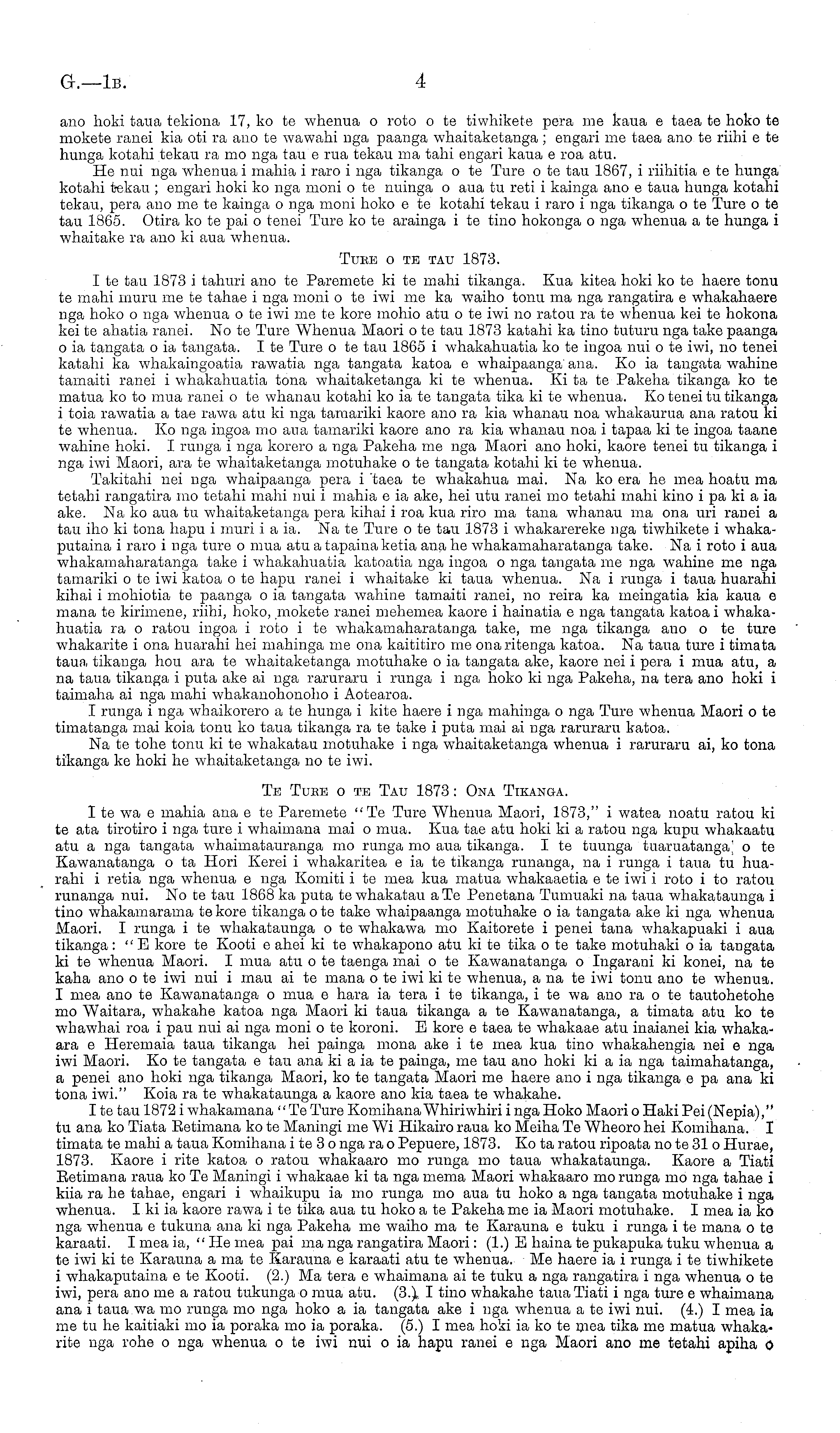 ano hoki taua tekiona 17, ko te whenua o roto o te tiwhikete pera me kaua c taea te hoko te mokete ranei kia oti ra ano te wawahi nga paanga whaitaketanga ; engari me taea ano te ruin c te hunga kotahi tekau ra mo nga tau c rua tekau ma tahi engari kaua c roa atu. He nui nga whenua i mahia i raro i nga tikanga o te Ture o te tau 1867, i riihitia c te hunga kotahi tekau ; engari hoki ko nga moni o te nuinga o aua tv reti i kainga ano c taua hunga kotahi tekau, pera ano me te kainga o nga moni hoko c te kotahi tekau i raro i nga tikanga o te Ture o te tau 1865. Otira ko te pai o tenei Ture ko te arainga ite tino hokonga o nga whenua ate hunga i whaitake ra ano ki aua whenua. Tube o te tau 1873. Ite tau 1873 i tahuri ano te Paremete kite mahi tikanga. Kua kitea hoki ko te haere tonu te mahi inuru me te tahae i nga moni o te iwi me ka waiho tonu ma nga rangatira c whakahaere nga hoko o nga whenua o te iwi me te kore mohio atu o te iwi no ratou rate whenua kei te hokona kei te ahatia ranei. No te Ture Whenua Maori ote tau 1873 katahi ka tino tuturu nga take paanga oia tangata oia tangata. Ite Ture o te tau 1865 i whakahuatia ko te ingoa nui ote iwi, no tenei katahi ka whakaingoatia rawatia nga tangata katoa c whaipaanga ana. Ko ia tangata wahine tamaiti ranei i whakahuatia tona whaitaketanga kite whenua. Xi ta te Pakeha tikanga ko te matua ko to mua ranei o te whanau kotahi ko ia te tangata tika kite whenua. Ko tenei tv tikanga 1 toia rawatia a tae rawa atu ki nga tamariki kaore ano ra kia whanau noa whakaurua ana ratou ki te whenua. Ko nga ingoa mo ana tamariki kaore ano ra kia whanau noa i tapaa kite ingoa taane wahine hoki. I runga i nga korero a nga Pakeha me nga Maori ano hoki, kaore tenei tv tikanga i nga iwi Maori, ara te whaitaketanga motuhake o te tangata kotahi kite whenua. Takitahi nei nga whaipaanga pera i taea te whakahua mai. Na ko era he mea hoatu ma tetahi rangatira mo tetahi mahi nui i mahia c ia ake, hei utu ranei mo tetahi mahi kino i pa ki a ia ake. Na ko aua tv whaitaketanga pera kihai i roa kua riro ma tana whanau ma ona uri ranei a tau iho ki tona hapu i muri i a ia. Na te Ture ote tau 1873 i whakarereke nga tiwhikete i whakaputaina i raro i nga ture o mua atu a tapaina ketia ana he whakamaharatanga take. Na i roto i aua whakamaharatanga take i whakahuatia katoatia nga ingoa o nga tangata me nga wahine me nga tamariki ote iwi katoa ote hapu ranei i whaitake ki taua whenua. Na i runga i taua huarahi kihai i mohiotia te paanga o ia tangata wahine tamaiti ranei, no reira ka meingatia kia kaua c mana te kirimene, riihi, hoko, mokete ranei mehemea kaore i hainatia c nga tangata katoa i whakahuatia ra o ratou ingoa i roto i te whakamaharatanga take, me nga tikanga ano o te ture whakarite i ona huarahi hei mahinga me ona kaititiro me onaritenga katoa. Na taua ture i timata taua tikanga hou ara te whaitaketanga motuhake o ia tangata ake, kaore nei i pera i mua atu, a na taua tikanga i puta ake ai nga raruraru i runga i nga hoko ki nga Pakeha, na tera ano hoki i taimaha ai nga mahi whakanohonoho i Aotearoa. I runga i nga whaikorero a te hunga i kite haere i nga mahinga o nga Ture whenua Maori o te timatanga mai koia tonu ko taua tikanga rate take i puta mai ai nga raruraru katoa. Na te tohe tonu kite whakatau motuhake i nga whaitaketanga whenua i raruraru ai, ko tona tikanga ke hoki he whaitaketanga no te iwi. Te Tube o te Tau 1873: Ona Tikanga. I te wa c mahia ana c te Paremete "Te Ture Whenua Maori, 1873," i watea noatu ratou ki te ata tirotiro i nga ture i whaimana mai o mua. Kua tae atu hoki ki a ratou nga kupu whakaatu atu a nga tangata whaimatauranga mo runga mo aua tikanga. I te tuunga tuaruatanga' o te Kawanatanga o ta Hori Kerei i whakaritea c ia te tikanga runanga, na i runga i taua tv huarahi i retia nga whenua c nga Komiti i te mea kua matua whakaaetia c te iwi i roto i to ratou runanga nui. No te tau 1868 ka puta te whakatau aTe Penetana Tumuaki na taua whakataunga i tino whakamarama tekore tikanga ote take whaipaanga motuhake o ia tangata ake ki nga whenua Maori. I runga i te whakataunga ote whakawa mo Kaitorete i penei tana whakapuaki i aua tikanga: " E kore te Kooti c ahei kite whakapono atu kite tika ote take motuhaki oia tangata kite whenua Maori. I mua atu ote taenga mai o te Kawanatanga o Ingarani ki konei, na te kaha ano o te iwi nui i mau ai te mana o te iwi kite whenua, a na te iwi tonu ano te whenua. I mea ano te Kawanatanga o mua c hara ia tera i te tikanga, i te wa ano ra o te tautohetohe mo Waitara, whakahe katoa nga Maori ki taua tikanga a te Kawanatanga, a timata atu ko te whawhai roa i pau nui ai nga moni ote koroni. B kore c taea te whakaae atu inaianei kia whakaara c Heremaia taua tikanga hei painga mona ake i te mea kua tino whakahengia nei c nga iwi Maori. Ko te tangata c tau ana ki aia te painga, me tau ano hoki ki aia nga taimahatanga, a penei ano hoki nga tikanga Maori, ko te tangata Maori me haere ano i nga tikanga c pa ana ki tona iwi." Koia rate whakataunga a kaore ano kia taea te whakahe. I te tau 1872 i whakamana " Te Ture Komihana Whiriwhiri i nga Hoko Maori o Haki Pei (Nepia)," tv ana ko Tiata Retimana ko te Maningi me Wi Hikairo raua ko Meiha Te Wheoro hei Komihana. I timata te mahi a taua Komihana ite 3 o nga ra o Pepuere, 1873. Ko ta ratou ripoata no te 31 o Hurae, 1873. Kaore i rite katoa o ratou whakaaro mo runga mo taua whakataunga. Kaore a Tiati Eetimana raua ko Te Maningi i whakaae ki ta nga mema Maori whakaaro mo runga mo nga tahae i kiia ra he tahae, engari i whaikupu ia mo runga mo aua tv hoko a nga tangata motuhake i nga whenua. Iki ia kaore rawa ite tika aua tv hoko ate Pakeha me ia Maori motuhake. I mea ia ko nga whenua c tukuna ana ki nga Pakeha me waiho ma te Karauna c tuku i runga i te mana o te karaati. I mea ia, "He mea pai ma nga rangatira Maori : (1.) E hamate pukapuka tuku whenua a te iwi kite Karauna ama te Karauna c karaati atu te whenua. Me haere ia i runga ite tiwhikete i whakaputaina etc Kooti. (2.) Ma tera c