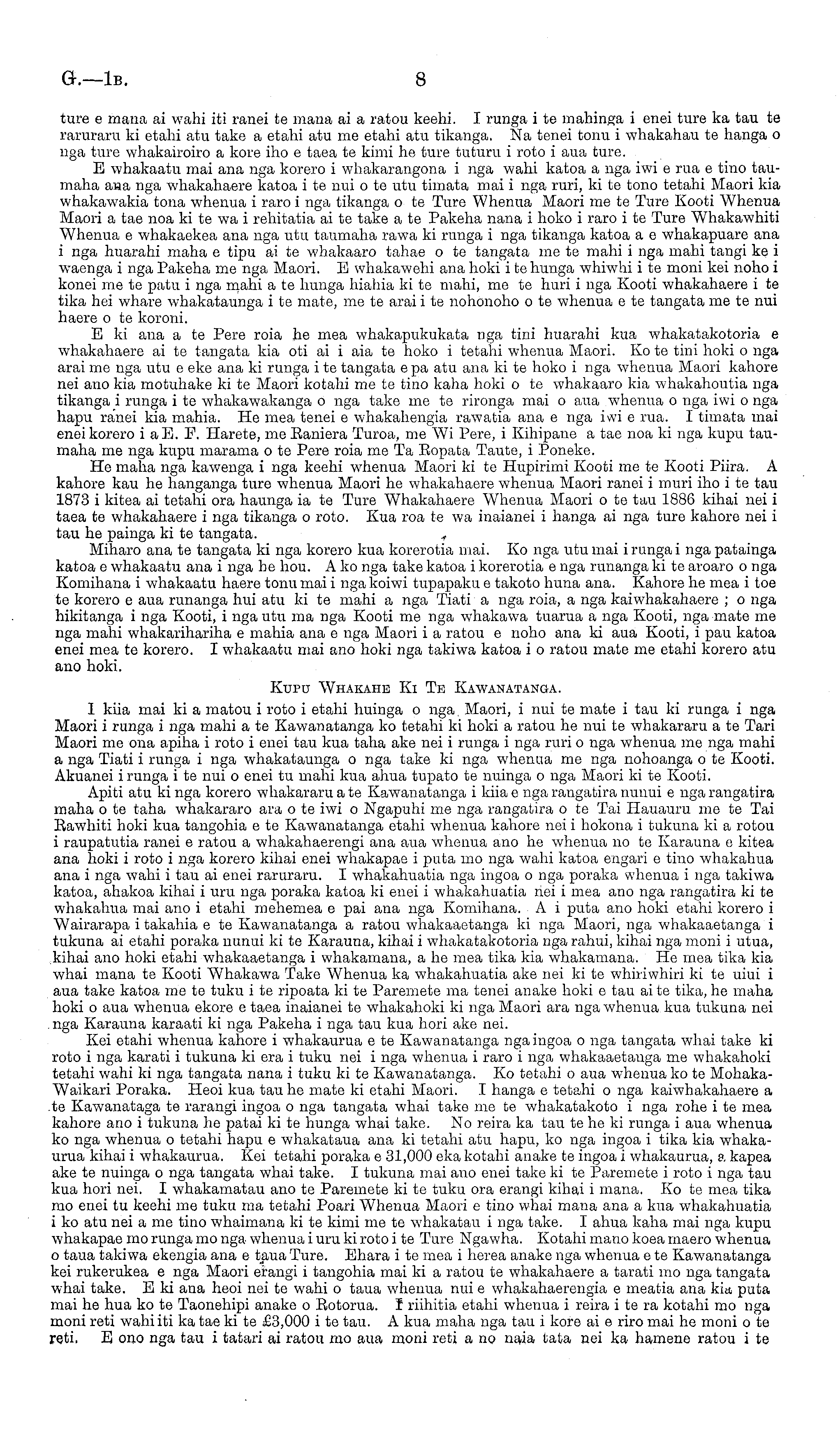ture c mana ai wahi iti ranei te mana ai a ratou keehi. I runga ite mahinga i enei ture ka tau te raruraru ki etahi atu take a etahi atu me etahi atu tikanga. Na tenei tonu i whakahau te hanga o nga ture whakairoiro a kore iho c taea te kimi he ture tuturu i roto i aua ture. E whakaatu mai ana nga korero i whakarangona i nga wahi katoa a nga iwi c rua c tino tauniaha ana nga whakahaere katoa i te nui o te utu tiniata mai i nga ruri, kite tono tetahi Maori kia whakawakia tona whenua i raro i nga tikanga o te Ture Whenua Maori me te Ture Kooti Whenua Maori a tae noa kite wa i rehitatia ai te take a te Pakeha nana i hoko i raro i te Ture Whakawhiti Whenua c whakaekea ana nga utu taumaha rawa ki runga i nga tikanga katoa a c whakapuare ana i nga huarahi maha c tipu ai te whakaaro tahae o te tangata me te mahi i nga mahi tangi ke i waenga i nga Pakeha me nga Maori. E whakaweHi ana hoki i tehunga whiwhi ite moni kei noho i konei me te patu i nga mahi a te hunga hiahia kite mahi, me te huri i nga Kooti whakahaere i te tika hei whare whakataunga i te mate, me te arai i te nohonoho o te whenua c te tangata me te nui haere o te koroni. E ki ana a te Pere roia he mea whakapukukata nga tini huarahi kua whakatakotoria c whakahaere ai te tangata kia oti ai i aia te hoko i tetahi whenua Maori. Ko te tini hoki o nga arai me nga utu c eke ana ki runga i te tangata epa atu ana kite hoko i nga whenua Maori kahore nei ano kia motuhake kite Maori kotahi me te tino kaha hoki o te whakaaro kia whakahoutia nga tikanga i runga i te whakawakanga o nga take me te rironga mai o aua whenua o nga iwi o nga hapu ranei kia mahia. He mea tenei c whakahengia rawatia ana c nga iwi c rua. I timata mai enei korero i aE. P. Harete, me Eaniera Turoa, me Wi Pere, i Kihipane a tae noa ki nga kupu taumaha me nga kupu marama o te Pere roia me Ta Eopata Taute, i Poneke. He maha nga kawenga i nga keehi whenua Maori kite Hupirimi Kooti me te Kooti Piira. A kahore kau he hanganga ture whenua Maori he whakahaere whenua Maori ranei i muri iho i te tau 1873 i kitea ai tetahi ora haunga ia te Ture Whakahaere Whenua Maori o te tau 1886 kihai nei i taea te whakahaere i nga tikanga o roto. Kua roa te wa inaianei i hanga ai nga ture kahore nei i tau he painga kite tangata. Miharo ana te tangata ki nga korero kua korerotia mai. Ko nga utu mai i runga i ngapatainga katoa c whakaatu ana i nga he hou. Ako nga take katoa i korerotia c nga runanga kite aroaro o nga Komihana i whakaatu haere tonu mai i nga koiwi tupapaku c takoto huna ana. Kahore he mea i toe te korero c aua runanga hui atu kite mahi a nga Tiati a nga roia, a nga kaiwhakahaere ; o nga hikitanga i nga Kooti, i nga utu ma nga Kooti me nga whakawa tuarua a nga Kooti, nga mate me nga mahi whakarihariha c mahia ana c nga Maori i a ratou c noho ana ki aua Kooti, i pau katoa enei mea te korero. I whakaatu mai ano hoki nga takiwa katoa i o ratou mate me etahi korero atu ano hoki. Kupu Whakahb Xi Te Kawanatanga. 1 kiia mai ki a matou i roto i etahi huinga o nga Maori, i nui te mate i tau ki runga i nga Maori i runga i nga mahi a te Kawanatanga ko tetahi ki hoki a ratou he nui te whakararu a te Tari Maori me ona apiha i roto i enei tau kua taha ake nei i runga i nga ruri o nga whenua me nga mahi a nga Tiati i runga i nga whakataunga o nga take ki nga whenua me nga nohoanga o te Kooti. Akuanei i runga i te nui o enei tv mahi kua ahua tupato te nuinga o nga Maori kite Kooti. Apiti atu ki nga korero whakararu a te Kawanatanga i kiia c nga rangatira nunui c nga rangatira maha o te taha whakararo ara o te iwi o Ngapuhi me nga rangatira o te Tai Hauauru me te Tai Eawhiti hoki kua tangohia c te Kawanatanga etahi whenua kahore nei i hokona i tukuna ki a rotou i raupatutia ranei c ratou a whakahaerengi ana aua whenua ano he whenua no te Karauna c kitea ana hoki i roto i nga korero kihai enei whakapae i puta mo nga wahi katoa engari c tino whakahua ana i nga wahi i tau ai enei raruraru. I whakahuatia nga ingoa o nga poraka whenua i nga takiwa katoa, ahakoa kihai i uru nga poraka katoa ki enei i whakahuatia nei i mea ano nga rangatira kite whakahua mai ano i etahi mehemea c pai ana nga Komihana. A i puta ano hoki etahi korero i Wairarapa i takahia c te Kawanatanga a ratou whakaaetanga ki nga Maori, nga whakaaetanga i tukuna ai etahi poraka nunui kite Karauna, kihai i whakatakotoria ngarahui, kihai nga moni i utua, kihai ano hoki etahi whakaaetanga i whakamana, ahe mea tika kia whakamana. He mea tika kia whai mana te Kooti Whakawa Take Whenua ka whakahuatia ake nei kite whiriwhiri kite uiui i aua take katoa me te tuku i te ripoata kite Paremete ma tenei anake hoki c tau aite tika, he maha hoki o aua whenua ekore c taea inaianei te whakahoki ki nga Maori ara nga whenua kua tukuna nei nga Karauna karaati ki nga Pakeha i nga tau kua hori ake nei. Kei etahi whenua kahore i whakaurua c te Kawanatanga nga ingoa o nga tangata whai take ki roto i nga karati i tukuna ki era i tuku nei i nga whenua i raro i nga whakaaetanga me whakahoki tetahi wahi ki nga tangata nana i tuku kite Kawanatanga. Ko tetahi o aua whenua ko te MohakaWaikari Poraka. Heoi kua tau he mate ki etahi Maori. I hanga c tetahi o nga kaiwhakahaere a te Kawanataga te rarangi ingoa o nga tangata whai take me te whakatakoto i nga rohe i te mea kahore ano i tukuna he patai kite hunga whai take. No reira ka tau te he ki runga i aua whenua ko nga whenua o tetahi hapu c whakataua ana ki tetahi atu hapu, ko nga ingoa i tika kia whakaurua kihai i whakaurua. Kei tetahi poraka c 31,000 eka kotahi anake te ingoa i whakaurua, a kapea ake te nuinga o nga tangata whai take. I tukuna mai ano enei take kite Paremete i roto i nga tau kua hori nei. I whakamatau ano te Paremete kite tuku ora erangi kihai i mana. Ko te mea tika mo enei tv keehi me tuku ma tetahi Poari Whenua Maori c tino whai mana ana a kua whakahuatia iko atu nei ame tino whaimana kite kimi me te whakatau i nga take. I ahua kaha mai nga kupu whakapae mo runga mo nga whenua i uru ki roto ite Ture Ng