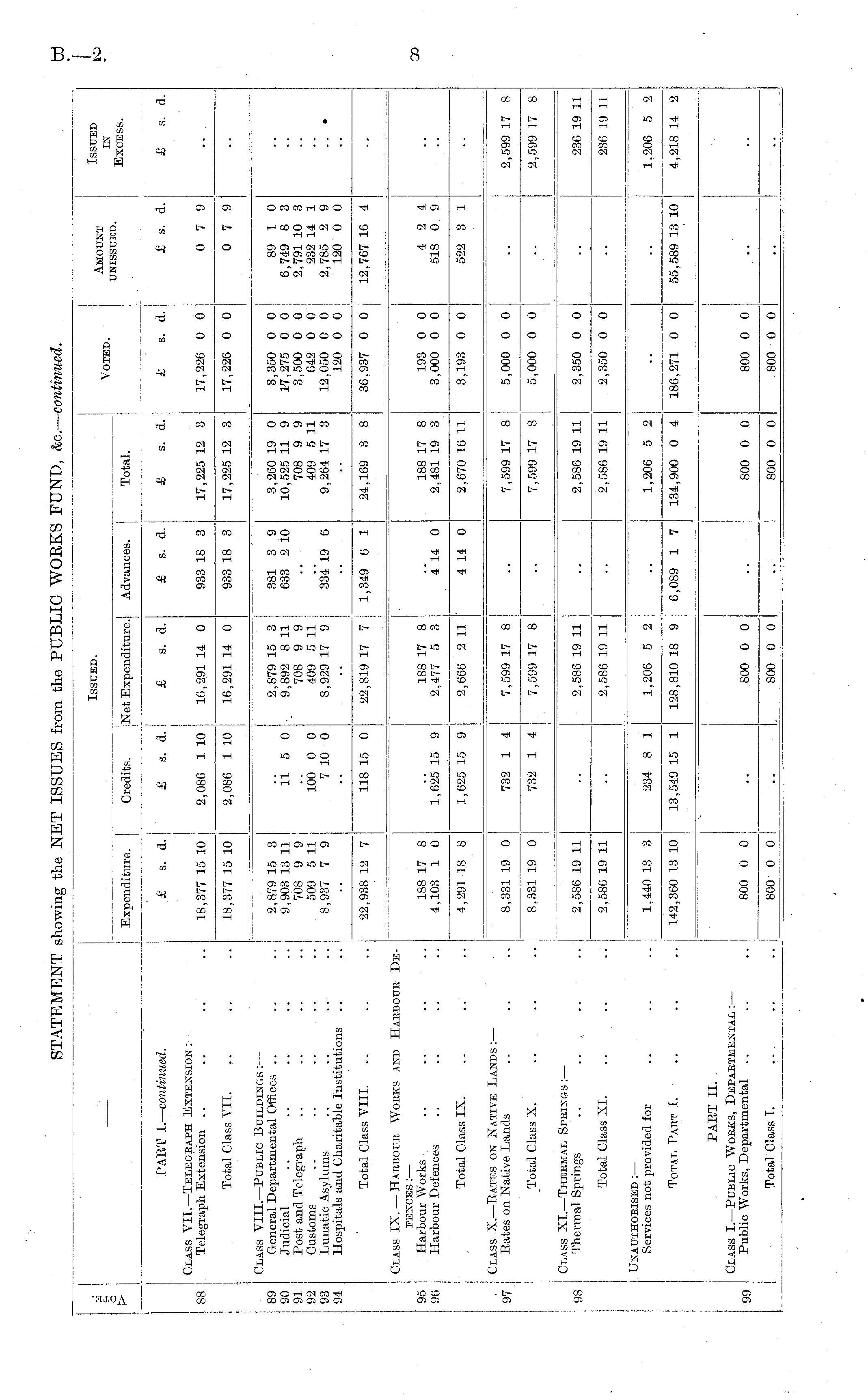 I tH o r> Issued. Voted. i ! Amount unissued. Issued in Excess. Expenditure. Credits. Net Expenditure. Advances. Total. PART I.— continued. £ s. d. | £ s. d. £ s. d. £ £ s. d. £ s. d. £ s. d. £ s. d. £ s. d. £ s. d. Class VII. —Telegraph Extension :— Telegraph Extension .. .. .. .. ] 18,377 15 10 j 2 18,377 15 10 2,086 1 10 !,086 16,291 14 0 933 18 3 17,225 12 3 17,226 0 0 0 7 9 88 Total Class VII. .. .. .. I 1 18,377 15 10 2 18,377 15 10 2,086 1 10 !,086 16,291 14 0 933 18 3 17,225 12 3 17,226 0 0 0 7 9 89 90 91 92 93 94 Class VIII. —Public Buildings :— General Departmental Offices .. .. Judicial .. .. .. .. .. j Post ana Telegraph .. .. .. Customs .. .. .. .. .. | Lunatic Asylums .. .. .. .. j Hospitals and Charitable Institutions .. I 2,879 15 3 9,903 13 11 708 9 9 509 5 11 8,937 7 9 2,879 15 3 9,903 13 11 708 9 9 509 5 11 8,937 7 9 11 100 7 11 5 0 100 0 0 7 10 0 2,879 15 3 9,892 8 11 708 9 9 409 5 11 8,929 17 9 381 3 9 633 2 10 3,260 19 0 10,525 11 9 708 9 9 409 5 11 9,264 17 3 3,350 0 0 17,275 0 0 3,500 0 0 642 0 0 12,050 0 0 120 0 0 89 1 0 6,749 8 3 2,791 10 3 232 14 1 2,785 2 9 120 0 0 334' 19 6 Total Class VIII. .. .. .. i 22,938 12 7 22,938 12 7 118 118 15 0 22,819 17 7 : 1,349 6 1 24,169 3 8 36,937 0 0 12,767 16 4 Class IX. — Harbour Works and Harbour De- _ _ I 95 96 fences :— Harbour Works Harbour Defences 1S8 17 S 4,103 10 1 1S8 17 8 4,103 1 0 1,625 15 9 L,625 188 17 8 2,477 5 3 4 - 14 0 188 17 8 2,481 19 3 193 0 0 3,000 0 0 4 2 4 518 0 9 Total Class IX. 4,291 18 8 1 L,625 2,670 16 11 3,193 0 0 522 3 1 4,291 18 8 1,625 15 9 2,666 2 11 4 14 0 _ I 97 Class X. —Rates on Native Lands :— Rates on Native Lands .. .. 8,331 19 0 8,331 19 0 732 732 1 4 7,599 17 8 7,599 17 8 5,000 0 0 2,599 17 8 Total Class X. 8,331 19 0 8,331 19 0 732 732 1 4 7,599 17 8 7,599 17 8 5,000 0 0 2,599 17 8 Class XL —Thermal Springs :— Thermal Springs .. .. .. .. j 2,5S6 19 11 98 2,586 19 11 2,586 19 11 2,586 19 11 2,350 0 0 236 19 11 Total Class XI. .. .. .. j i 2,586 19 11 2,586 19 11 2,586 19 11 2,586 19 11 2,350 0 0 236 19 11 Unauthorised :— Services not provided for 1,440 13 3 234 1,440 13 3 234 8 1 1,206 5 2 1,206 5 2 •• •• 1,206 5 2 I i Total Part I. .. .. .. j 1 142,300 13 10 -42,360 13 10 13 13,549 15 1 J, 549 128,810 18 9 6,089 1 7 134,900 0 4 186,271 0 0 55,589 13 10 j 4,218 14 2 I _ PART II. l Class I.—Public Works, Departmental :— Public Works, Departmental .. .. 800 0 0 | 800 0 0 99 800 0 0 800 0 0 Total Class I. .. .. .. | 800-0 0 | 800 0 0 i 800 0 0 800 0 0 800 0 0