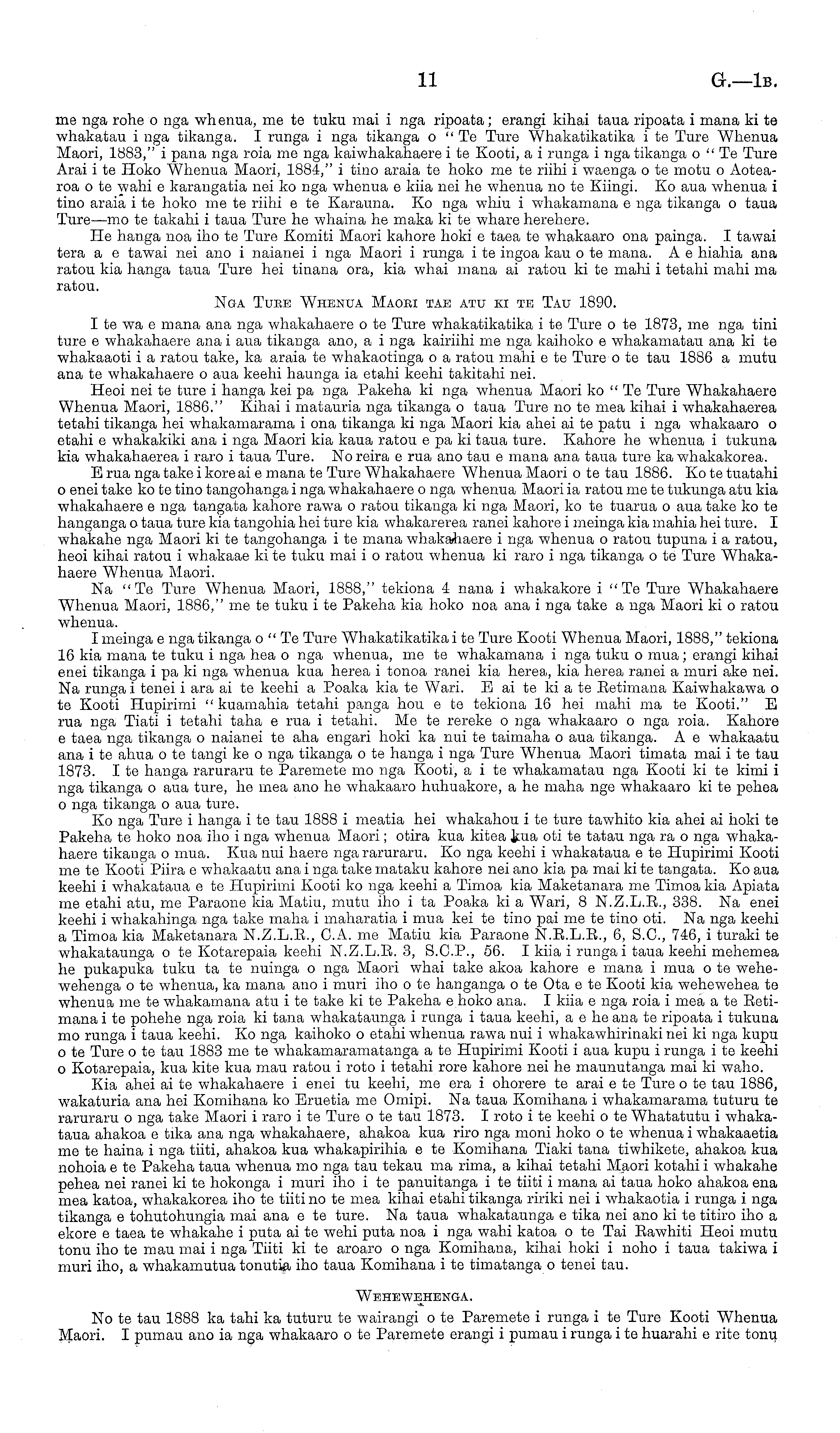 me nga rohe o nga whenua, me te tuku mai i nga ripoata; erangi kihai taua ripoata i mana kite whakatau i nga tikanga. I runga i nga tikanga o "Te Ture Whakatikatika ite Ture Whenua Maori, 1883," i pana nga roia me nga kaiwhakahaere i te Kooti, a i runga i nga tikanga o " Te Ture Arai i te Hoko Whenua Maori, 1884," i tino araia te hoko me te riihi i waenga o te motu o Aotearoa ote wahi c karangatia nei ko nga whenua c kiia nei he whenua no te Kiingi. Ko aua whenua i tino araia ite hoko me te riihi c te Karauna. Ko nga whiu i whakamana c nga tikanga o taua Ture —mo te takahi i taua Ture he whaina he maka kite whare herehere. He hanga noa iho te Ture Komiti Maori kahore hoki c taea te whakaaro ona painga. I tawai tera a c tawai nei ano i naianei i nga Maori i runga ite ingoa kau ote mana. A c hiahia ana ratou kia hanga taua Ture hei tinana ora, kia whai mana ai ratou kite mahi i tetahi mahi ma ratou. Nga Tube Whenua Maori tab atu kite Tau 1890. I te wa c mana ana nga whakahaere o te Ture whakatikatika i te Ture o te 1878, me nga tini ture c whakahaero ana i aua tikanga ano, a i nga kairiihi me nga kaihoko c whakamatau ana kite whakaaoti i a ratou take, ka araia te whakaotinga o a ratou mahi c te Ture o te tau 1886 a mutu ana te whakahaere o aua keehi haunga ia etahi keehi takitahi nei. Heoi nei te ture i hanga kei pa nga Pakeha ki nga whenua Maori ko " Te Ture Whakahaere Whenua Maori, 1886." Kihai i matauria nga tikanga o taua Ture no te mea kihai i whakahaerea tetahi tikanga hei whakamarama i ona tikanga ki nga Maori kia ahei ai te patu i nga whakaaro o etahi c whakakiki ana i nga Maori kia kaua ratou epa ki taua ture. Kahore he whenua i ttiktma kia whakahaerea i raro i taua Ture. No reira c rua ano tau c mana ana taua ture ka whakakorea. E rua nga take i koreai c mana te Ture Whakahaere Whenua Maori ote tau 1886. Ko te tuatahi o enei take ko te tino tangohanga i nga whakahaere o nga whenua Maori ia ratou me te tukunga atu kia whakahaere c nga tangata kahore rawa o ratou tikanga ki nga Maori, ko te tuarua o aua take ko te hanganga o taua ture kia tangohia hei ture kia whakarerea ranei kahore i meinga kia mahia hei ture. I whakahe nga Maori kite tangohanga i te mana whakahaere i nga whenua o ratou tupuna i a ratou, heoi kihai ratou i whakaae kite tuku mai i o ratou whenua ki raro i nga tikanga o te Ture Whakahaere Whenua Maori. Na "Te Ture Whenua Maori, 1888," tekiona 4 nana i whakakore i " Te Ture Whakahaere Whenua Maori, 1886," me te tuku i te Pakeha kia hoko noa ana i nga take a nga Maori ki o ratou whenua. I meinga c nga tikanga o " Te Ture Whakatikatika i te Ture Kooti Whenua Maori, 1888," tekiona 16 kia mana te tuku i nga hea o nga whenua, me te whakamana i nga tuku o mua; erangi kihai enei tikanga i pa ki nga whenua kua heroa i tonoa ranei kia herea, kia herea ranei a muri ake nei. Na runga i tenei i ara ai te keehi a Poaka kia te Wari. B ai te ki ate Eetimana Kaiwhakawa o te Kooti Hupirimi " kuamahia tetahi panga hove te tekiona 16 hei mahi ma te Kooti." E rua nga Tiati i tetahi taha c rua i tetahi. Me te rereke o nga whakaaro o nga roia. Kahore c taea nga tikanga o naianei te aha engari hoki ka nui te taimaha o aua tikanga. A c whakaatu ana i te ahua o te tangi ke o nga tikanga o te hanga i nga Ture Whenua Maori timata mai i te tau 1873. Ite hanga raruraru te Paremete mo nga Kooti, a i te whakamatau nga Kooti kite kimi i nga tikanga o aua ture, he mea ano he whakaaro huhuakore, a he maha nge whakaaro kite pehea o nga tikanga o aua ture. Ko nga Ture i hanga i te tau 1888 i meatia hei whakahou i te ture tawhito kia ahei ai hoki te Pakeha te hoko noa iho i nga whenua Maori; otira kua kitea iaia oti te tatau nga ra o nga whakahaere tikanga o mua. Kua nui haere nga raruraru. Ko nga keehi i whakataua etc Hupirimi Kooti me te Kooti Piira c whakaatu ana i nga take mataku kahore nei ano kia pa mai kite tangata. Ko aua keehi i whakataua c te Hupirimi Kooti ko nga keehi a Timoa kia Maketanara me Timoa kia Apiata me etahi atu, me Paraone kia Matiu, mutu iho i ta Poaka ki a Wari, 8 N.Z.L.E., 338. Na enei keehi i whakahinga nga take maha i maharatia i mua kei te tino pai me te tino oti. Na nga keehi a Timoa kia Maketanara N.Z.L.E., C.A. me Matiu kia Paraone N.E.L.E., 6, S.G., 746, i turaki te whakataunga o te Kotarepaia keehi N.Z.L.E. 3, S.G.P., 56. I kiia i runga i taua keehi mehemea he pukapuka tuku ta te nuinga o nga Maori whai take akoa kahore c mana i mua o te wehewehenga o te whenua, ka mana ano i muri iho o te hanganga o te Ota c te Kooti kia wehewehea te whenua me te whakamana atu ite take kite Pakeha c hoko ana. I kiia c nga roia i mea ate Eetimana i te pohehe nga roia ki tana whakataunga i runga i taua keehi, a c he ana te ripoata i tukuna mo runga i taua keehi. Ko nga kaihoko o etahi whenua rawa nui i whakawhirinaki nei ki nga kupu o te Ture o te tau 1883 me te whakamaramatanga a te Hupirimi Kooti i aua kupu i runga i te keehi o Kotarepaia, kua kite kua man ratou i roto i tetahi rore kahore nei he maunutanga mai ki waho. Kia ahei ai te whakahaere i enei tv keehi, me era i ohorere te arai c te Ture o te tau 1886, wakaturia ana hei Komihana ko Eruetia me Omipi. Na taua Komihana i whakamarama tuturu te raruraru o nga take Maori i raro ite Ture ote tau 1873. I roto ite keehi ote Whatatutu i whakataua ahakoa c tika ana nga whakahaere, ahakoa kua riro nga moni hoko o te whenua i whakaaetia me te haina i nga tiiti, ahakoa kua whakapirihia c te Komihana Tiaki tana tiwhikete, ahakoa kua nohoia c te Pakeha taua whenua mo nga tau tekau ma rima, a kihai tetahi Maori kotahi i whakahe pehea nei ranei kite hokonga i muri iho i te panuitanga i te tiiti i mana ai taua hoko ahakoa ena mea katoa, whakakorea iho te tiiti no te mea kihai etahi tikanga ririki nei i whakaotia i runga i nga tikanga c tohutohungia mai ana c te ture. Na taua whakataunga c tika nei ano kite titiro iho a ekore c taea te whakahe i puta ai te wehi puta noa i nga wahi katoa o te Tai Eawhiti Heoi mutu tonu iho te man mai i nga Tii