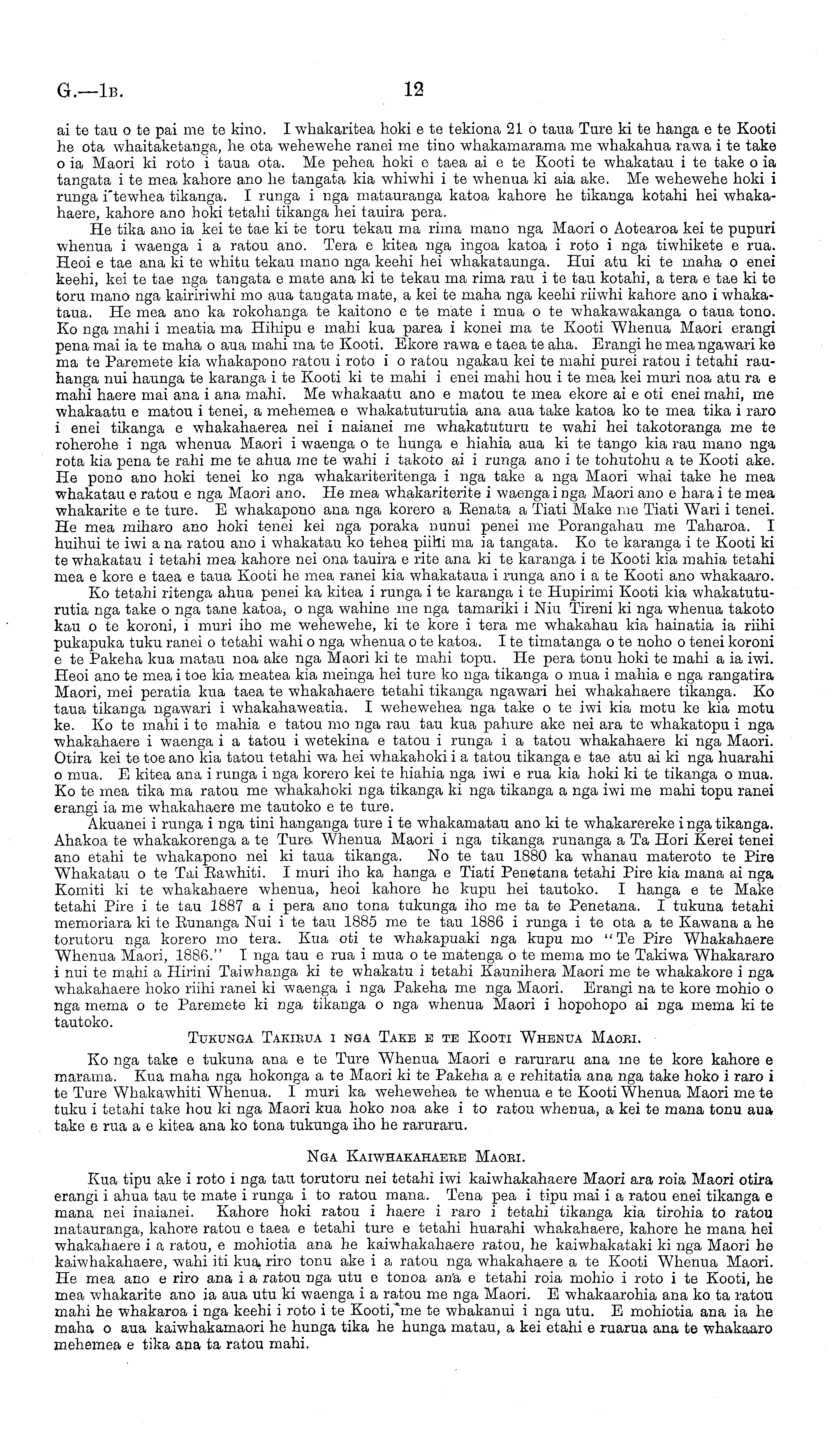 ai te tau ote pai me te kino. I whakaritea hoki etc tekiona 21 o taua Ture kite hanga etc Kooti he ota whaitaketanga, he ota wehewehe ranei me tino whakamarama me whakahua rawa i te take oia Maori ki roto i taua ota. Me pehea hoki c taea ai c te Kooti te whakatau ite take oia tangata ite mea kahore ano he tangata kia whiwhi ite whenua ki aia ake. Me wehewehe hoki i runga i'tewhea tikanga. I runga i nga matauranga katoa kahore he tikanga kotahi hei whakahaere, kahore ano hoki tetahi tikanga hei tauira pera. He tika ano ia kei te tae kite toru tekau ma rima mano nga Maori o Aotearoa kei te pupuri whenua i waenga i a ratou ano. Tera c kitea nga ingoa katoa i roto i nga tiwhikete c rua. Heoi c tae ana kite whitu tekau mano nga keehi hei whakataunga. Hui atu kite rnaha o enei keehi, kei te tae nga tangata c mate ana kite tekau ma rima rau i te tau kotahi, a tera c tae kite toru mano nga kaiririwhi mo aua tangata mate, a kei te maha nga keehi riiwhi kahore ano i whakataua. He mea ano ka rokohanga te kaitono c te mate i mua o te whakawakanga o taua tono. Ko nga inahi i meatia ma Hihipu c mahi kua parea i konei ma te Kooti Whenua Maori erangi pena mai ia te maha o aua mahi ma te Kooti. Ekore rawa c taea te aha. Erangi he mea ngawari ke ma te Paremete kia whakapono ratou i roto i o ratou ngakau kei te mahi purei ratou i tetahi rauhanga nui haunga te karanga i te Kooti kite mahi i enei mahi hou i te mea kei muri noa atu ra c mahi haere mai ana i ana mahi. Me whakaatu ano c matou te mea ekore ai c oti enei mahi, me whakaatu c matou i tenei, a mehemea c whakatuturutia ana aua take katoa ko te mea tika i raro 1 enei tikanga c whakahaerea nei i naianei me whakatutura te wahi hei takotoranga me te roherohe i nga whenua Maori i waenga o te hunga c hiahia aua kite tango kia rau mano nga rota kia pena te rahi me te ahua me te wahi i takoto ai i runga ano i te tohutohu a te Kooti ake. He pono ano hoki tenei ko nga whakariteritenga i nga take a nga Maori whai take he mea whakatau c ratou c nga Maori ano. He mea whakariterite i waenga i nga Maori ano c hara ite mea whakarite etc ture. E whakapono ana nga korero a Eenata a Tiati Make me Tiati Wari i tenei. He mea miharo ano hoki tenei kei nga poraka nunui penei me Porangahau me Taharoa. I huihui te iwi ana ratou ano i whakatau ko tehea piilii ma ia tangata. Ko te karanga ite Kooti ki te whakatau i tetahi mea kahore nei ona tauira c rite ana kite karanga i te Kooti kia mahia tetahi mea c kore c taea c taua Kooti he mea ranei kia whakataua i runga ano i a te Kooti ano whakaaro. Ko tetahi ritenga ahua penei ka kitea i runga i te karanga i te Hupirimi Kooti kia whakatuturutia nga take o nga tane katoa, o nga wahine me nga tamariki i Niu Tireni ki nga whenua takoto kau o te koroni, i muri iho me wehewehe, kite kore i tera me whakahau kia hainatia ia riihi pukapuka tuku ranei o tetahi wahi o nga whenua ote katoa. Ite timatanga ote noho o tenei koroni etc Pakeha kua matau noa ake nga Maori kite mahi topu. He pera tonu hoki te mahi aia iwi. Heoi ano te mea i toe kia meatea kia meinga hei ture ko nga tikanga o mua i mahia c nga rangatira Maori, mci peratia kua taea te whakahaere tetahi tikanga ngawari hei whakahaere tikanga. Ko taua tikanga ngawari i whakahaweatia. I wehewehea nga take ote iwi kia motu ke kia motu ke. Ko te mahi ite mahia c tatou mo nga rau tau kua pahure ake nei ara te whakatopu i nga whakahaere i waenga i a tatou i wetekina c tatou i runga i a tatou whakahaere ki nga Maori. Otira kei te toe ano kia tatou tetahi w ra hei whakahoki i a tatou tikanga c tae atu ai ki nga huarahi 0 mua. E kitea ana i runga i nga korero kei te hiahia nga iwi c rua kia hoki kite tikanga o mua. Ko te mea tika ma ratou me whakahoki nga tikanga ki nga tikanga a nga iwi me mahi topu ranei erangi ia me whakahaere me tautoko c te ture. Akuanei i runga i nga tini hanganga ture i te whakamatau ano kite whakarereke i nga tikanga. Ahakoa te whakakorenga a te Ture Whenua Maori i nga tikanga runanga a Ta Hori Kerei tenei ano etahi te whakapono nei ki taua tikanga. No te tau 1880 ka whanau materoto te Pire Whakatau o te Tai Eawhiti. I muri iho ka hanga c Tiati Penetana tetahi Pire kia mana ai nga Komiti kite whakahaere whenua, heoi kahore he kupn hei tautoko. I hanga c te Make tetahi Pire i te tau 1887 a i pera ano tona tukunga iho me ta te Penetana. I tukuna tetahi memoriara kite Eunanga Nui i te tau 1885 me te tau 1886 i runga i te ota a te Kawana a he torutoru nga korero mo tera. Kua oti te whakapuaki nga kupu mo "Te Pire Whakahaere Whenua Maori, 1886." T nga tau c rua i mua ote matenga ote mema mo te Takiwa Whakararo 1 nui te mahi a Hirini Taiwhanga kite whakatu i tetahi Kaunihera Maori me te whakakore i nga whakahaere hoko riihi ranei ki waenga i nga Pakeha me nga Maori. Erangi na te kore mohio o nga mema o te Paremete ki nga tikanga o nga whenua Maori i hopohopo ai nga mema kite tautoko. Tukunga Takieua i nga Take c te Kooti Whenua Maori. Ko nga take c tukuna ana c te Ture Whenua Maori c raruraru ana me te kore kahore c marama. Kua maha nga hokonga ate Maori kite Pakeha a c rehitatia ana nga take hoko i raro i te Ture Whakawhiti Whenua. I muri ka wehewehea te whenua etc Kooti Whenua Maori me te tuku i tetahi take hou ki nga Maori kua hoko noa ake i to ratou whenua, a kei te mana tonu aua take c rua a c kitea ana ko tona tukunga iho he raruraru. Nga Kaiwhaeahaeee Maori. Kua tipu ake i roto i nga tau torutoru nei tetahi iwi kaiwhakahaere Maori ara roia Maori otira erangi i ahua tau te mate i runga i to ratou mana. Tena pea i tipu mai i a ratou enei tikanga c mana nei inaianei. Kahore hoki ratou i haere i raro i tetahi tikanga kia tirohia to ratou matauranga, kahore ratou c taea c tetahi ture c tetahi huarahi whakahaere, kahore he mana hei whakahaere i a ratou, c mohiotia ana he kaiwhakahaere ratou, he kaiwhakataki ki nga Maori he kaiwhakahaere, wahi iti kua riro tonu ake i a ratou nga whakahaere a te Kooti Whenua Maori. He mea ano c riro ana i a ratou nga utu c tonoa ana c tetahi r