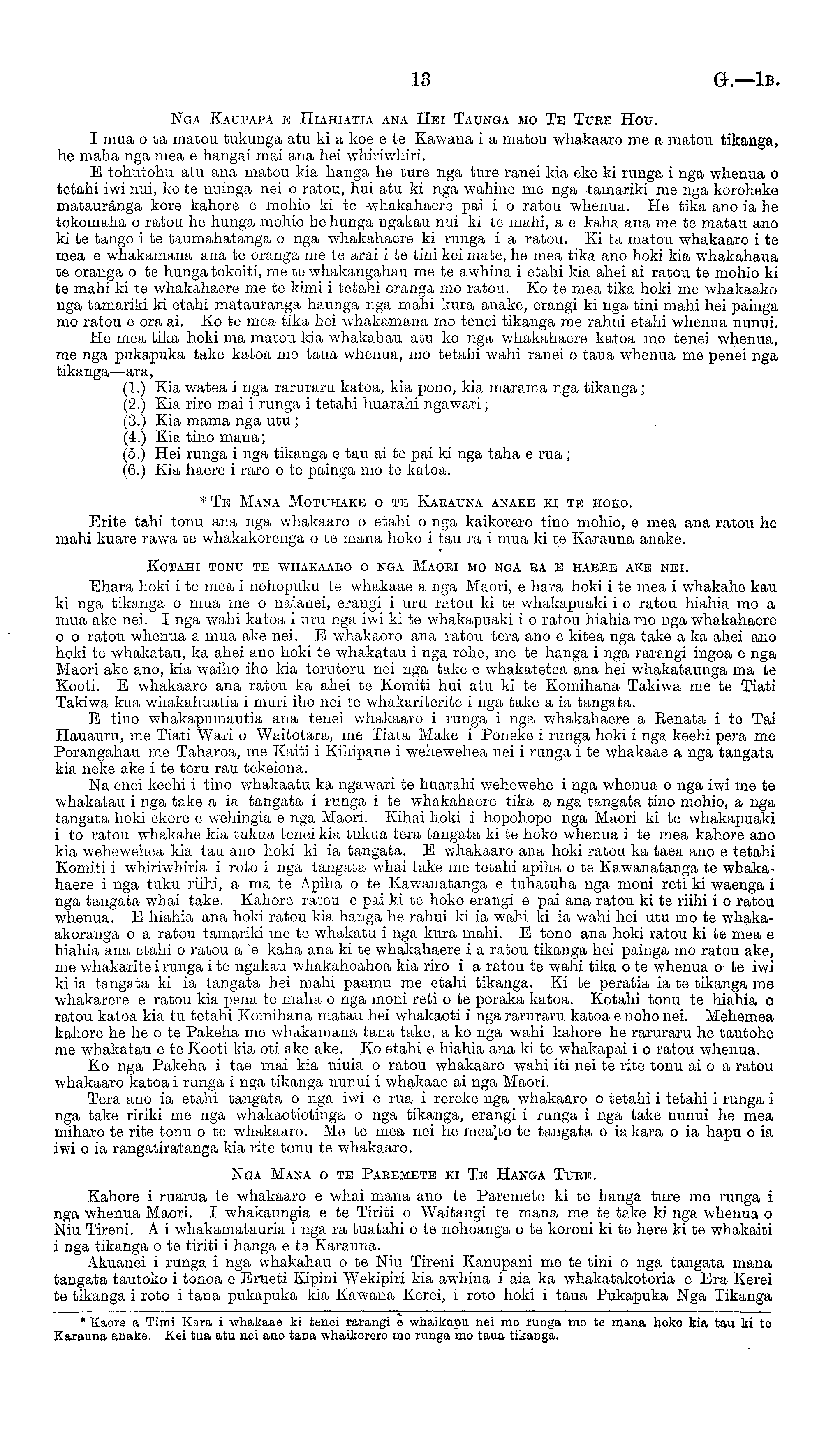Nga Kaupapa c Hiahiatia ana Hei Taunga mo Te Tuee Hou. I mua o ta matou tukunga atu ki a koe c te Kawana i a matou whakaaro me a matou tikanga, he maha nga mea c hangai mai ana hei whiriwhiri. E tohutohu atu ana matou kia hanga he ture nga ture ranei kia eke ki runga i nga when.ua o tetahi iwi nui, ko te nuinga nei o ratou, hui atu ki nga wahine me nga tamariki me nga koroheke matauranga kore kahore c mohio kite whakahaere pai i o ratou whenua. He tika ano ia he tokomaha o ratou he hunga mohio he hunga ngakau nui kite mahi, a c kaha ana me te matau ano kite tango ite taumahatanga o nga whakahaere ki runga i a ratou. Xi ta matou whakaaro ite mea c whakamana ana te oranga me te arai i te tini kei mate, he mea tika ano hoki kia whakahaua te oranga o te hunga tokoiti, me te whakangahau me te awhina i etahi kia ahei ai ratou te mohio ki te mahi kite whakahaere me te kimi i tetahi oranga mo ratou. Ko te mea tika hoki me whakaako nga tamariki ki etahi matauranga haunga nga mahi kura anake, erangi ki nga tini mahi hei painga mo ratou c ora ai. Ko te mea tika hei whakamana mo tenei tikanga me rahui etahi whenua nunui. He mea tika hoki ma matou kia whakahau atu ko nga whakahaere katoa mo tenei whenua, me nga pukapuka take katoa mo taua whenua, mo tetahi wahi ranei o taua whenua me penei nga tikanga —ara, (1.) Kia watea i nga raruraru katoa, kia pono, kia marama nga tikanga; (2.) Kia riro mai i runga i tetahi huarahi ngawari; (3.) Kia mama nga utu ; (4.) Kia tino mana; (5.) Hei runga i nga tikanga c tau ai te pai ki nga taha c rua ; (6.) Kia haere i raro o te painga mo te katoa. *Te Mana Motuhake o te Kakauna anake kite hoko. Erite tahi tonu ana nga whakaaro o etahi o nga kaikorero tino mohio, c mea ana ratou he mahi kuare rawa te whakakorenga o te mana hoko i tau ra i mua kite Karauna anake. KOTAHI TONU TE WHAKAARO O NGA MAOEI MO NGA EA E HAEEE AXE NEI. Ehara hoki i te mea i nohopuku te whakaae a nga Maori, c hara hoki i te mea i whakahe kau ki nga tikanga o mua me o naianei, erangi i uru ratou kite whakapuaki i o ratou hiahia mo a mua ake nei. I nga wahi katoa i uru nga iwi kite whakapuaki i o ratou hiahia mo nga whakahaere 0 o ratou whenua a mua ake nei. E whakaoro ana ratou tera ano c kitea nga take aka ahei ano hoki te whakatau, ka ahei ano hoki te whakatau i nga rohe, me te hanga i nga rarangi ingoa c nga Maori ake ano, kia waiho iho kia torutoru nei nga take c whakatetea ana hei whakataunga ma te Kooti. E whakaaro ana ratou ka ahei te Komiti hui atu kite Koinihana Takiwa me te Tiati Takiwa kua whakahuatia i muri iho nei te whakariterite i nga take a ia tangata. E tino whakapumautia ana tenei whakaaro i runga i nga whakahaere a Eenata i te Tai Hauauru, me Tiati Wari o Waitotara, me Tiata Make i Poneke i runga hoki i nga keehi pera me Porangahau me Taharoa, me Kaiti i Kihipane i wehewehea nei i runga i te whakaae a nga tangata kia neke ake i te toru rau tekeiona. Na enei keehi i tino whakaatu ka ngawari te huarahi wehowehe i nga whenua o nga iwi me te whakatau i nga take a ia tangata i runga i te whakahaere tika a nga tangata tino mohio, a nga tangata hoki ekore c wehingia c nga Maori. Kihai hoki i hopohopo nga Maori kite whakapuaki 1 to ratou whakahe kia tukua tenei kia tukua tera tangata kite hoko whenua i te mea kahore ano kia wehewehea kia tau ano hoki ki ia tangata. E whakaaro ana hoki ratou ka taea ano c tetahi Komiti i whiriwhiria i roto i nga tangata whai take me tetahi apiha o te Kawanatanga te whakahaere i nga tuku riihi, a ma te Apiha o te Kawanatanga c tuhatuha nga moni reti ki waenga i nga tangata whai take. Kahore ratou c pai kite hoko erangi c pai ana ratou kite riihi i o ratou whenua. E hiahia ana hoki ratou kia hanga he rahui ki ia wahi ki ia wahi hei utu mo te whakaakoranga o a ratou tamariki me te whakatu i nga kura mahi. E tono ana hoki ratou kite mea c hiahia ana etahi o ratou a c kaha ana kite whakahaere i a ratou tikanga hei painga mo ratou ake, me whakarite i runga ite ngakau whakahoahoa kia riro i a ratou te wahi tika o te whenua o te iwi ki ia tangata ki ia tangata hei mahi paamu me etahi tikanga. Xi te peratia ia te tikanga me whakarere c ratou kia pena te maha o nga inoni reti ote poraka katoa. Kotahi tonu te hiahia o ratou katoa kia tv tetahi Komihana matau hei whakaoti i nga raruraru katoa c noho nei. Mehemea kahore he he o te Pakeha me whakamana tana take, a ko nga wahi kahore he raruraru he tautohe me whakatau etc Kooti kia oti ake ake. Ko etahi c hiahia ana kite whakapai i o ratou whenua. Ko nga Pakeha i tae mai kia uiuia o ratou whakaaro wahi iti nei te rite tonu ai o a ratou whakaaro katoa i runga i nga tikanga nunui i whakaae ai nga Maori. Tera ano ia etahi tangata o nga iwi c rua i rereke nga whakaaro o tetahi i tetahi i runga i nga take ririki me nga whakaotiotinga o nga tikanga, erangi i runga i nga take nunui he mea miharo te rite tonu ote whakaaro. Me te mea nei he mea^to te tangata o ia kara oia hapu oia iwi o ia rangatiratanga kia rite tonu te whakaaro. Nga Mana o te Paeemete ki Te Hanga Tuee. Kahore i ruarua te whakaaro c whai mana ano te Paremete kite hanga ture mo runga i nga whenua Maori. I whakaungia c te Tiriti o Waitangi te mana me te take ki nga whenua o Niu Tireni. A i whakamatauria i nga ra tuatahi ote nohoanga ote koroni kite here kite whakaiti i nga tikanga o te tiriti i hanga c ts Karauna. Akuanei i runga i nga whakahau o te Niu Tireni Kanupani me te tini o nga tangata mana tangata tautoko i tonoa c Erueti Kipini Wekipiri kia awhina i aia ka whakatakotoria c Era Kerei te tikanga i roto i tana pukapuka kia Kawana Kerei, i roto hoki i taua Pukapuka Nga Tikanga
