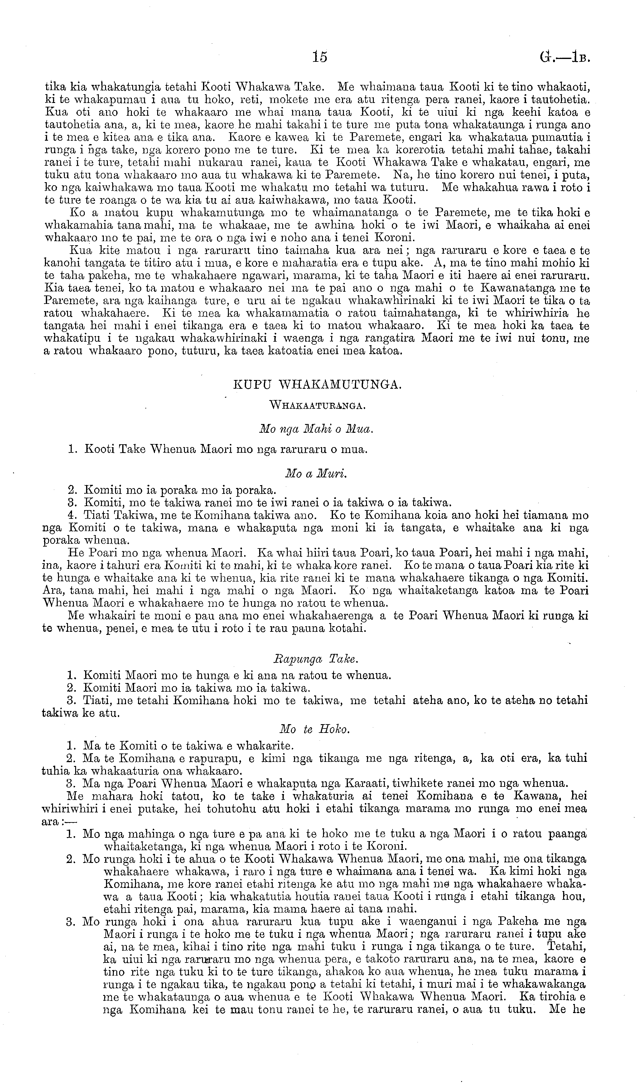 tika kia whakatungia tetahi Kooti Whakawa Take. Me whaimana taua Kooti ki tetino whakaoti, kite whakapumau i aua tv hoko, reti, mokete me era atu ritenga pera ranei, kaore i tautohetia. Kua oti ano hoki te whakaaro me whai mana taua Kooti, kite uiui ki nga keehi katoa c tautohetia ana, a, kite mea, kaore he mahi takahi i te ture me puta tona whakataunga i runga ano ite mea c kitea ana c tika ana. Kaore c kawea kite Paremete, engari ka whakataua pumautia i runga i nga take, nga korero pono me te ture. Xi te mea ka korerotia tetahi mahi tahae, takahi ranei i te ture, tetahi mahi nukarau ranei, kaua te Kooti Whakawa Take c whakatau, engari, me tuku atu tona whakaaro mo aua tv whakawa kite Paremete. Na, he tino korero nui tenei, i puta, ko nga kaiwhakawa mo taua Kooti me whakatu mo tetahi wa tuturu. Me whakahua rawa i roto i te ture te roanga o te wa kia tv ai aua kaiwhakawa, mo taua Kooti. Ko a matou kupu whakamutunga mo te whaimanatanga o te Paremete, me te tika hoki c whakamahia tana mahi, ma te whakaae, me te awhina hoki o te iwi Maori, c whaikaha ai enei whakaaro mo te pai, me te ora o nga iwi c noho ana i tenei Koroni. Kua kite matou i nga raruraru tino taimaha kua ara nei; nga raruraru c kore c taea etc kanohi tangata te titiro atu i mua, c kore c maharatia era c tupu ake. A, ma te tino mahi mohio ki te taha pakeha, me te whakahaere ngawari, marama, kite taha Maori c iti haere ai enei raruraru. Kia taea tenei, ko ta matou c whakaaro nei ma te pai ano o nga mahi o te Kawanatanga me te Paremete, ara nga kaihanga ture, c uru ai te ngakau whakawhirinaki kite iwi Maori te tika o ta ratou whakahaere. Xi te mea ka whakamamatia o ratou taimahatanga, kite whiriwhiria he tangata hei mahi i enei tikauga era c taea ki to matou whakaaro. Xi te mea hoki ka taea te whakatipu i te ugakau whakawhirinaki i waenga i nga rangatira Maori me te iwi nui tonu, me a ratou whakaaro pono, tuturu, ka taea katoatia enei mea katoa. KUPU WHAKAMUTUNGA. Whakaatueanga. Mo nga Mahi o Mua. 1. Kooti Take Whenua Maori mo nga raruraru o mua. Mo a Muri. 2. Komiti mo ia poraka mo ia poraka. 3. Komiti, mo te takiwa ranei mo te iwi ranei o ia takiwa o ia takiwa. 4. Tiati Takiwa, me te Komihana takiwa ano. Ko te Komihana koia ano hoki hei tiamana mo nga Komiti o te takiwa, mana c whakaputa nga moni ki ia tangata, c whaitake ana ki nga poraka whenua. He Poari mo nga whenua Maori. Ka whai hiiri taua Poari, ko taua Poari, hei mahi i nga mahi, ma, kaore i tahuri era Komiti kite mahi, kite whaka kore ranei. Ko te mana o taua Poari kia rite ki te hunga c whaitake ana kite whenua, kia rite rariei kite mana whakahaere tikanga o nga Komiti. Ara, tana mahi, hei mahi i nga mahi o nga Maori. Ko nga whaitaketanga katoa ma te Poari Whenua Maori c whakahaere mo te hunga no ratou te whenua. Me whakairi te moni c pau ana mo enei whakahaerenga a te Poari Whenua Maori ki runga ki te whenua, penei, c mea te utu i roto i te rau pauna kotahi. Rapunga Take. 1. Komiti Maori mo te hunga c ki ana na ratou te whenua. 2. Komiti Maori mo ia takiwa mo ia takiwa. 3. Tiati, me tetahi Komihana hoki mo te takiwa, me tetahi ateha ano, ko te ateha no tetahi takiwa ke atu. Mo te Hoko. 1. Ma te Komiti o te takiwa c whakarite. 2. Ma te Komihana c rapurapu, c kimi nga tikanga me vga ritenga, a, ka oti era, ka tuhi tuhia ka whakaaturia ona whakaaro. 3. Ma nga Poari Whenua Maori c whakaputa nga Karaati, tiwhikete ranei mo nga whenua. Me mahara hoki tatou, ko te take i whakaturia ai tenei Komihana c te Kawana, hei whiriwhiri i enei putake, hei tohutohu atu hoki i etahi tikanga marama mo runga mo enei mea ara:— 1. Mo nga mahinga o nga ture c pa ana kite hoko me te tuku a nga Maori i o ratou paanga whaitaketanga, ki nga whenua Maori i roto i te Koroni. 2. Mo runga hoki i te ahua o te Kooti Whakawa Whenua Maori, me ona mahi, me ona tikanga whakahaere whakawa, i raro i nga ture c whaimana ana i tenei wa. Ka kimi hoki nga Komihana, me kore ranei etahi ritenga ke atu mo nga mahi me nga whakahaere whakawa a taua Kooti; kia whakatutia houtia ranei taua Kooti i runga i etahi tikanga hou, etahi ritenga pai, marama, kia mama haere ai tana mahi. 3. Mo runga hoki i ona ahua raruraru kua tupu ake i waenganui i nga Pakeha me nga Maori i runga ite hoko me te tuku i nga whenua Maori; nga raruraru ranei i tupu ake ai, na te mea, kihai i tino rite nga mahi tuku i runga i nga tikanga ote ture. Tetahi, ka uiui ki nga raru-raru mo nga whenua pera, c takoto raruraru ana, na te mea, kaore c tino rite nga tuku ki to te ture tikanga, ahakoa ko aua whenua, he mea tuku marama i runga i te ngakau tika, te ngakau pono a tetahi ki tetahi, i muri mai i te whakawakanga me te whakataunga o aua whenua c te Kooti Whakawa Whenua Maori. Ka tirohia c nga Komihana kei te mau tonu ranei te he, te raruraru ranei, o aua tv tuku. Me he