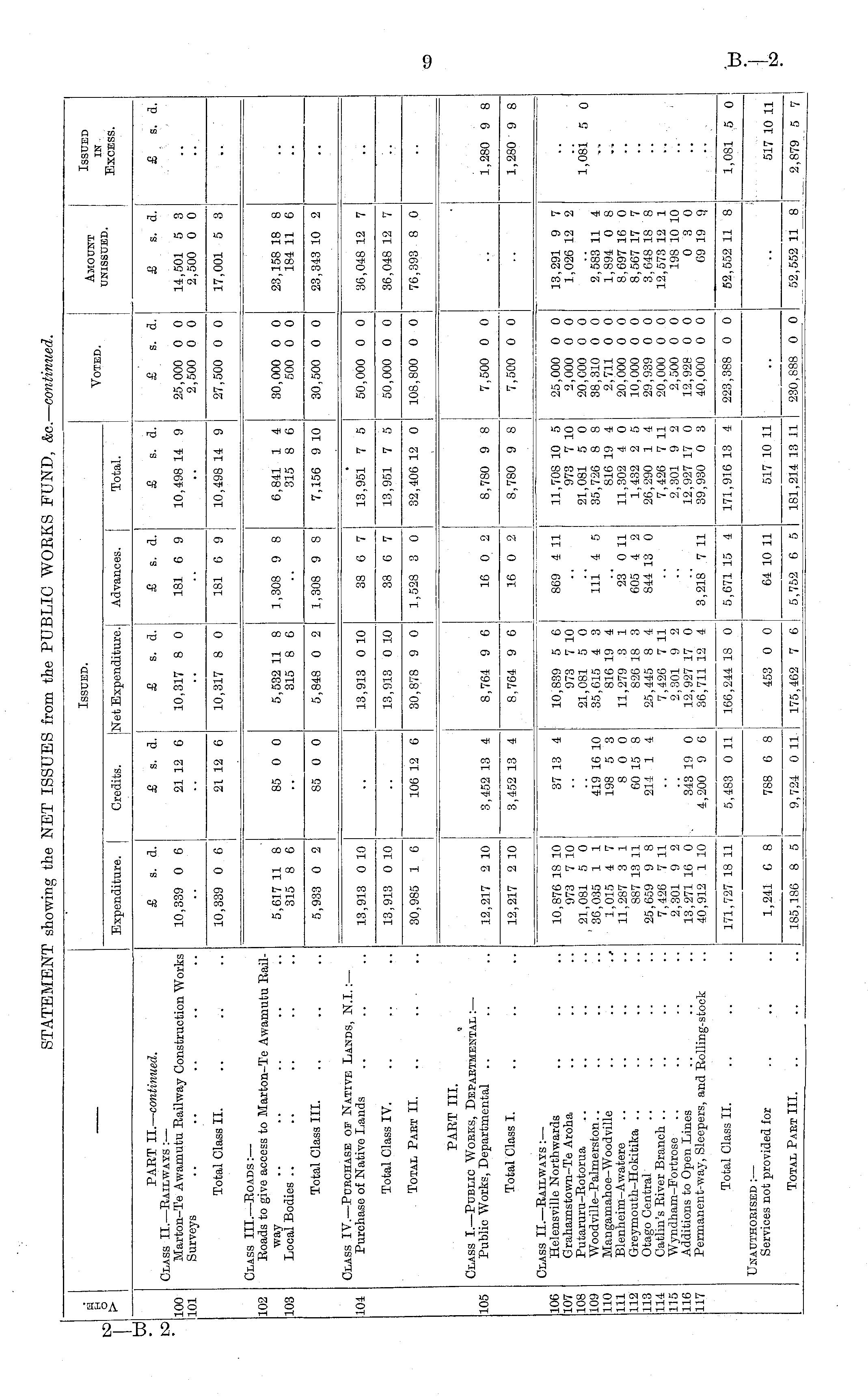 Issued. Voted. Amount unissued. Issued in Excess. o > td Expenditure. Credits. |Net Expenditure. Advances. Total. PART II. — continued. Class II. —Railways :— Marton-Te Awamutu Railway Construction Works Surveys £ s. d. £ s. a. £ s. d. £ s. d. £ s. d. £ s. d. £ s. d. £ s. a. Kd 10,317 8 0 181 6 9 10,498 14 9 25,000 0 0 2,500 0 0 14,501 5 3 2,500 0 0 100 101 10,339 0 6 21 12 6 Total Class II. 10,339 0 6 21 12 6 10,317 8 0 181 6 9 10,498 14 9 27,500 0 0 17,001 5 3 102 Class III. —Roads: — Roads to give access to Marton-Te Awamutu Railway Local Bodies 5,617 11 8 315 8 6 103 85 0 0 5,532 11 8 315 8 6 1,308 9 8 6,841 1 4 315 8 6 30,000 0 0 500 0 0 23,158 18 8 184 11 6 Total Class III. 5,933 0 2 85 0 0 5,848 0 2 1,308 9 8 7,156 9 10 30,500 0 0 23,343 10 2 Class IV. —Purchase of Native Lands, N.I.: — Purchase of Native Lands 13,951 7 5 104 13,913 0 10 13,913 0 10 38 6 7 50,000 0 0 36,048 12 7 Total Class IV. 13,913 0 10 13,913 0 10 38 6 7 13,951 7 5 50,000 0 0 36,048 12 7 Total Part II. .. 30,985 1 0 106 12 6 30,878 9 0 1,528 3 0 32,406 12 0 108,800 0 0 76,393 8 0 PAET III. Class I.—Public Works, Departmental :— Public Works, Departmental 105 12,217 2 10 3,452 13 4 8,764 9 6 16 0 2 8,780 9 8 7,500 0 0 1,280 9 8 Total Class I. 12,217 2 10 3,452 13 4 8,764 9 6 16 0 2 8,780 9 8 7,500 0 0 1,280 9 8 106 107 108 109 110 111 112 113 114 115 116 117 Class II. —Eailways :— Helensville Northwards G rahamstown-Te Aroha Putaruru-Eotorua Woodville-Palmerston.. Mangamahoe-Wooaville .. .. . Blenheim-Awatere Greymouth-Hokitika Otago Central .. .. .. Catlin's River Branch Wyndham-Fortrose Aaaitions to Open Lines Permanent-way, Sleepers, ana Rolling-stock 10,876 18 10 973 7 10 21,081 5 0 30,035 1 1 1,015 4 7 11,287 3 1 887 13 11 25,659 9 8 7,426 7 11 2,301 9 2 13,271 16 0 40,912 1 10 37 13 4 419 16 10 198 5 3 8 0 0 60 15 8 214 1 4 10,839 5 6 973 7 10 21,081 5 0 35,615 4 3 816 19 4 11,279 3 1 826 18 3 25,445 8 4 7,426 7 11 2,301 9 2 12,927 17 0 36,711 12 4 869 4 11 111' 4 5 23 0 11 605 4 2 844 13 0 11,708 10 5 973 7 10 21,081 5 0 35,726 8 8 816 19 4 11,302 4 0 1,432 2 5 26,290 1 4 7,426 7 11 2,301 9 2 12,927 17 0 39,930 0 3 25,000 0 0 2,000 0 0 20,000 0 0 38,310 0 0 2,711 0 0 20.000 0 0 10,000 0 0 29,939 0 0 20,000 0 0 2,500 0 0 12,928 0 0 40,000 0 0 13,291 9 7 1,026 12 2 2,583 11 4 1,894 0 8 8,697 16 0 8,567 17 7 3,648 18 8 12,573 12 1 198 10 10 0 3 0 09 19 9 1,081 5 0 343 19 0 4,200 9 6 3,21S' 7 11 Total Class II. 171,727 18 11 5,483 0 11 166,244 18 0 5,671 15 171,916 13 4 223,388 0 0 52,552 11 8 1,081 5 0 Unauthorised :— Services not proviaed for 1,241 0 8 78S 6 8 453 0 0 64 10 11 517 10 11 517 10 11 •• •• Total Part III. 185,186 8 5 5,752 6 5 181,214 13 11 230,888 0 0 52,552 11 8 : 2,879 5 7 9,724 0 11 175,462 7 6