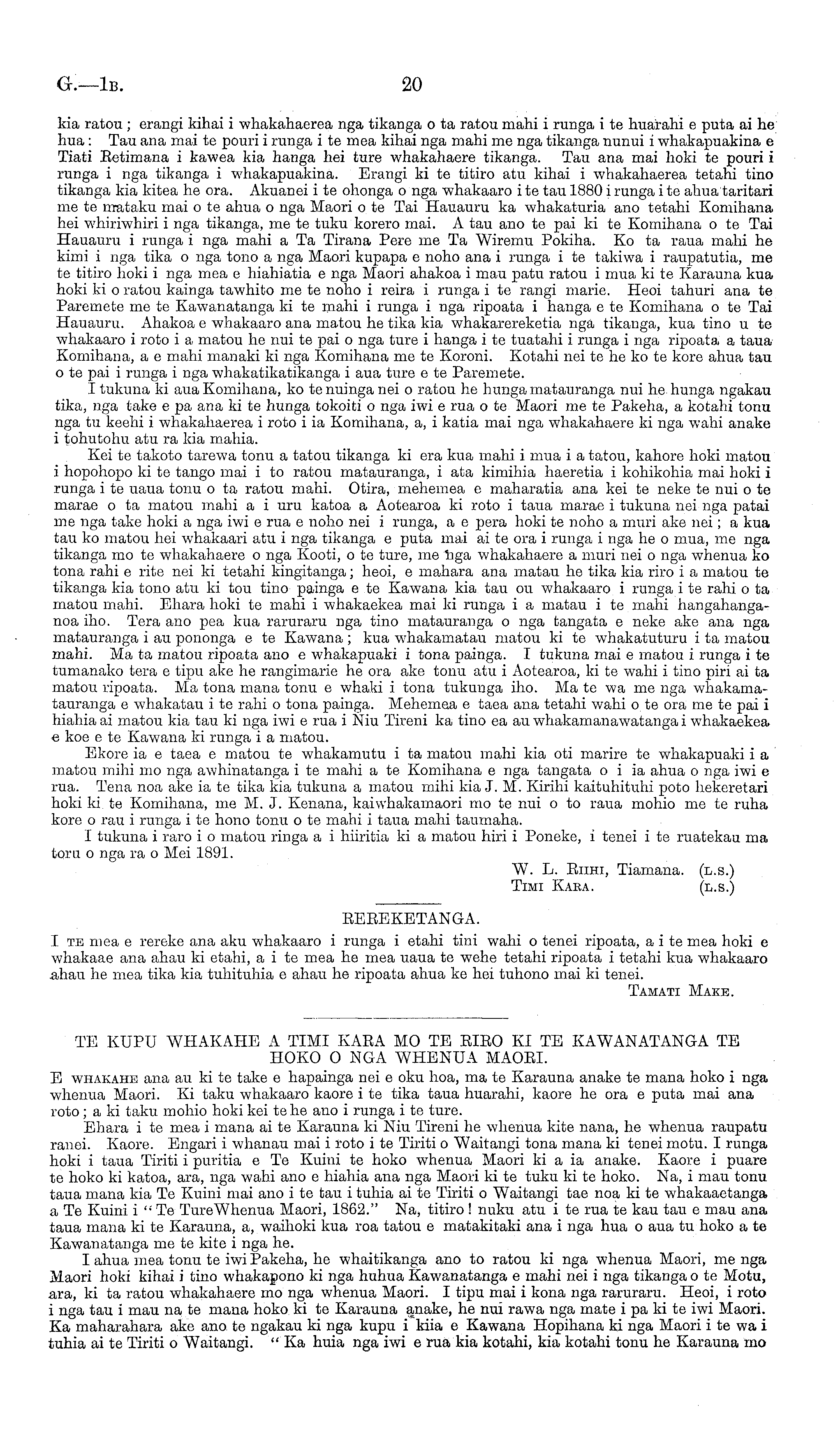 kia ratou ; erangi kihai i whakahaerea nga tikanga o ta ratou mahi i runga i te huarahi c puta ai he hua: Tau ana mai te pouri i runga ite mea kihai nga mahi me nga tikanga nunui i whakapuakina c Tiati Eetimana i kawea kia hanga hei ture whakahaere tikanga. Tau ana mai hoki te pouri i runga i nga tikanga i whakapuakina. Erangi kite titiro atu kihai i whakahaerea tetahi tino tikanga kia kitea he ora. Akuanei ite ohonga o nga whakaaro ite tau 1880 i runga ite ahua taritari me te mat aku mai o te ahua o nga Maori o te Tai Hauauru ka whakaturia ano tetahi Komihana hei whiriwhiri i nga tikanga, me te tuku korero mai. A tau ano te pai kite Komihana o te Tai Hauauru i runga i nga mahi aTa Tirana Pere me Ta Wiremu Pokiha. Ko ta raua mahi he kimi i nga tika o nga tono a nga Maori kupapa c noho ana i runga i te takiwa i raupatutia, me te titiro hoki i nga mea c hiahiatia c nga Maori ahakoa i mau patu ratou i inua kite Karauna kua hoki ki o ratou kainga tawhito me te noho i reira i runga i te rangi marie. Heoi tahuri ana te Paremete me te Kawanatanga kite mahi i runga i nga ripoata i hanga c te Komihana o te Tai Hauauru. Ahakoa c whakaaro ana matou he tika kia whakarereketia nga tikanga, kua tino v te whakaaro i roto i a matou he nui te pai o nga ture i hanga i te tuatahi i runga i nga ripoata a taua Komihana, a c mahi manaki ki nga Komihana me te Koroni. Kotahi nei te he ko te kore ahua tau 0 te pai i runga i nga whakatikatikanga i aua ture c te Paremete. Itukuna ki aua Komihana, ko tenuinganei o ratou he hunga matauranga nui he hunga ngakau tika, nga take c pa ana kite hunga tokoiti o nga iwi c rua o te Maori me te Pakeha, a kotahi tonu nga tv keehi i whakahaerea i roto i ia Komihana, a, i katia mai nga whakahaere ki nga wahi anake 1 tohutohu atu ra kia mahia. Kei te takoto tarewa tonu a tatou tikanga ki era kua mahi i mua i a tatou, kahore hoki matou i hopohopo kite tango mai i to ratou matauranga, i ata kimihia haeretia i kohikohia mai hoki i runga ite uaua tonu o ta ratou mahi. Otira, mehemea c maharatia ana kei te neke te nui ote marae o ta matou mahi a i uru katoa a Aotearoa ki roto i taua marae i tukuna nei nga patai me nga take hoki a nga iwi o rua c noho nei i runga, a c pera hoki te noho a muri ake nei; a kua tau ko matou hei whakaari atu i nga tikanga c puta mai ai te ora i runga i nga he o mua, me nga tikanga mo te whakahaere o nga Kooti, o te ture, me nga whakahaere a muri nei o nga whenua ko tona rahi c rite nei ki tetahi kingitanga; heoi, c mahara ana matau he tika kia riro i a matou te tikanga kia tono atu ki tou tino painga c te Kawana kia tau ou whakaaro i runga i te rahi o ta matou mahi. Ehara hoki te mahi i whakaekea mai ki runga i a matau i te mahi hangahanganoa iho. Tera ano pea kua raruraru nga tino matauranga o nga tangata c neke ake ana nga matauranga iau pononga c te Kawana ; kua whakamatau matou kite whakatuturu ita matou mahi. Ma ta matou ripoata ano c whakapuaki i tona painga. I tukuna mai c matou i runga ite tumanako tera c tipu ake he rangimarie he ora ake tonu atu i Aotearoa, kite wahi i tino piri ai ta matou ripoata. Ma tona mana tonu c whaki i tona tukunga iho. Ma te wa me nga whakamatauranga c whakatau ite rahi o tona painga. Mehemea c taea ana tetahi wahi ote ora me te pai i hiahia ai matou kia tau ki nga iwi c rua i Niu Tireni ka tino ea au whakamanawatanga i whakaekea c koe c te Kawana ki runga i a matou. Ekore ia c taea c matou te whakainutu i ta matou mahi kia oti marire te whakapuaki i a matou mihi mo nga awhinatanga i te mahi a te Komihana c nga tangata o i ia ahua o nga iwi c rua. Tena noa ake ia te tika kia tukuna a matou mihi kia J. M. Kirihi kaituhituhi poto hekeretari hoki ki. te Komihana, me M. J. Kenana, kaiwhakamaori mo te nui o to raua mohio me te ruha kore o rau i runga i te hono tonu o te mahi i taua mahi taumaha. I tukuna i raro i o matou ringa a i hiiritia ki a matou hiri i Poneke, i tenei i te ruatekau ma torn o nga ra o Mci 1891. W. L. Eiihi, Tiamana. (1.5.) Timi Kaea. (1.5.)