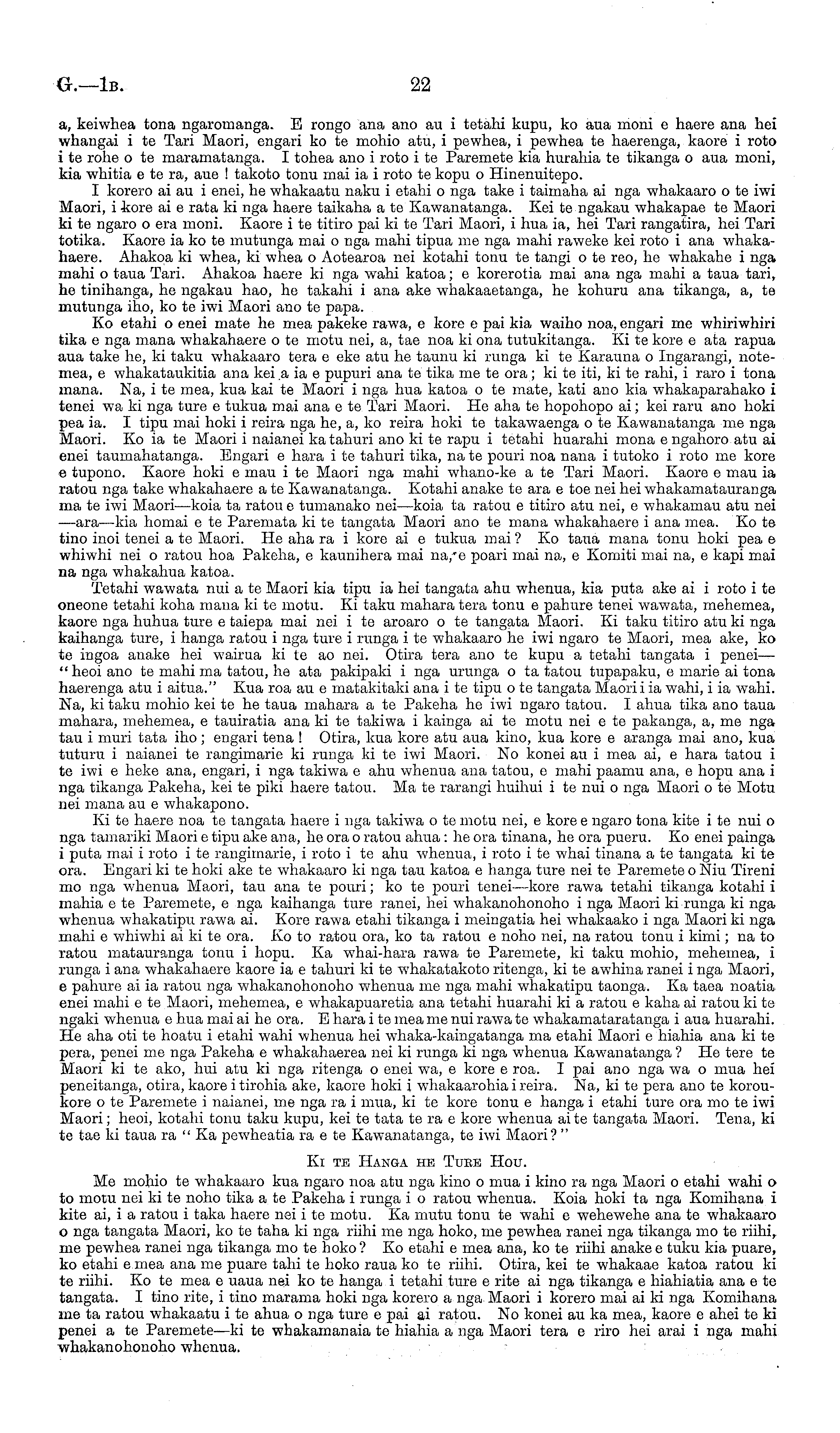 a, keiwhea tona ngarornanga. E rongo ana ano au i tetahi kupu, ko aua moni c haere ana hei whangai i te Tari Maori, engari ko te mohio atu, i pewhea, i pewhea te haerenga, kaore i roto ite rohe o te maramatanga. I tohea ano i roto ite Paremete kia hurahia te tikanga o aua moni, kia whitia c te ra, aue ! takoto tomi rnai ia i roto te kopu o Hinenuitepo. I korero ai au i enei, he whakaatu naku i etahi o nga take i taimaha ai nga whakaaro o te iwi Maori, i tore ai c rata ki nga haere taikaha ate Kawanatanga. Kei te ngakau whakapae te Maori kite ngaro o era moni. Kaore ite titiro pai kite Tari Maori, i hua ia, hei Tari rangatira, hei Tari totika. Kaore ia ko te mutunga mai o nga mahi tipua me nga mahi raweke kei roto i ana whakahaere. Ahakoa ki whea, ki whea o Aotearoa nei kotahi tonu te tangi ote reo, he whakahe i nga mahi o taua Tari. Ahakoa haere ki nga wahi katoa; c korerotia mai ana nga mahi a taua tari, he tinihanga, he ngakau hao, he takahi i ana ake whakaaetanga, he kohuru ana tikanga, a, te mutunga iho, ko te iwi Maori ano te papa. Ko etahi o enei mate he mea pakeke rawa, c kore c pai kia waiho noa, engari me whiriwhiri tika c nga mana whakahaere ote motu nei, a, tae noa ki ona tutukitanga. Xi te kore c ata rapua aua take he, ki taku whakaaro tera c eke atu he tauixu ki runga kite Karauna o Ingarangi, notemea, c whakataukitia ana kei aia c pupuri ana te tika me te ora; kite iti, kite rahi, i raro i tona mana. Na, ite mea, kua kai te Maori i nga hua katoa o te mate, kati ano kia whakaparahako i tenei wa ki nga ture c tukua mai ana etc Tari Maori. He aha te hopohopo ai; kei raru ano hoki pea ia. I tipu mai hoki i reira nga he, a, ko reira hoki te takawaenga ote Kawanatanga me nga Maori. Ko ia te Maori i naianei katahuri ano kite rapu i tetahi huarahi mona engahoro atu ai enei taumahatanga. Engari c hara ite tahuri tika, na te pouri noa nana i tutoko i roto me kore c tupono. Kaore hoki c mau ite Maori nga mahi whano-ke ate Tari Maori. Kaore c mau ia ratou nga take whakahaere ate Kawanatanga. Kotahi anake te ara c toe nei hei whakamatauranga ma te iwi Maori —koia ta ratou c tumanako nei—koia ta ratou c titiro atu nei, c whakamau atu nei —ara —kia homai etc Paremata kite tangata Maori ano te mana whakahaere i ana mea. Ko te tino inoi tenei ate Maori. He aha ra i kore ai c tukua mai ? Ko taua mana tonu hoki pea c whiwhi nei o ratou hoa Pakeha, c kaunihera mai na,'e poari mama, c Komiti mama,i na, c kapi mai na nga whakahua katoa. Tetahi wawata nui a te Maori kia tipu ia hei tangata ahu whenua, kia puta ake ai i roto i te oneone tetahi koha mana kite motu. Xi taku mahara tera tonu c pahure tenei wawata, mehemea, kaore nga huhua ture c taiepa mai nei i te aroaro o te tangata Maori. Xi taku titiro atu ki nga kaihanga ture, i hanga ratou i nga ture i runga i te whakaaro he iwi ngaro te Maori, mea ake, ko te ingoa anake hei wairua kite ao nei. Otira tera ano te kupu a tetahi tangata i penei— " heoi ano te mahi ma tatou, he ata pakipaki i nga urunga o ta tatou tupapaku, c marie ai tona haerenga atu i aitua." Kua roa au c matakitaki ana ite tipu ote tangata Maori iia wahi, iia wahi. Na, ki taku mohio kei te he taua mahara ate Pakeha he iwi ngaro tatou. I ahua tika ano taua mahara, mehemea, c tauiratia ana kite takiwa i kainga ai te motu nei c te pakanga, a, me nga tau i muri tata iho ; engari tena ! Otira, kua kore atu aua kino, kua kore c aranga mai ano, kua tutum i naianei te rangimarie ki runga kite iwi Maori. No konei au i mea ai, c hara tatou i te iwi c heke ana, engari, i nga takiwa c ahu whenua ana tatou, c mahi paamu ana, c hopu ana i nga tikanga Pakeha, kei te piki haere tatou. Ma te rarangi huihui i te nui o nga Maori ote Motu nei mana au c whakapono. Xi te haere noa te tangata haere i nga takiwa o te motu nei, c kore c ngaro tona kite i te nui o nga tamariki Maori c tipu ake ana, he ora o ratou ahua :he ora tinana, he ora pueru. Ko enei painga i puta mai i roto i te rangimarie, i roto i te ahu whenua, i roto i te whai tinana a te tangata kite ora. Engari kite hoki ake te whakaaro ki nga tau katoa c hanga ture nei te Paremete o Niu Tireni mo nga whenua Maori, tau ana te pouri; ko te pouri tenei—kore rawa tetahi tikanga kotahi i mahia c te Paremete, c nga kaihanga ture ranei, hei whakanohonoho i nga Maori ki runga ki nga whenua whakatipu rawa ai. Kore rawa etahi tikanga i meingatia hei whakaako i nga Maori ki nga mahi c whiwhi ai kite ora. Ko to ratou ora, ko ta ratou c noho nei, na ratou tonu i kimi; na to ratou matauranga tonu i hopu. Ka whai-hara rawa te Paremete, ki taku mohio, mehemea, i runga i ana whakahaere kaore ia c tahuri kite whakatakoto ritenga, kite awhina ranei i nga Maori, c pahure ai ia ratou nga whakanohonoho whenua me nga mahi whakatipu taonga. Ka taea noatia enei mahi c te Maori, mehemea, c whakapuaretia ana tetEihi huarahi ki a ratou c kalia ai ratou kite ngaki whenua c hua mai ai he ora. E hara ite mea me nui rawa te whakamataratanga i aua huarahi. He aha oti te hoatu i etahi wahi whenua hei whaka-kaingatanga ma etahi Maori c hiahia ana kite pera, penei me nga Pakeha c whakahaerea nei ki runga ki nga whenua Kawanatanga ? He terete Maori kite ako, hui atu ki nga ritenga o enei wa, c kore c roa. I pai ano nga wa o mua hei peneitanga, otira, kaore i tirohia ake, kaore hoki i whakaarohia i reira. Na, kite pera ano te koroukore o te Paremete i naianei, me nga ra i mua, kite kore tonu c hanga i etahi ture ora mo te iwi Maori; heoi, kotahi tonu taku kupu, kei te tata te ra c kore whenua ai te tangata Maori. Tena, ki te tae ki taua ra " Ka pewheatia ra c te Kawanatanga, te iwi Maori? " Xi te Hanga he Tube Hou. Me mohio te whakaaro kua ngaro noa atu nga kino o mua i kino ra nga Maori o etahi wahi o to motu nei kite noho tika ate Pakeha i runga i o ratou whenua. Koia hoki ta nga Komihana i kite ai, i a ratou i taka haere nei ite motu. Ka mutu tonu te wahi c wehewehe ana te whakaaro o nga tangata Maori, ko te taha ki nga riihi me nga hoko, me pewhea ranei nga tika