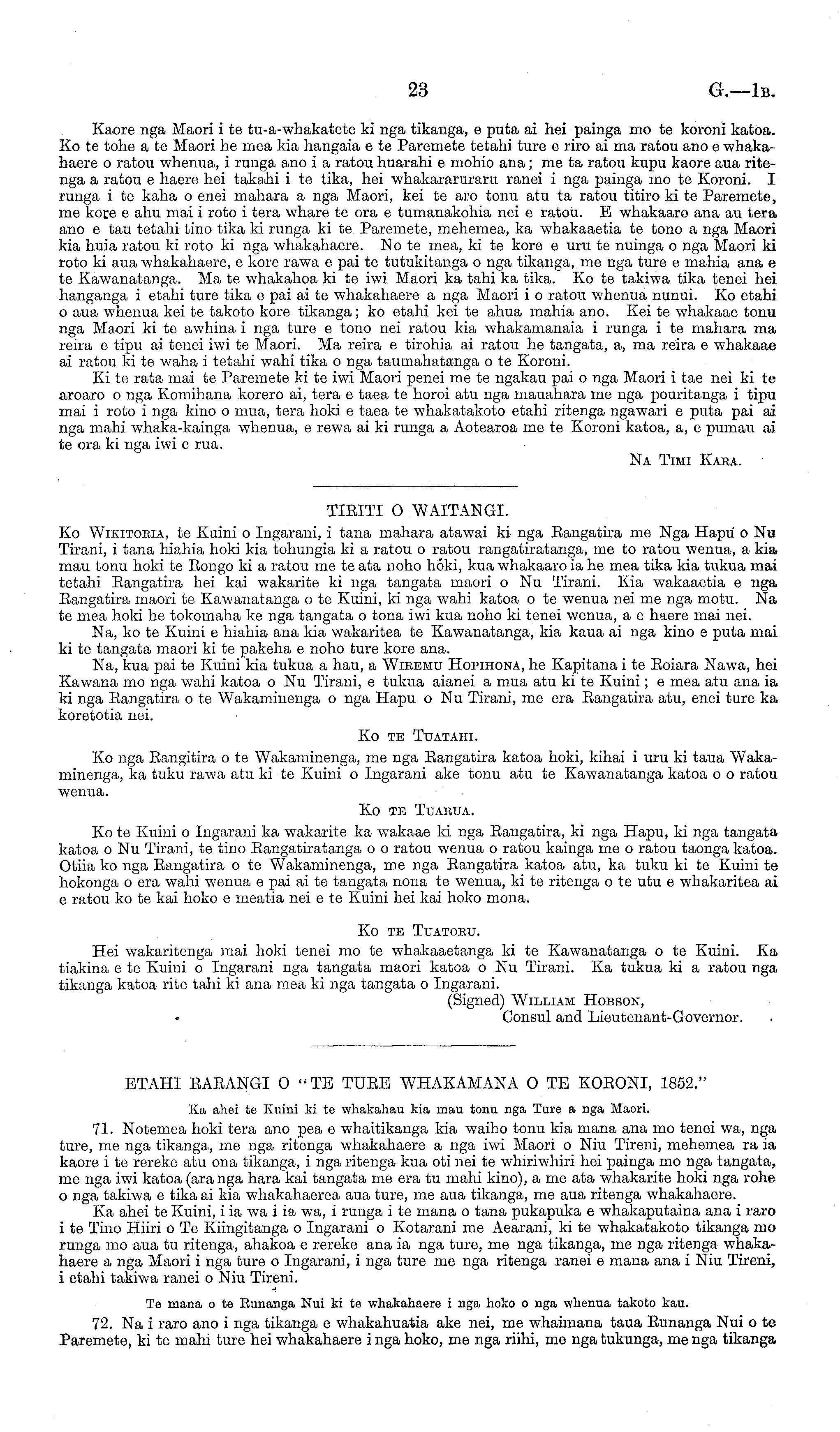 TIEITI 0 WAITANGI. Ko Wikitokia, te Kuini o Ingarani, i tana mahara atawai ki nga Eangatira me Nga Hapu o Nu Tirani, i tana hiahia hoki kia tohungia ki a ratou o ratou rangatiratanga, me to ratou wenua, a kia mau tonu hoki te Bongo ki a ratou me te ata noho hoki, kua whakaaro ia he mea tika kia tukua mai tetahi Eangatira hei kai wakarite ki nga tangata maori o Nu Tirani. Kia wakaaetia c nga Eangatira maori te Kawanatanga ote Kuini, ki nga wahi katoa o te wenua nei me nga motu. Na te mea hoki he tokomaha ke nga tangata o tona iwi kua noho ki tenei wenua, a c haere mai nei. Na, ko te Kuini c hiahia ana kia wakaritea te Kawanatanga, kia kaua ai nga kino c puta mai kite tangata maori kite pakeha c noho ture kore ana. Na, kua pai te Kuini kia tukua a hau, a Wieemu Hopihona, he Kapitana i te Eoiara Nawa, hei Kawana mo nga wahi katoa o Nu Tirani, c tukua aianei a mua atu kite Kuini; c mea atu ana ia ki nga Eangatira o te Wakaminenga o nga Hapu o Nu Tirani, me era Eangatira atu, enei ture ka koretotia nei. Ko TE TUATAHI. Ko nga Eangitira o te Wakaminenga, me nga Eangatira katoa hoki, kihai i uru ki taua Wakaminenga, ka tuku rawa atu kite Kuini o Ingarani ake tonu atu te Kawanatanga katoa o o ratou wenua. Ko te Tuarua. Ko te Kuini o Ingarani ka wakarite ka wakaae ki nga Eangatira, ki nga Hapu, ki nga tangata katoa o Nu Tirani, te tino Eangatiratanga o o ratou wenua o ratou kainga me o ratou taonga katoa. Otiia ko nga Eangatira o te Wakaminenga, me nga Eangatira katoa atu, ka tuku kite Kuini te hokonga o era wahi wenua c pai ai te tangata nona te wenua, kite ritenga o te utu c whakaritea ai c ratou ko te kai hoko c meatia nei c te Kuini hei kai hoko mona. Ko TE TUATOEU. Hei wakaritenga mai hoki tenei mo te whakaaetanga kite Kawanatanga o te Kuini. Ka tiakina etc Kuini o Ingarani nga tangata maori katoa o Nu Tirani. Ka tukua ki a ratou nga tikanga katoa rite tahi ki ana mea ki nga tangata o Ingarani. (Signed) William Hobson, Consul and Lieutenant-Governor.