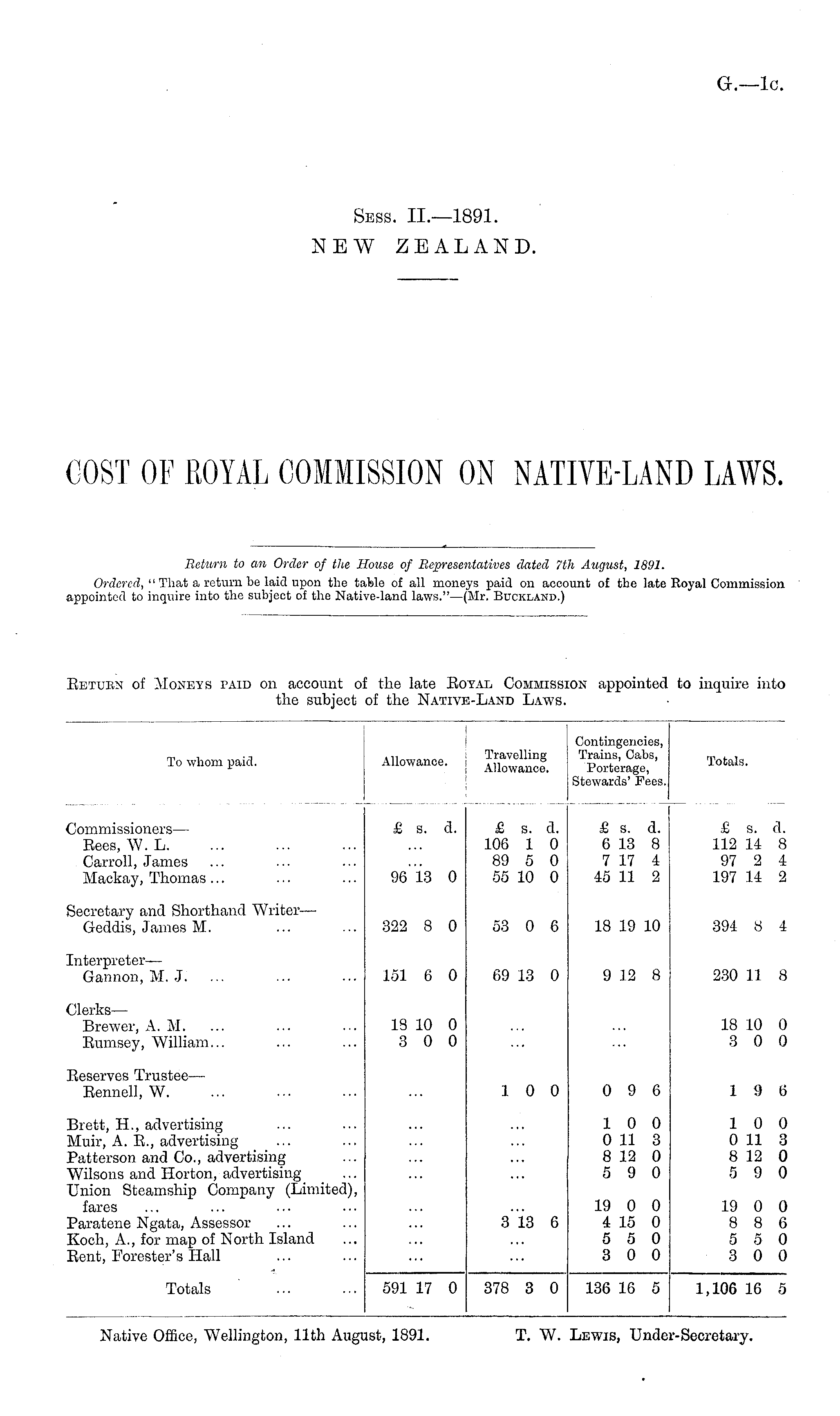 Native Office, Wellington, 11th August, 1891. T. W. Lewis, Under-Secretary.
