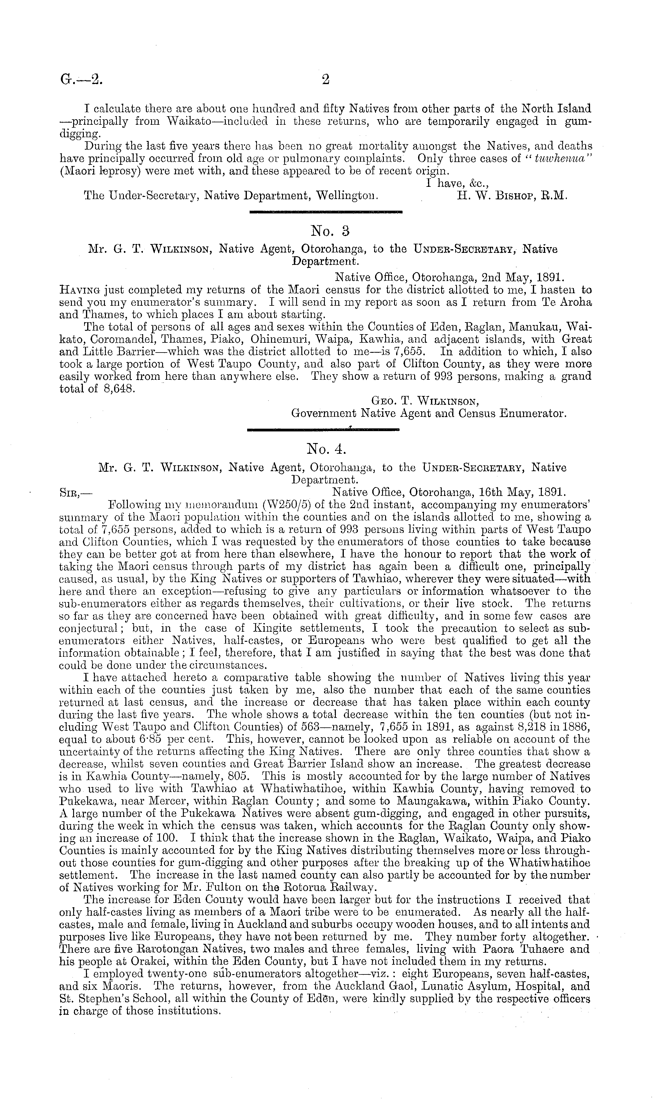 No. 3 Mr. G. T. Wilkinson, Native Agent, Otorohanga, to the Undek-Seceetaby, Native Department. Native Office, Otorohanga, 2nd May, 1891. Having just completed my returns of the Maori census for the district allotted to me, I hasten to send you my enumerator's summary. I will send in my report as soon as I return from Te Aroha and Thames, to which places I am about starting. The total of persons of all ages and sexes within the Counties of Eden, Raglan, Manukau, Waikato, Coromandel, Thames, Piako, Ohinemuri, Waipa, Kawhia, and adjacent islands, with Great and Little Barrier—which was the district allotted to me—is 7,655. In addition to which, I also took a large portion of West Taupo County, and also part of Clifton County, as they were more easily worked from here than anywhere else. They show a return of 993 persons, making a grand total of 8,648. Geo. T. Wilkinson, Government Native Agent and Census Enumerator.