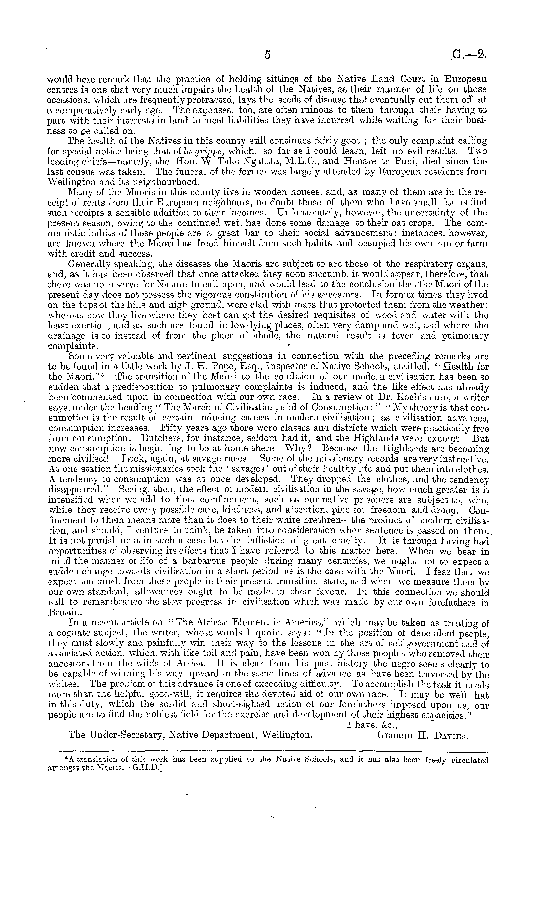 would here remark that the practice of holding sittings of the Native Land Court in European centres is one that very much impairs the health of the Natives, as their manner of life on those occasions, which are frequently protracted, lays the seeds of disease that eventually cut them off at a comparatively early age. The expenses, too, are often ruinous to them through their having to part with their interests in land to meet liabilities they have incurred while waiting for their business to be called on. The health of the Natives in this county still continues fairly good ; the only complaint calling for special notice being that of la grippe, which, so far as I could learn, left no evil results. Two leading chiefs—namely, the Hon. Wi Tako Ngatata, M.L.G., and Henare te Puni, died since the last census was taken. The funeral of the former was largely attended by European residents from Wellington and its neighbourhood. Many of the Maoris in this county live in wooden houses, and, as many of them are in the receipt of rents from their European neighbours, no doubt those of them who have small farms find such receipts a sensible addition to their incomes. Unfortunately, however, the uncertainty of the present season, owing to the continued wet, has done some damage to their oat crops. The communistic habits of these people are a great bar to their social advancement; instances, however, are known where the Maori has freed himself from such habits and occupied his own run or farm with credit and success. Generally speaking, the diseases the Maoris are subject to are those of the respiratory organs, and, as it has been observed that once attacked they soon succumb, it would appear, therefore, that there was no reserve for Nature to call upon, and would lead to the conclusion that the Maori of the present day does not possess the vigorous constitution of his ancestors. In former times they lived on the tops of the hills and high ground, were clad with mats that protected them from the weather; whereas now they live where they best can get the desired requisites of wood and water with the least exertion, and as such are found in low-lying places, often very damp and wet, and where the drainage is to instead of from the place of abode, the natural result is fever and pulmonary complaints. Some very valuable and pertinent suggestions in connection with the preceding remarks are to be found in a little work by J. H. Pope, Esq., Inspector of Native Schools, entitled, " Health for the Maori.":;: The transition of the Maori to the condition of our modern civilisation has been so sudden that a predisposition to pulmonary complaints is induced, and the like effect has already been commented upon in connection with our own race. In a review of Dr. Koch's cure, a writer says, under the heading " The March of Civilisation, and of Consumption: " "My theory is that consumption is the result of certain inducing causes in modern civilisation; as civilisation advances, consumption increases. Fifty years ago there were classes and districts which were practically free from consumption. Butchers, for instance, seldom had it, and the Highlands were exempt. But now consumption is beginning to be at home there—Why ? Because the Highlands are becoming more civilised. Look, again, at savage races. Some of the missionary records are very instructive. At one station the missionaries took the ' savages' out of their healthy life and put them into clothes. A tendency to consumption was at once developed. They dropped the clothes, and the tendency disappeared." Seeing, then, the effect of modern civilisation in the savage, how much greater is it intensified when we add to that comfinement, such as our native prisoners are subject to, who, while they receive every possible care, kindness, and attention, pine for freedom and droop. Confinement to them means more than it does to their white brethren—the product of modern civilisation, and should, I venture to think, be taken into consideration when sentence is passed on them. It is not punishment in such a case but the infliction of great cruelty. It is through having had opportunities of observing its effects that I have referred to this matter here. When we bear in mind the manner of life of a barbarous people during many centuries, we ought not to expect a sudden change towards civilisation in a short period as is the case with the Maori. I fear that we expect too much from these people in their present transition state, and when we measure them by our own standard, allowances ought to be made in their favour. In this connection we should call to remembrance the slow progress in civilisation which was made by our own forefathers in Britain. In a recent article on " The African Element in America," which may be taken as treating of a cognate subject, the writer, whose words I quote, says; "In the position of dependent people, they must slowly and painfully win their way to the lessons in the art of self-government and of associated action, which, with like toil and pain, have been won by those peoples who removed their ancestors from the wilds of Africa. It is clear from his past history the negro seems clearly to be capable of winning his way upward in the same lines of advance as have been traversed by the whites. The problem of this advance is one of exceeding difficulty. To accomplish the task it needs more than the helpful good-will, it requires the devoted aid of our own race. It may be well that in this duty, which the sordid and short-sighted action of our forefathers imposed upon us, our people are to find the noblest field for the exercise and development of their highest capacities." I have, &c, The Under-Secretary, Native Department, Wellington. Geoege H. Davies.