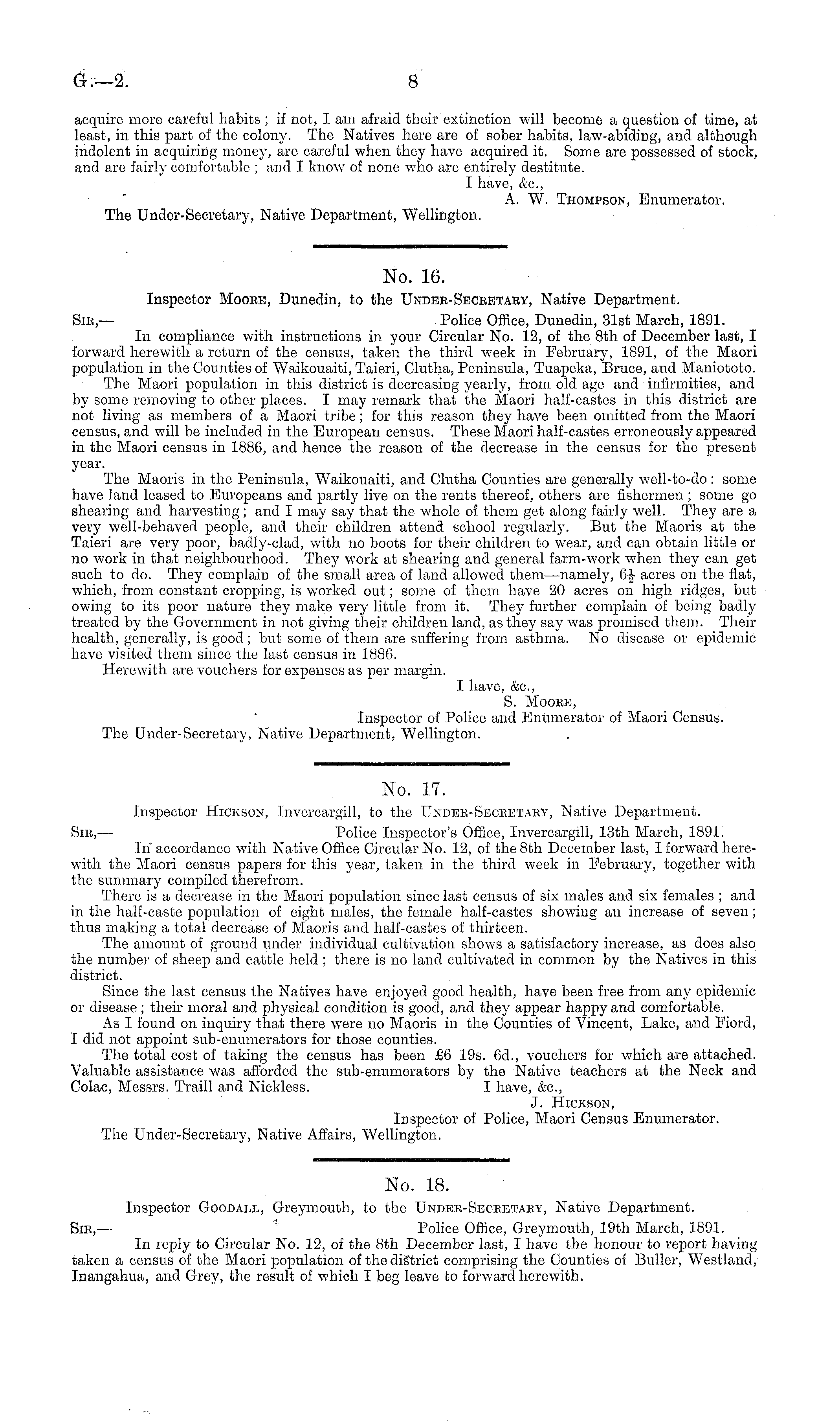 acquire more careful habits ; if not, I am afraid their extinction will become a question of time, at least, in this part of the colony. The Natives here are of sober habits, law-abiding, and although indolent in acquiring money, are careful when they have acquired it. Some are possessed of stock, and are fairly comfortable ; and I know of none who are entirely destitute. I have, &c, A. W. Thompson, Enumerator. The Under-Secretary, Native Department, Wellington.