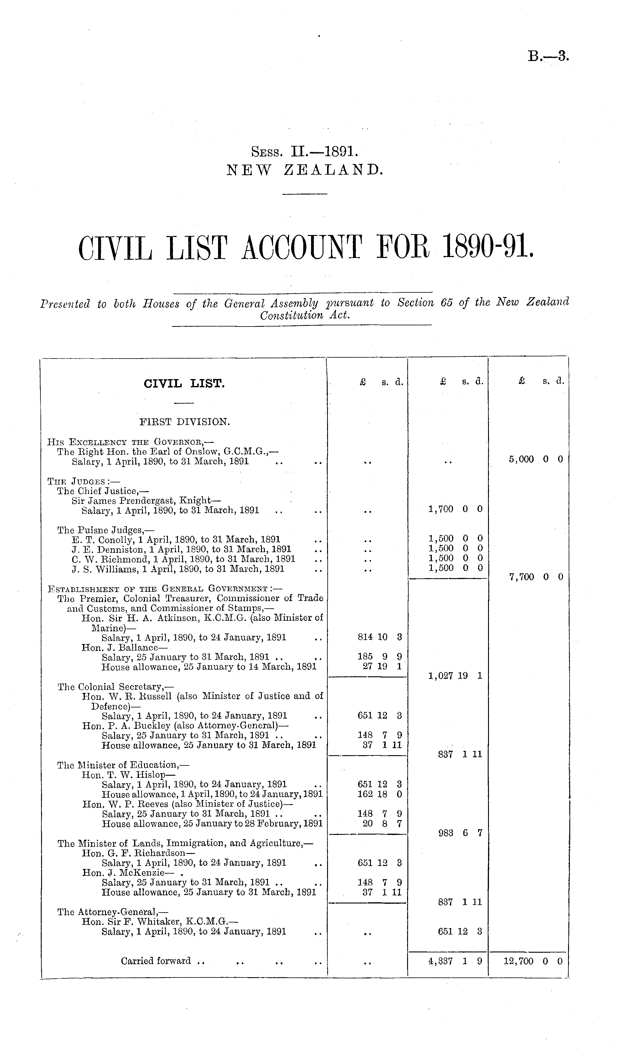 CIVIL LIST. £ s. d. £ s. d. £ s. d. FIRST DIVISION. 5,000 0 0 His Excellency the Goveenoe, — The Right Hon. the Earl of Onslow, G.C.M.G.,— Salary, 1 April, 1890, to 31 March, 1891 The Judges :— The Chief Justice, — Sir James Prendergast, Knight— Salary, 1 April, 1890, to 31 March, 1891 1,700 0 0 The Puisne Judges,— E. T. Conolly, 1 April, 1890, to 31 March, 1891 J. E. Denniston, 1 April, 1890, to 31 March, 1891 C. W. Richmond, 1 April, 1890, to 31 March, 1891 J. S. Williams, 1 April, 1890, to 31 March, 1891 1,500 0 0 1,500 0 0 1,500 0 0 1,500 0 0 7,700 0 0 Establishment op the Geneeal Government :— The Premier, Colonial Treasurer, Commissioner of Trade and Customs, and Commissioner of Stamps,—■ Hon. Sir H. A. Atkinson, K.C.M.G. (also Minister of Marine) — Salary, 1 April, 1890, to 24 January, 1891 Hon. J. Ballance — Salary, 25 January to 31 March, 1891 House allowance, 25 January to 14 March, 1891 814 10 3 185 9 9 27 19 1 The Colonial Secretary,— Hon. W. R. Russell (also Minister of Justice and of Defence) — Salary, 1 April, 1890, to 24 January, 1891 Hon. P. A. Buckley (also Attorney-General) — Salary, 25 January to 31 March, 1891 House allowance, 25 January to 31 March, 1891 1,027 19 1 651 12 3 837 1 11 148 7 9 37 1 11 The Minister of Education, — Hon. T. W. Hislop— Salary, 1 April, 1890, to 24 January, 1891 House allowance, 1 April, 1890, to 24 January, 1891 Hon. W. P. Reeves (also Minister of Justice) — Salary, 25 January to 31 March, 1891 House allowance, 25 January to 28 February, 1891 651 12 3 162 18 0 983 6 7 148 7 9 20 8 7 The Minister of Lands, Immigration, and Agriculture,— Hon. G. F. Richardson — Salary, 1 April, 1890, to 24 January, 1891 Hon. J. McKenzie — . Salary, 25 January to 31 March, 1891 House allowance, 25 January to 31 March, 1891 651 12 3 837 1 11 148 7 9 37 1 11 Tho Attorney-General,— Hon. Sir F. Whitaker, K.C.M.G.— Salary, 1 April, 1890, to 24 January, 1891 651 12 3 Carried forward .. 4,337 1 9 12,700 0 0