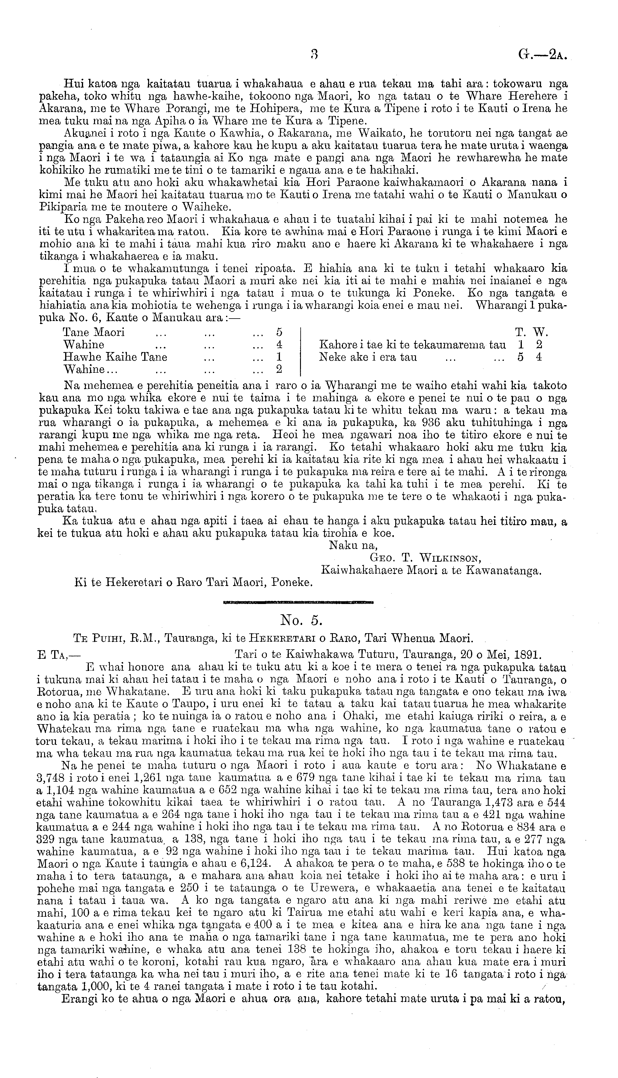 No. 5. Te Puiht, E.M., Tauranga, kite Hekeeetabi o Baro, Tari Whenua Maori. E Ta, — Tari o te Kaiwhakawa Tuturu, Tauranga, 20 o Mci, 1891. E whai honore ana ahau kite tuku atu ki a koe ite mera o tenei ra nga pukapuka tatau i tukuna mai ki ahau hei tatau i te maha o nga Maori c noho ana i roto i te Kauti o Tauranga, o Rotorua, me Whakatane. E tiru ana hoki ki taku pukapuka tatau nga tangata c ono tekau ma iwa c noho ana kite Kaute o Taupo, i uru enei kite tatau a taku kai tatau tuarua he mea whakarite ano ia kia peratia ; ko te nuinga ia o ratou c noho ana i Ohaki, me etahi kaiuga ririki o reira, a c Whatekau ma rima nga tane c ruatekau ma wha nga wahine, ko nga kaumatua tane o ratou c toru tekau, a tekau marima i hoki iho ite tekau ma rima nga tau. I roto i nga wahine c ruatekau ma wha tekau ma rua nga kaumatua tekau ma rua kei te hoki iho nga tau i te tekau ma rima tau. Na he penei te maha tuturu o nga Maori i roto i aua kaute c toru ara: No Whakatane c 3,748 i roto i enei 1,261 nga tane kaumatua a c 679 nga tane kihai i tae kite tekau ma rima tau a 1,104 nga wahine kaumatua a c 652 nga wahine kihai i tae kite tekau ma rima tau, tera ano hoki etahi wahine tokowhitu kikai taea te whiriwhiri i o ratou tau. A no Tauranga 1,473 ara c 544 nga tane kaumatua a c 264 nga tane i hoki iho nga tau i te tekau ma rima tau a c 421 nga wahine kaumatua a c 244 nga wahine i hoki iho nga tau ite tekau ma rima tau. Ano Eotorua c 834 ara c 329 nga tane kaumatua, a 138, nga tane i hoki iho nga tau i te tekau ma rima tau, a c 277 nga wahine kaumatua, a c 92 nga wahine i hoki iho nga tau i te tekau marima tau. Hui katoa nga Maori o nga Kaute i taungia c ahau c 6,124. A ahakoa te pera ote maha, c 538 te hokinga iho ote maha ito tera tataunga, a c mahara ana ahau koia nei tetake i hoki iho ai te maha ara: c uru i pohehe mai nga tangata c 250 i te tataunga o te Urewera, c whakaaetia ana tenei c te kaitatau nana i tatau i taua wa. A ko nga tangata c ngaro atu ana ki nga mahi reriwe me etahi atu mahi, 100 a c rima tekau kei te ngaro atu ki Tairua me etahi atu wahi c keri kapia ana, c whakaaturia ana c enei whika nga tangata c 400 a i te mea c kitea ana c hira ke ana nga tane i nga wahine a c hoki iho ana te maha o nga tamariki tane i nga tane kaumatua, me te pera ano hoki nga tamariki wahine, c whaka atu ana tenei 138 te hokinga iho, ahakoa c toru tekau i haere ki etahi atu wahi o te koroni, kotahi rau kua ngaro, ara c whakaaro ana ahau kua mate era i muri iho i tera tataunga ka wha nei tau i muri iho, a c rite ana tenei mate kite 16 tangata i roto i nga tangata 1,000, kite 4 ranei tangata i mate i roto ite tau kotahi. Erangi ko te ahua o nga Maori c ahua ora ana, kahore tetahi mate uruta i pa mai ki a ratou,