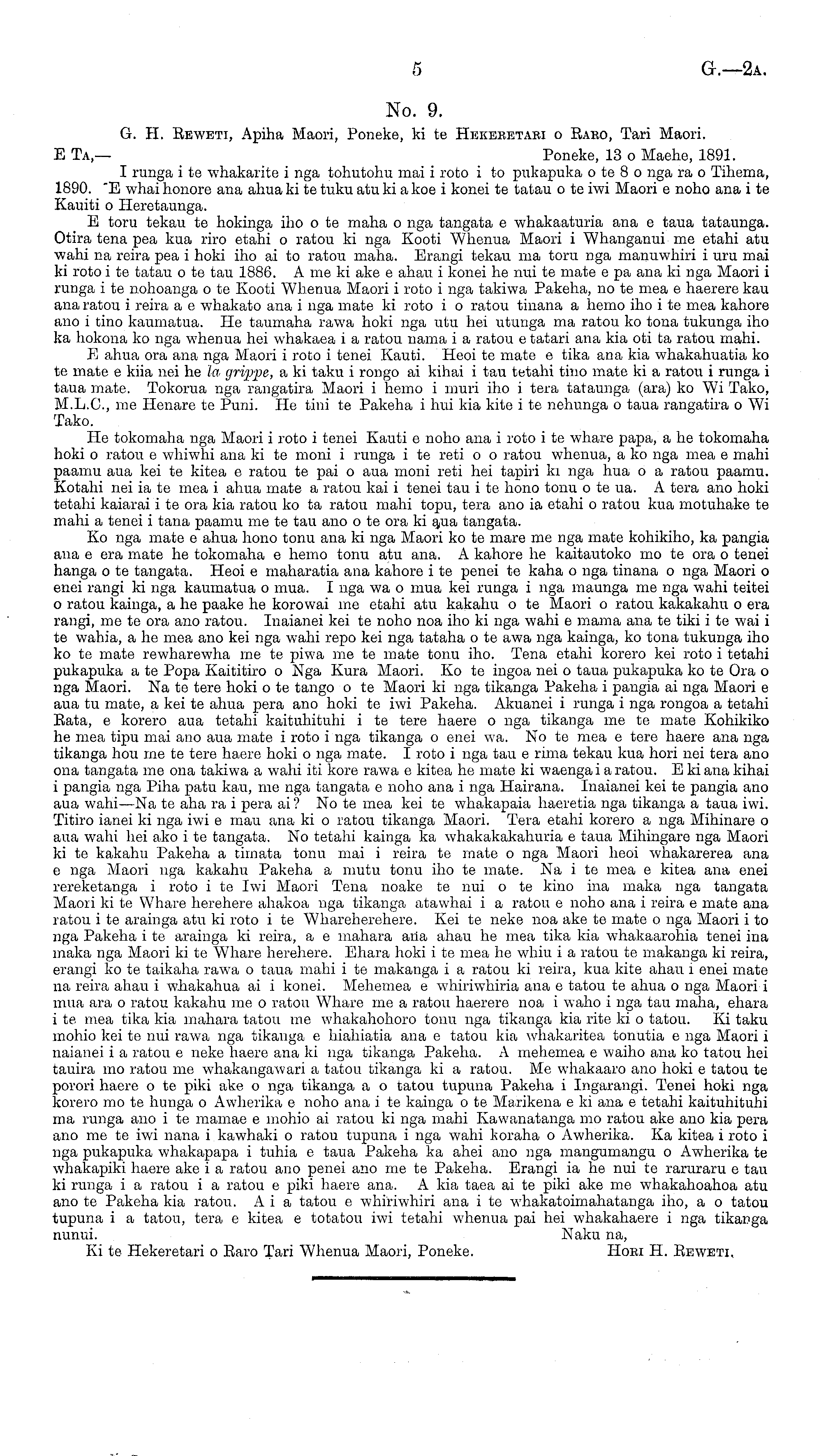 No. 9. G. H. Beweti, Apiha Maori, Poneke, kite Hekeeetahi o Eaeo, Tari Maori. E Ta,— Poneke, 13 o Maehe, 1891. I runga i te whakarite i nga tohutohu mai i roto i to pukapuka o te 8 o nga ra o Tihema, 1890. "E whai honore ana ahua kite tuku atu ki a koe i konei te tatau o te iwi Maori c noho ana ite Kauiti o Heretaunga. E toru tekau te hokinga iho o te maha o nga tangata c whakaaturia ana c taua tataunga. Otira tena pea kua riro etahi o ratou ki nga Kooti Whenua Maori i Whanganui me etahi atu wahi na reira pea i hoki iho ai to ratou maha. Erangi tekau ma toru nga manuwhiri i uru mai ki roto ite tatau ote tau 1886. Ame ki ake c ahau i konei he nui te mate epa ana ki nga Maori i runga i te nohoanga o te Kooti Whenua Maori i roto i nga takiwa Pakeha, no te mea c haerere kau ana ratou i reira a c whakato ana i nga mate ki roto i o ratou tinana a hemo iho i te mea kahore ano i tino kaumatua. He taumaha rawa hoki nga utu hei utunga ma ratou ko tona tukunga iho ka hokona ko nga whenua hei whakaea i a ratou nama i a ratou c tatari ana kia oti ta ratou mahi. E ahua ora ana nga Maori i roto i tenei Kauti. Heoi te mate c tika ana kia whakahuatia ko te mate c kiia nei he la grippe, a ki taku i rongo ai kihai i tau tetahi tino mate ki a ratou i runga i taua mate. Tokorua nga rangatira Maori i hemo i muri iho i tera tataunga (ara) ko Wi Tako, M.L.C., me Henare te Puni. He tiui te Pakeha i hui kia kite ite nehunga o taua rangatira oWi Tako. He tokomaha nga Maori i roto i tenei Kauti c noho ana i roto i te whare papa, a he tokomaha hoki o ratou c whiwhi ana kite moni i runga i te reti o o ratou whenua, a ko nga mea c mahi paamu aua kei te kitea c ratou te pai o aua moni reti hei tapiri ki nga hua o a ratou paamu. Kotahi nei ia te mea i ahua mate a ratou kai i tenei tau ite hono tonu ote ua. A tera ano hoki tetahi kaiarai i te ora kia ratou ko ta ratou mahi topu, tera ano ia etahi o ratou kua motuhake te mahi a tenei i tana paamu me te tau ano o te ora ki a.ua tangata. Ko nga mate c ahua hono tonu ana ki nga Maori ko te mare me nga mate kohikiho, ka pangia ana c era mate he tokomaha c hemo tonu atu ana. A kahore he kaitautoko mo te ora o tenei hanga ote tangata. Heoi c maharatia ana kahore ite penei te kaha o nga tinana o nga Maori o enei rangi ki nga kaumatua o mua. I nga wa o mua kei runga i nga maunga me nga wahi teitei 0 ratou kainga, a he paake he korowai me etahi atu kakahu o te Maori o ratou kakakahu o era rangi, me te ora ano ratou. Inaianei kei te noho noa iho ki nga wahi c mama ana te tiki ite wai i te wahia, a he mea ano kei nga wahi repo kei nga tataha o te awa nga kainga, ko tona tukunga iho ko te mate rewharewha me te piwa me te mate tonu iho. Tena etahi korero kei roto i tetahi pukapuka ate Popa Kaititiro o Nga Kura Maori. Ko te ingoa nei o taua pukapuka ko te Ora o nga Maori. Na te tere hoki ote tango o te Maori ki nga tikanga Pakeha i pangia ai nga Maori c aua tv mate, a kei te ahua pera ano hoki te iwi Pakeha. Akuanei i runga i nga rongoa a tetahi Eata, c korero aua tetahi kaituhituhi i te tere haere o nga tikanga me te mate Kohikiko he mea tipu mai ano aua mate i roto i nga tikanga o enei wa. No te mea c tere haere ana nga tikanga hou me te tere haere hoki o nga mate. I roto i nga tau c rima tekau kua hori nei tera ano ona tangata me ona takiwa a wahi iti kore rawa c kitea he mate ki waenga i a ratou. Eki ana kihai 1 pangia nga Piha patu kau, me nga tangata c noho ana i nga Hairana. Inaianei kei te pangia ano aua wahi —Na te aha ra i pera ai? No te mea kei te whakapaia haeretia nga tikanga a taua iwi. Titiro ianei ki nga iwi c mau ana ki o ratou tikanga Maori. Tera etahi korero a nga Mihinare o aua wahi hei ako ite tangata. No tetahi kainga ka whakakakahuria c taua Mihingare nga Maori kite kakahu Pakeha a timata tonu mai i reira te mate o nga Maori heoi whakarerea ana c nga Maori nga kakahu Pakeha a mutu tonu iho te mate. Na i te mea c kitea ana enei rereketanga i roto i te Iwi Maori Tena noake te nui o te kino ma maka nga tangata Maori kite Whare herehere ahakoa nga tikanga atawhai i a ratou c noho ana i reira c mate ana ratou ite arainga atu ki roto i te Whareherehere. Kei te neke noa ake te mate o nga Maori ito nga Pakeha i te arainga ki reira, a c mahara aila ahau he mea tika kia whakaarohia tenei ma maka nga Maori kite Whare herehere. Ehara hoki ite mea he whiu i a ratou te makanga ki reira, erangi ko te taikaha rawa o taua mahi i te makanga i a ratou ki reira, kua kite ahau i enei mate na reira ahau i whakahua ai i konei. Mehemea c whiriwhiria ana c tatou te ahua o nga Maori i mua ara o ratou kakahu me o ratou Whare me a ratou haerere noa i waho i nga tau maha, ehara ite mea tika kia mahara tatou me whakahohoro tonu nga tikanga kia rite ki o tatou. Xi taku mohio kei te nui rawa nga tikanga c hiahiatia ana c tatou kia whakaritea tonutia c nga Maori i naianei i a ratou c neke haere ana ki nga tikanga Pakeha. A mehemea c waiho ana ko tatou hei tauira mo ratou me whakangawari a tatou tikanga ki a ratou. Me whakaaro ano hoki c tatou te porori haere o te piki ake o nga tikanga a o tatou tupuna Pakeha i Ingarangi. Tenei hoki nga korero mo te hunga o Awherika c noho ana i te kainga o te Ma.rikena c ki ana c tetahi kaituhituhi ma runga ano i te mamae c mohio ai ratou ki nga mahi Kawanatanga mo ratou ake ano kia pera ano me te iwi nana i kawhaki o ratou tupuna i nga wahi koraha o Awherika. Ka kitea i roto i nga pukapuka whakapapa i tuhia c taiia Pakeha ka ahei ano nga mangumangu o Awherika te whakapiki haere ake i a ratou ano penei ano me te Pakeha. Erangi ia he nui te raruraru c tau ki runga i a ratou i a ratou c piki haere ana. A kia taea ai te piki ake me whakahoahoa atu ano te Pakeha kia ratou. A i a tatou c whiriwhiri ana ite whakatoimahatanga iho, a o tatou tupuna i a tatou, tera c kitea c totatou iwi tetahi whenua pai hei whakahaere i nga tikanga nunui. Naku na, Xi te Hekeretari o Earo Tari Whenua Maori, Poneke. Hori H. Beweti,
