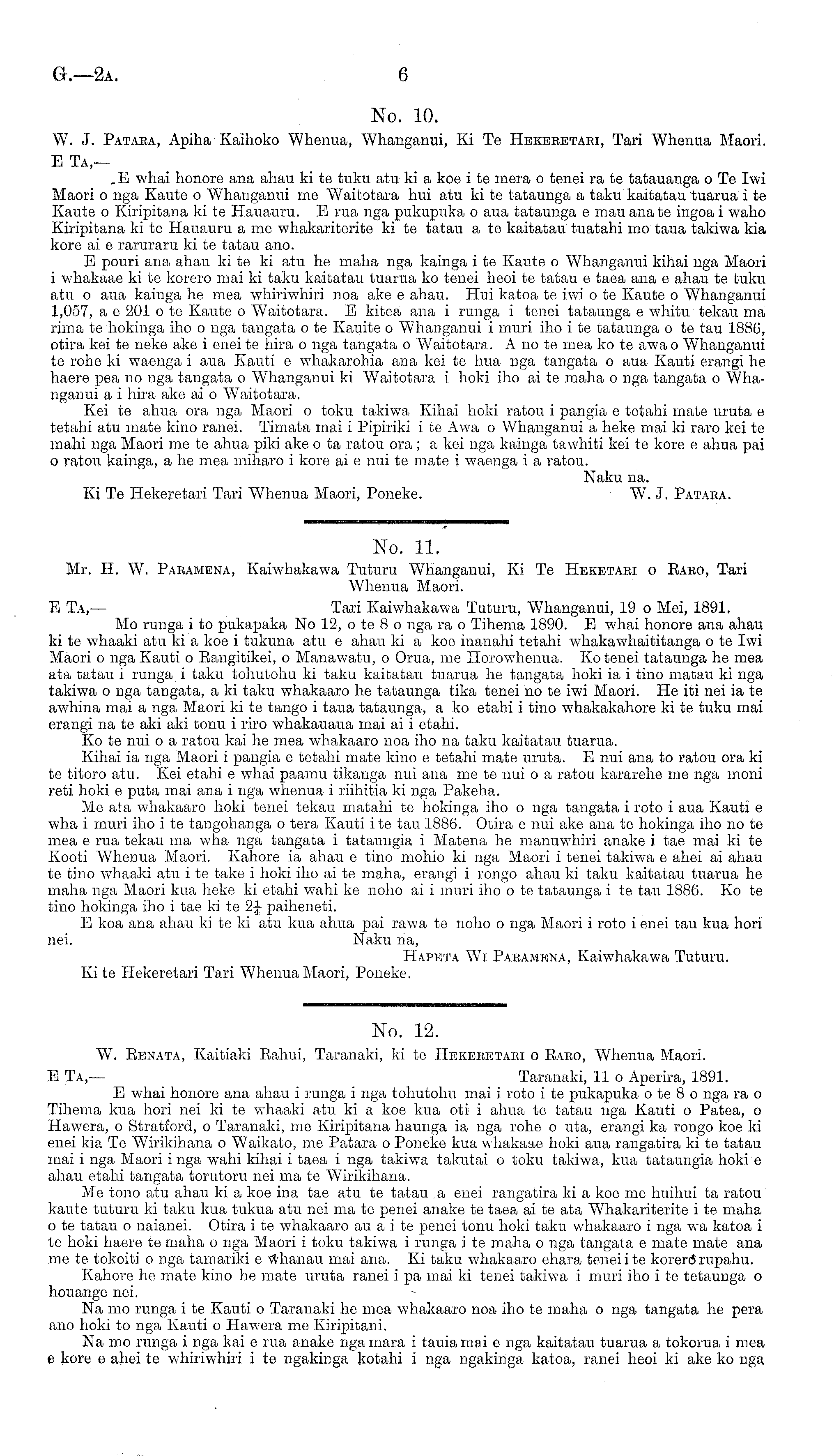 No. 12. W. Ebnata, Kaitiaki Eahui, Taranaki, kite Hekebetaei o Eaeo, "Whenna Maori. E Ta,— Taranaki, 11 o Aperira, 1891. E whai honore ana ahau i runga i nga tohutolm mai i roto i te pukapuka o te 8 o nga ra o Tihema kua hori nei kite whaaki atu ki a koe kua oti i ahua te tatau nga Kauti o Patea, o Hawera, o Stratford, o Taranaki, me Kiripitana haunga ia nga rohe o tita, erangi ka rongo koe ki enei kia Te Wirikihana o Waikato, me Patara o Poneke kua whakaae hoki aua rangatira kite tatau mai i nga Maori i nga wahi kihai i taea i nga takiwa takutai o toku takiwa, kua tataungia hoki c ahau etahi tangata torutoru nei ma te Wirikihana. Me tono atu ahau ki a koe ma tae atu te tatau a enei rangatira ki a koe me huihui ta ratou kante tuturu ki taku kua tukua atu nei ma te penei anake te taea ai te ata Whakariterite i te maha ote tatau o naianei. Otira ite whakaaro au ai te penei tonu hoki taku whakaaro i nga wa katoa i te hoki haere te maha o nga Maori i toku takiwa i runga i te maha o nga tangata c mate mate ana me te tokoiti o nga tamariki c whanau mai ana. Xi taku whakaaro ehara teneiite korerdrupahu. Kahore he mate kino he mate uruta ranei i pa mai ki tenei takiwa i muri iho i te tetaunga o houange nei. Na mo runga i te Kauti o Taranaki he mea whakaaro noa iho te maha o nga tangata he pera ano hoki to nga Kauti o Hawera me Kiripitani. Na mo runga i nga kai c rua anake ngamara i tauiamai c nga kaitatau tuarua a tokorua i mea c kore c ahei te whiriwhiri i te ngakinga kotahi i nga ngakinga katoa, ranei heoi ki ake ko nga