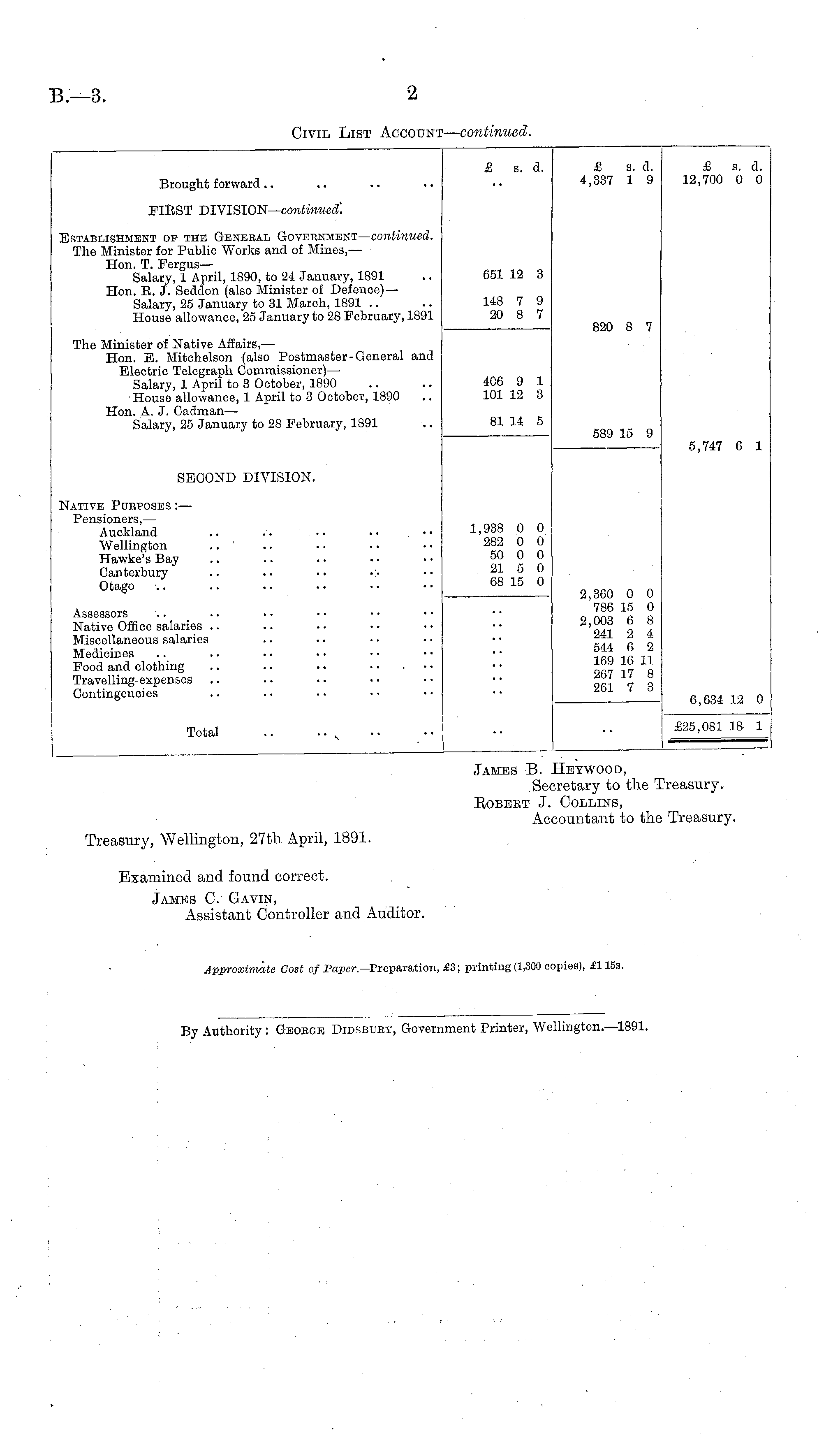 James B. Heywood, Secretary to the Treasury. Robeet J. Collins, Accountant to the Treasury. Treasury, Wellington, 27th April, 1891. Examined and found correct. James C. Gavin, Assistant Controller and Auditor.