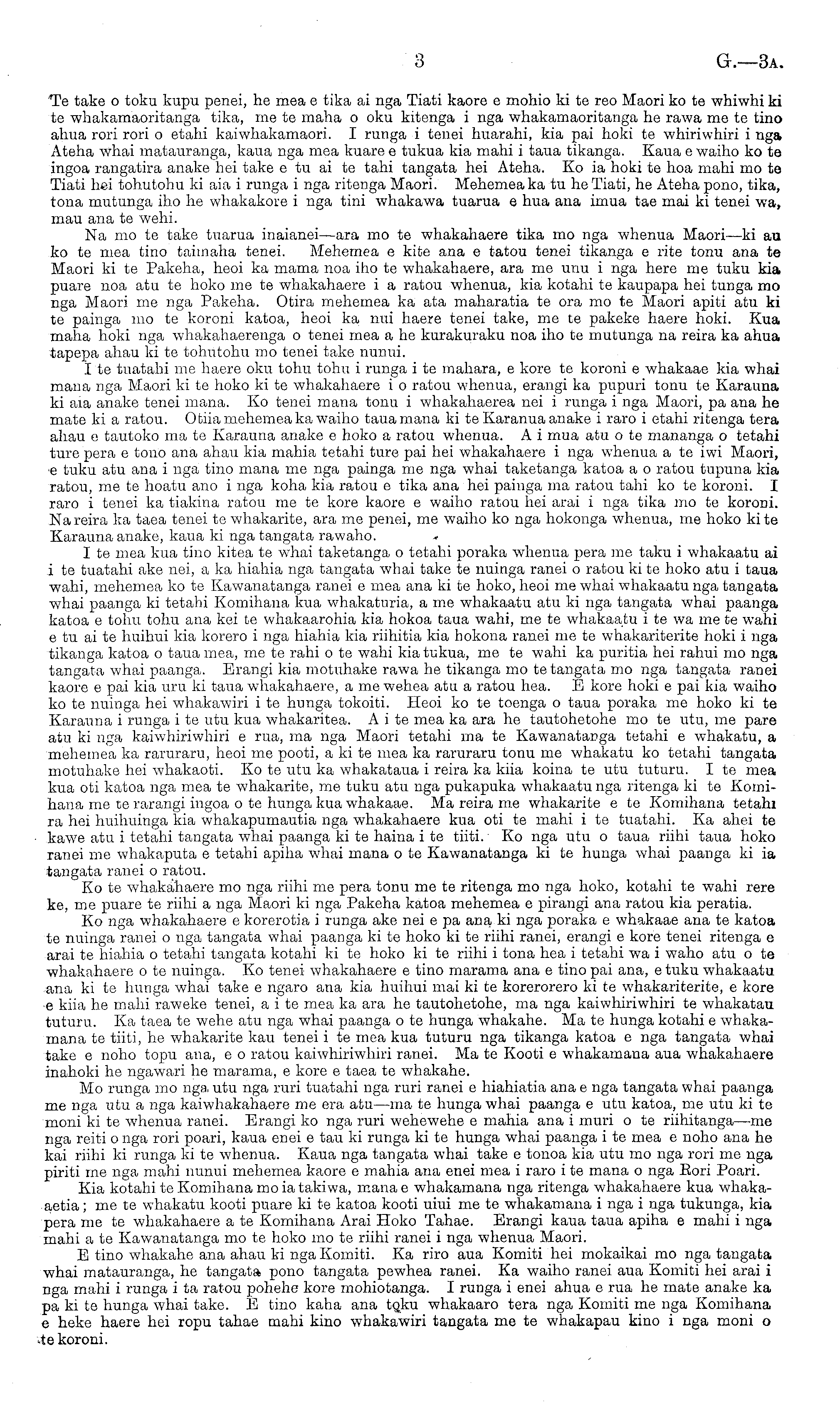 Te take o toku kupu penei, he mea c tika ai nga Tiati kaore c mohio kite reo Maori ko te whiwhi ki te whakamaoritanga tika, me te maha o oku kitenga i nga whakamaoritanga he rawa me te tino ahua rori rori o etahi kaiwhakamaori. I runga i tenei huarahi, kia pai hoki te whiriwhiri i nga Ateha whai matauranga, kaua nga mea kuare c tukua kia mahi i taua tikanga. Kaua c waiho ko te ingoa rangatira anake hei take c tv ai te tahi tangata hei Ateha. Ko ia hoki te hoa mahi mo te Tiati hei tohutohu ki aia i runga i nga ritenga Maori. Mehemea ka tv he Tiati, he Ateha pono, tika, tona mutunga iho he whakakore i nga tini whakawa tuarua c hua ana imua tae mai ki tenei wa, man ana te wehi. Na mo te take tuarua inaianei—ara mo te whakahaere tika mo nga whenua Maori—ki au ko te mea tino taiinaha tenei. Mehemea c kite ana c tatou tenei tikanga c rite tonu ana te Maori kite Pakeha, heoi ka mama noa iho tc whakahaere, ara me unu i nga here me tuku kia puare noa atu te hoko me te whakahaere i a ratou whenua, kia kotahi te kaupapa hei tunga mo nga Maori mo nga Pakeha. Otira mehemea ka ata maharatia te ora mo te Maori apiti atu ki te painga mo te koroni katoa, heoi ka nui haere tenei take, me te pakeke haere hoki. Kua maha hoki nga whakahaerenga o tenei mea a he kurakuraku noa iho te mutunga na reira ka ahua tapepa ahau kite tohutohu mo tenei take nunui. I te tuatahi me haere oku tohu tohu i runga i te inahara, c kore te koroni c whakaae kia whai mana nga Maori kite hoko kite whakahaere i o ratou whenua, erangi ka pupuri tonu te Karauna ki aia anake tenei mana. Ko tenei mana tonu i whakahaerea nei i runga i nga Maori, pa ana he mate ki a ratou. Otiia mehemea ka waiho taua mana kite Karanua anake i raro i etahi ritenga tera ahau c tautoko ma te Karauna anake c hoko a ratou whenua. A i mua atu ote mananga o tetahi ture pera c tono ana ahau kia mahia tetahi ture pai hei whakahaere i nga whenua a te iwi Maori, c tuku atu ana i nga tino mana me nga painga me nga whai taketanga katoa a o ratou tupuna kia ratou, me te hoatu ano i nga koha kia ratou c tika ana hei painga ma ratou tahi ko te koroni. I raro i tenei ka tiakina ratou me te kore kaore c waiho ratou hei arai i nga tika mo te koroni. Na reira ka taea tenei te whakarite, ara me penei, me waiho ko nga hokonga whenua, me hoko kite Karauna anake, kaua ki nga tangata rawaho. I te mea kua tino kitea te whai taketanga o tetahi poraka whenua pera me taku i whakaatu ai i te tuatahi ake nei, a ka hiahia nga tangata whai take te nuinga ranei o ratou kite hoko atu i taua wahi, mehemea ko te Kawanatanga ranei c mea ana kite hoko, heoi me whai whakaatu nga tangata whai paanga ki tetahi Komihana kua whakaturia, a me whakaatu atu ki nga tangata whai paanga katoa c tohu tohu ana kei te whakaarohia kia hokoa taua wahi, me te whakaatu i te wa me te wahi c tv ai te huihui kia korero i nga hiahia kia riihitia kia hokona ranei me te wtiakariterite hoki i nga tikanga katoa o taua rnea, me te rahi o te wahi kia tukua, me te wahi ka puritia hei rahui mo nga tangata whai paanga. Erangi kia motuhake rawa he tikanga mo te tangata mo nga tangata ranei kaore c pai kia uru ki taua whakahaere, ame wehea atu a ratou hea. E kore hoki c pai kia waiho ko te nuinga hei whakawiri ite hunga tokoiti. Heoi ko te toenga o taua poraka me hoko kite Karauna i runga ite utu kua whakaritea. Ai te mea ka ara he tautohetohe mo te utu, me pare atu ki nga kaiwhiriwhiri c rua, ma nga Maori tetahi ma te Kawanatarga tetahi c whakatu, a mehemea ka raruraru, heoi me pooti, a kite mea ka raruraru tonu me whakatu ko tetahi tangata motuhake hei whakaoti. Ko te utu ka whakataua i reira ka kiia koina te utu tuturu. I te mea kua oti katoa nga mea te whakarite, me tuku atu nga pukapuka whakaatu nga ritenga kite Komihana me te rarangi ingoa ote hunga kua whakaae. Ma reira me whakarite c te Komihana tetahi ra hei huihuinga kia whakapumautia nga whakahaere kua oti te mahi i te tuatahi. Ka ahei te kawe atu i tetahi tangata whai paanga kite haina ite tiiti. Ko nga utu o taua riihi taua hoko ranei me whakaputa c tetahi apiha whai mana o te Kawanatanga kite hunga whai paanga ki ia tangata ranei o ratou. Ko te whakahaere mo nga riihi me pera tonu me te ritenga mo nga hoko, kotahi te wahi rere ke, me puare te riihi a nga Maori ki nga Pakeha katoa mehemea c pirangi ana ratou kia peratia. Ko nga whakahaere c korerotia i runga ake nei c pa ana ki nga poraka c whakaae ana te katoa te nuinga ranei o nga tangata whai paanga kite hoko kite riihi ranei, erangi c kore tenei ritenga c arai te hiahia o tetahi tangata kotahi kite hoko kite riihi i tona hea i tetahi wa i waho atu o te whakahaere ote nuinga. Ko tenei whakahaere c tino marama ana c tino pai ana, etuku whakaatu ana kite hunga whai take c ngaro ana kia huihui mai kite korerorero kite whakariterite, c kore c kiia he mahi raweke tenei, a i te mea ka ara he tautohetohe, ma nga kaiwhiriwhiri te whakatau tuturu. Ka taea te wehe atu nga whai paanga ote hunga whakahe. Ma te hunga kotahi c whakamana te tiiti, he whakarite kau tenei i te mea kua tuturu nga tikanga katoa c nga tangata whai take c noho topu ana, c o ratou kaiwhiriwhiri ranei. Ma te Kooti c whakamana aua whakahaere inahoki he ngawari he marama, c kore c taea te whakahe. Mo runga mo nga utu nga ruri tuatahi nga ruri ranei c hiahiatia ana c nga tangata whai paanga me nga utu a nga kaiwhakahaere me era atu —ma te hunga whai paanga c utu katoa, me utu kite moni kite whenua ranei. Erangi ko nga ruri wehewehe c mahia ana i muri o te riihitanga—me nga reiti o nga rori poari, kaua enei c tau ki runga kite hunga whai paanga i te mea c noho ana he kai riihi ki runga kite whenua. Kaua nga tangata whai take c tonoa kia utu mo nga rori me nga piriti me nga mahi nunui mehemea kaore c mahia ana enei mea i raro i te mana o nga Rori Poari. Kia kotahi te Komihana mo iatakiwa, manae whakamana nga ritenga whakahaere kua whakaaetia; me te whakatu kooti puare kite katoa kooti uiui me te whakamana i nga i nga tukunga, kia pera me te whaka