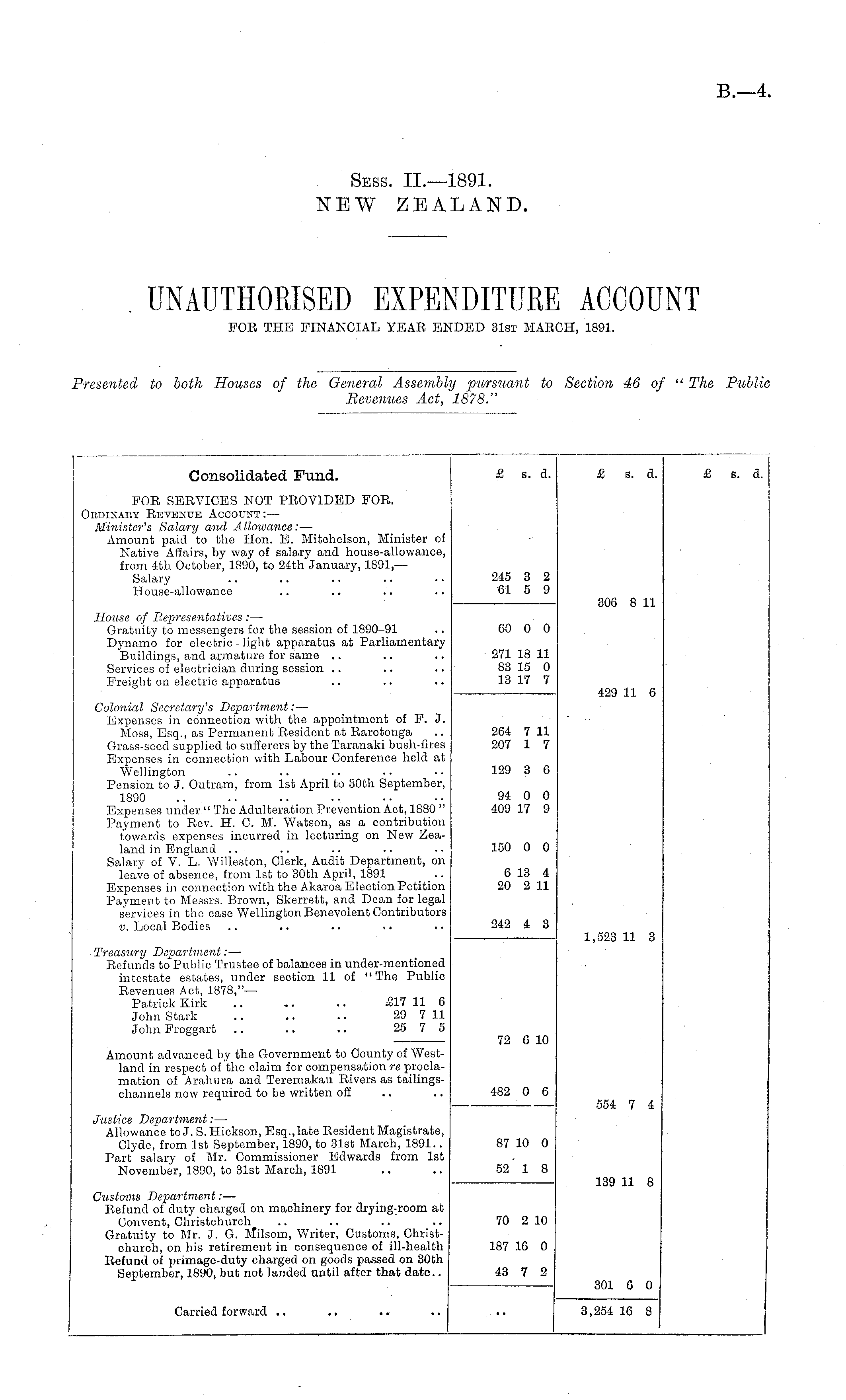Consolidated Fund. FOR SERVICES NOT PROVIDED FOR. Ordinary Revenue Account :— Minister's Salary and Allowance: — Amount paid to the Hon. E. Mitchelson, Minister of Native Affairs, by way of salary and house-allowance, from 4th October, 1890, to 24th January, 1891 — Salary House-allowance £ s. d. £ s. d. £ s. d. 245 3 2 61 5 9 House of Representatives : — Gratuity to messengers for the session of 1890-91 Dynamo for electric - light apparatus at Parliamentary Buildings, and armature for same Services of electrician during session Freight on electric apparatus 306 8 11 60 0 0 271 18 11 83 15 0 13 17 7 429 11 6 Colonial Secretary's Department: — Expenses in connection with the appointment of F. J. Moss, Esq., as Permanent Resident at Rarotonga Grass-seed supplied to sufferers by the Taranaki bush-fires Expenses in connection with Labour Conference held at Wellington Pension to J. Outram, from 1st April to 30th September, 1890 Expenses under " The Adulteration Prevention Act, 1880 " Payment to Rev. H. C. M. Watson, as a contribution towards expenses incurred in lecturing on New Zealand in England .. Salary of V. L. Willeston, Clerk, Audit Department, on leave of absence, from 1st to 30th April, 1891 Expenses in connection with the Akaroa Election Petition Payment to Messrs. Brown, Skerrett, and Dean for legal services in the case Wellington Benevolent Contributors v. Local Bodies 264 7 11 207 1 7 129 3 6 94 0 0 409 17 9 150 0 0 6 13 4 20 2 11 242 4 3 1,523 11 3 Treasury Department :— Refunds to Public Trustee of balances in under-mentioned intestate estates, under section 11 of "The Public Revenues Act, 1878,"— Patrick Kirk .. .. .. £17 11 6 John Stark .. .. .. 29 7 11 JohnFroggart .. .. .. 25 7 5 Amount advanced by the Government to County of Westland in respect of the claim for compensation re proclamation of Arahura and Teremakau Rivers as tailingschannels now required to be written off 72 6 10 482 0 6 Justice Department: — Allowance toJ.S.Hickson, Esq., late Resident Magistrate, Clyde, from 1st September, 1890, to 31st March, 1891.. Part salary of Mr. Commissioner Edwards from 1st November, 1890, to 31st March, 1891 554 7 4 87 10 0 139 11 8 52 1 8 Customs Department: — Refund of duty charged on machinery for drying-room at Convent, Christchurch Gratuity to Mr. J. G. Milsom, Writer, Customs, Christchurch, on his retirement in consequence of ill-health Refund of primage-duty charged on goods passed on 30th September, 1890, but not landed until after that date.. 70 2 10 187 16 0 301 6 0 43 7 2 Carried forward 3,254 16 8