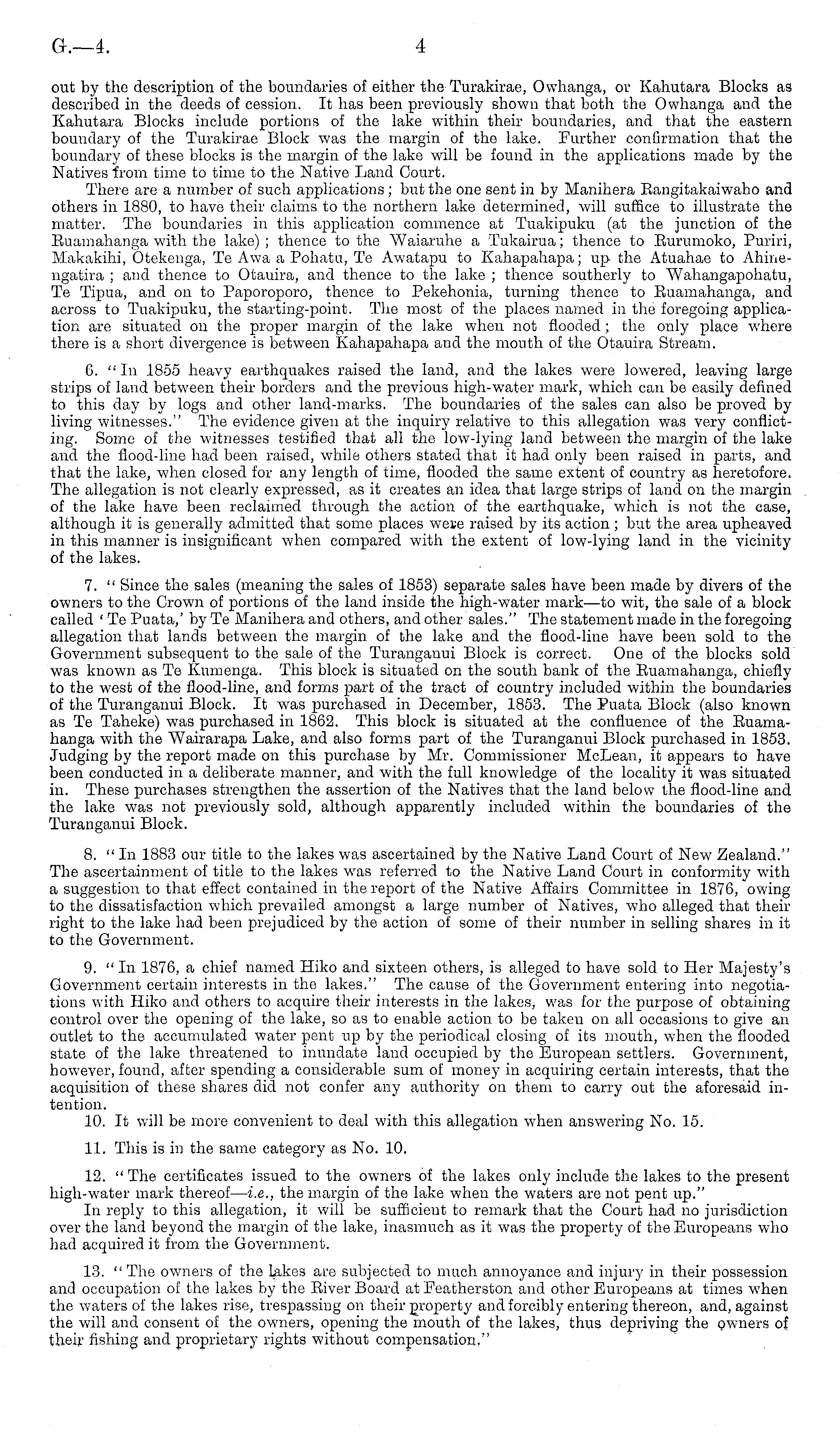 out by the description of the boundaries of either the Turakirae, Owhanga, or Kahutara Blocks as described in the deeds of cession. It has been previously shown that both the Owhanga and the Kahutara Blocks include portions of the lake within their boundaries, and that the eastern boundary of the Turakirae Block was the margin of the lake. Further confirmation that the boundary of these blocks is the margin of the lake will be found in the applications made by the Natives from time to time to the Native Land Court. There are a number of such applications; but the one sent in by Manihera Eangitakaiwaho and others in 1880, to have their claims to the northern lake determined, will suffice to illustrate the matter. The boundaries in this application commence at Tuakipuku (at the junction of the Euamahanga with the lake) ; thence to the Waiaruho a Tukairua; thence to Eurumoko, Puriri, Makakihi, Otekenga, Te Awa a Pohatu, Te Awatapu to Kahapahapa; up the Atuahae to Ahinengatira ; and thence to Otauira, and thence to the lake ; thence southerly to Wahangapohatu, Te Tipua, and on to Paporoporo, thence to Pekehonia, turning thence to Euamahanga, and across to Tuakipuku, the starting-point. The most of the places named in the foregoing application are situated on the proper margin of the lake when not flooded ; the only place where there is a short divergence is between Kahapahapa and the mouth of the Otauira Stream. 6. "In 1855 heavy earthquakes raised the land, and the lakes were lowered, leaving large strips of land between their borders and the previous high-water mark, which can be easily defined to this day by logs and other land-marks. The boundaries of the sales can also be proved by living witnesses." The evidence given at the inquiry relative to this allegation was very conflicting. Some of the witnesses testified that all the low-lying land between the margin of the lake and the flood-line had been raised, while others stated that it had only been raised in parts, and that the lake, when closed for any length of time, flooded the same extent of country as heretofore. The allegation is not clearly expressed, as it creates an idea that large strips of land on the margin of the lake have been reclaimed through the action of the earthquake, which is not the case, although it is generally admitted that some places were raised by its action; but the area upheaved in this manner is insignificant when compared with the extent of low-lying land in the vicinity of the lakes. 7. " Since the sales (meaning the sales of 1853) separate sales have been made by divers of the owners to the Crown of portions of the land inside the high-water mark—to wit, the sale of a block called 'Te Puata,' by Te Manihera and others, and other sales." The statement made in the foregoing allegation that lands between the margin of the lake and the flood-line have been sold to the Government subsequent to the sale of the Turanganui Block is correct. One of the blocks sold was known as Te Kumenga. This block is situated on the south bank of the Euamahanga, chiefly to the west of the flood-line, and forms part of the tract of country included within the boundaries of the Turanganui Block. It was purchased in December, 1853. The Puata Block (also known as Te Taheke) was purchased in 1862. This block is situated at the confluence of the Euamahanga with the Wairarapa Lake, and also forms part of the Turanganui Block purchased in 1853. Judging by the report made on this purchase by Mr. Commissioner McLean, it appears to have been conducted in a deliberate manner, and with the full knowledge of the locality it was situated in. These purchases strengthen the assertion of the Natives that the land below the flood-line and the lake was not previously sold, although apparently included within the boundaries of the Turanganui Block. 8. "In 1883 our title to the lakes was ascertained by the Native Land Court of New Zealand." The ascertainment of title to the lakes was referred to the Native Land Court in conformity with a suggestion to that effect contained in the report of the Native Affairs Committee in 1876, owing to the dissatisfaction which prevailed amongst a large number of Natives, who alleged that their right to the lake had been prejudiced by the action of some of their number in selling shares in it to the Government. 9. " In 1876, a chief named Hiko and sixteen others, is alleged to have sold to Her Majesty's Government certain interests in the lakes." The cause of the Government entering into negotiations with Hiko and others to acquire their interests in the lakes, was for the purpose of obtaining control over the opening of the lake, so as to enable action to be taken on all occasions to give an outlet to the accumulated water pent up by the periodical closing of its mouth, when the flooded state of the lake threatened to inundate laud occupied by the European settlers. Government, however, found, after spending a considerable sum of money in acquiring certain interests, that the acquisition of these shares did not confer any authority on them to carry out the aforesaid intention. 10. It will be more convenient to deal with this allegation when answering No. 15. 11. This is in the same category as No. 10. 12. " The certificates issued to the owners of the lakes only include the lakes to the present high-water mark thereof — i.e., the margin of the lake when the waters are not pent up." In reply to this allegation, it will be sufficient to remark that the Court had no jurisdiction over the land beyond the margin of the lake, inasmuch as it was the property of the Europeans who had acquired it from the Government. 13. "The owners of the Lakes are subjected to much annoyance and injury in their possession and occupation of the lakes by the Eiver Board at Eeatherston and other Europeans at times when the waters of the lakes rise, trespassing on their property and forcibly entering thereon, and, against the will and co