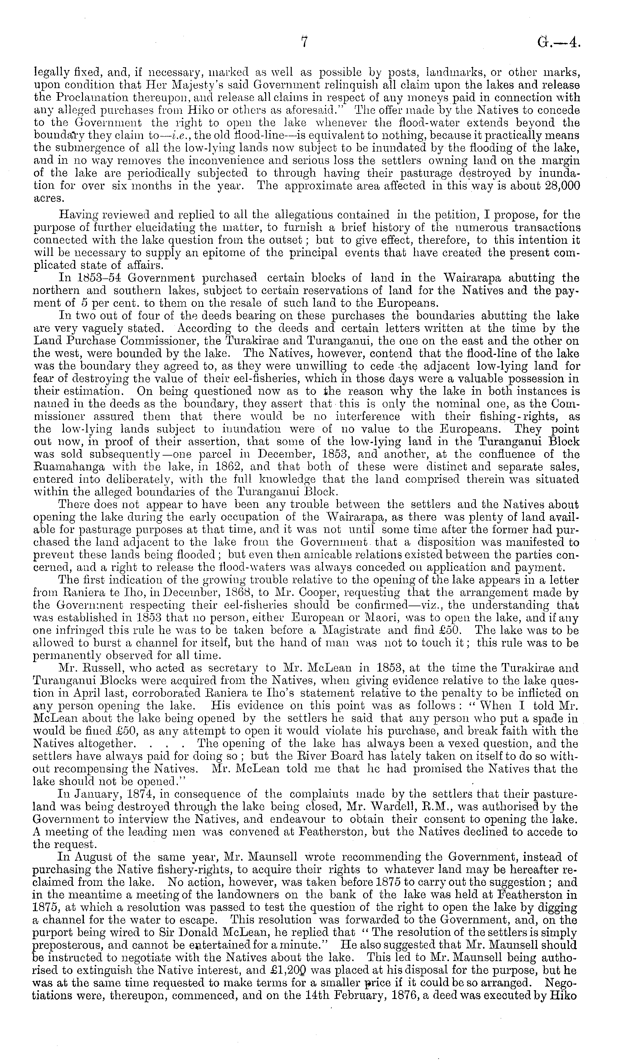 legally fixed, and, if necessary, marked as well as possible by posts, landmarks, or other marks, upon condition that Her Majesty's said Government relinquish all claim upon the lakes and release the Proclamation thereupon, and release all claims in respect of auy moneys paid in connection with any alleged purchases from Hiko or others as aforesaid." The offer made by the Natives to concede to the Government the right to open the lake whenever the flood-water extends beyond the boundaTy they claim to — i.e., the old flood-line —is equivalent to nothing, because it practically means the submergence of all the low-lying lands now subject to be inundated by the flooding of the lake, and in no way removes the inconvenience and serious loss the settlers owning land on the margin of the lake are periodically subjected to through having their pasturage destroyed by inundation for over six months in the year. The approximate area affected in this way is about 28,000 acres. Having reviewed and replied to all the allegations contained in the petition, I propose, for the purpose of further elucidating the matter, to furnish a brief history of the numerous transactions connected with the lake question from the outset; but to give effect, therefore, to this intention it will be necessary to supply an epitome of the principal events that have created the present complicated state of affairs. In 1853-54 Government purchased certain blocks of land in the Wairarapa abutting the northern and southern lakes, subject to certain reservations of land for the Natives and the payment of 5 per cent, to them on the resale of such land to the Europeans. In two out of four of the deeds bearing on these purchases the boundaries abutting the lake are very vaguely stated. According to the deeds and certain letters written at the time by the Land Purchase Commissioner, the Turakirae and Turanganui, the one on the east and the other on the west, were bounded by the lake. The Natives, however, contend that the flood-line of the lake was the boundary they agreed to, as they were unwilling to cede -the adjacent low-lying land for fear of destroying the value of their eel-fisheries, which in those days were a valuable possession in their estimation. On being questioned now as to the reason why the lake in both instances is named in the deeds as the boundary, they assert that this is only the nominal one, as the Commissioner assured them that there would be no interference with their fishing-rights, as the low-lying lands subject to inundation were of no value to the Europeans. They point out now, in proof of their assertion, that some of the low-lying land in the Turanganui Block was sold subsequently—one parcel in December, 1853, and another, at the confluence of the Euainahanga with the lake, in 1862, and that both of these were distinct and separate sales, entered into deliberately, with the full knowledge that the land comprised therein was situated within the alleged boundaries of the Turanganui Block. There does not appear to have been any trouble between the settlers and the Natives about opening the lake during the early occupation of the Wairarapa, as there was plenty of land available for pasturage purposes at that time, and it was not until some time after the former had purchased the land adjacent to the lake from the Government that a disposition was manifested to preveut these lands being flooded ; but even then amicable relations existed between the parties concerned, and a right to release the flood-waters was always conceded on application and payment. The first indication of the growing trouble relative to the opening of the lake appears in a letter from Baniera te Iho, in December, 1868, to Mr. Cooper, requesting that the arrangement made by the Government respecting their eel-fisheries should be confirmed—viz., the understanding that was established in 1853 that no person, either European or Maori, was to open the lake, and if any one infringed this rule he was to be taken before a Magistrate and find £50. The lake was to be allowed to burst a channel for itself, but the hand of man was not to touch it; this rule was to be permanently observed for all time. Mr. Russell, who acted as secretary to Mr. McLean in 1853, at the time the Tura.kirae and Turanganui Blocks were acquired from the Natives, when giving evidence relative to the lake question in April last, corroborated Raniera te Iho's statement relative to the penalty to be inflicted on any person opening the lake. His evidence on this point was as follows : " When I told Mr. McLean about the lake being opened by the settlers he said that any person who put a spade in would be fined £50, as any attempt to open it would violate his purchase, and break faith with the Natives altogether. . . . The opening of the lake has always been a vexed question, and the settlers have always paid for doing so ; but the Eiver Board has lately taken on itself to do so without recompensing the Natives. Mr. McLean told me that he had promised the Natives that the lake should not be opened." In January, 1874, in consequence of the complaints made by the settlers that their pastureland was being destroyed through the lake being closed, Mr. Wardell, R.M., was authorised by the Government to interview the Natives, and endeavour to obtain their consent to opening the lake. A meeting of the leading men was convened at Featherston, but the Natives declined to accede to the request. In August of the same year, Mr. Maunsell wrote recommending the Government, instead of purchasing the Native fishery-rights, to acquire their rights to whatever land may be hereafter reclaimed from the lake. No action, however, was taken before 1875 to carry out the suggestion ; and in the meantime a meeting of the landowners on the bank of the lake was held at Peatherston in 1875, at which a resolution was passed to test the question of the right to open the lake by digging a channel for 