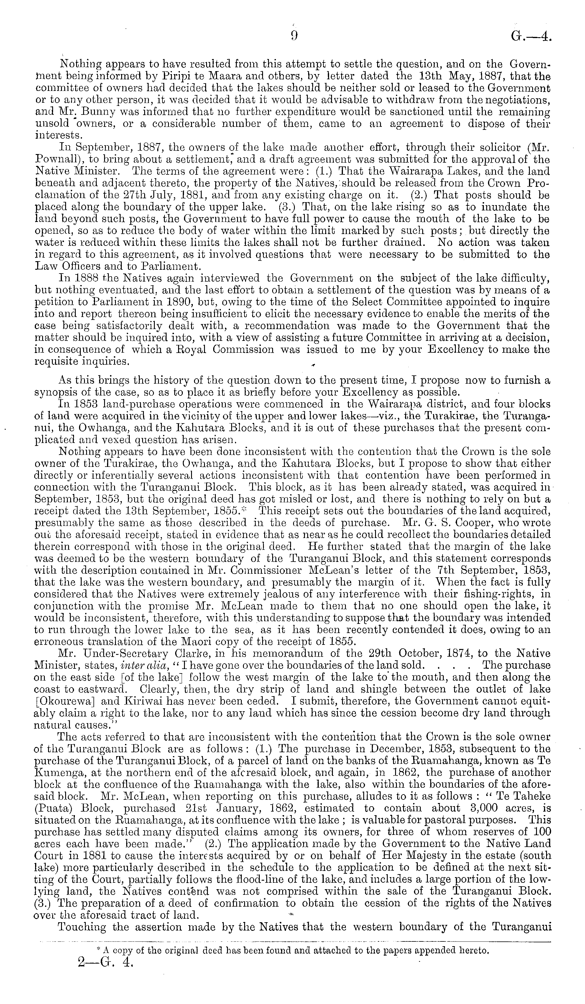 Nothing appears to have resulted from this attempt to settle the question, and on the Government being informed by Piripi te Maara and others, by letter dated the 13th May, 1887, that the committee of owners had decided that the lakes should be neither sold or leased to the Government or to any other person, it was decided that it would be advisable to withdraw from the negotiations, and Mr. Bunny was informed that no further expenditure would be sanctioned until the remaining unsold 'owners, or a considerable number of them, came to an agreement to dispose of their interests. In September, 1887, the owners of the lake made another effort, through their solicitor (Mr. Pownall), to bring about a settlement, and a draft agreement was submitted for the approval of the Native Minister. The terms of the agreement were : (1.) That the Wairarapa Lakes, and the land beneath and adjacent thereto, the property of the Natives, should be released from the Crown Proclamation of the 27th July, 1881, and from any existing charge on it. (2.) That posts should be placed along the boundary of the upper lake. (3.) That, on the lake rising so as to inundate the land beyond such posts, the Government to have full power to cause the mouth of the lake to be opened, so as to reduce the body of water within the limit marked by such posts; but directly the water is reduced within these limits the lakes shall not be further drained. No action was taken in regard to this agreement, as it involved questions that were necessary to be submitted to the Law Officers and to Parliament. In 1888 the Natives again interviewed the Government on the subject of the lake difficulty, but nothing eventuated, and the last effort to obtain a settlement of the question was by means of a petition to Parliament in 1890, but, owing to the time of the Select Committee appointed to inquire into and report thereon being insufficient to elicit the necessary evidence to enable the merits of the case being satisfactorily dealt with, a recommendation was made to the Government that the matter should be inquired into, with a view of assisting a future Committee in arriving at a decision, in consequence of which a Eoyal Commission was issued to me by your Excellency to make the requisite inquiries. As this brings the history of the question down to the present time, I propose now to furnish a synopsis of the case, so as to place it as briefly before your Excellency as possible. In 1853 land-purchase operations were commenced in the Wairarapa district, and four blocks of land were acquired in the vicinity of the upper and lower lakes—viz., the Turakirae, the Turanganui, the Owhanga, and the Kahutara Blocks, and it is out of these purchases that the present complicated and vexed question has arisen. Nothing appears to have been done inconsistent with the contention that the Crown is the sole owner of the Turakirae, the Owhanga, and the Kahutara Blocks, but I propose to show that either directly or inferentially several actions inconsistent with that contention have been performed in connection with the Turanganui Block. This block, as it has been already stated, was acquired in September, 1853, but the original deed has got misled or lost, and there is nothing to rely on but a receipt dated the 13th September, 1855.* This receipt sets out the boundaries of the land acquired, presumably the same as those described in the deeds of purchase. Mr. G. S. Cooper, who wrote out the aforesaid receipt, stated in evidence that as near as he could recollect the boundaries detailed therein correspond with those in the original deed. He further stated that the margin of the lake was deemed to be the western boundary of the Turanganui Block, and this statement corresponds with the description contained in Mr. Commissioner McLean's letter of the 7th September, 1853, that the lake was the western boundary, and presumably the margin of it. When the fact is fully considered that the Natives were extremely jealous of any interference with their fishing-rights, in conjunction with the promise Mr. McLean made to them that no one should open the lake, it would be inconsistent, therefore, with this understanding to suppose tliat the boundary was intended to run through the lower lake to the sea, as it has been recently contended it does, owing to an erroneous translation of the Maori copy of the receipt of 1855. Mr. Under-Secretary Clarke, in his memorandum of the 29th October, 1874, to the Native Minister, states, inter alia, "I have gone over the boundaries of the land sold. . . . The purchase on the east side [of the lake] follow the west margin of the lake to'the mouth, and then along the coast to eastward. Clearly, then, the dry strip of land and shingle between the outlet of lake [Okourewa] and Kiriwai has never been ceded. I submit, therefore, the Government cannot equitably claim a right to the lake, nor to any land which has since the cession become dry land through natural causes." The acts referred to that are inconsistent with the contention that the Crown is the sole owner of the Turanganui Block are as follows : (1.) The purchase in December, 1853, subsequent to the purchase of the Turanganui Block, of a parcel of land on the banks of the Ruamahanga, known as Te Kumenga, at the northern end of the aforesaid block, and again, in 1862, the purchase of another block at the confluence of the Ruamahanga with the lake, also within the boundaries of the aforesaid block. Mr. McLean, when reporting on this purchase, alludes to it as follows :" Te Taheke (Puata) Block, purchased 21st January, 1862, estimated to contain about 3,000 acres, is situated on the Ruamahanga, at its confluence with the lake ; is valuable for pastoral purposes. This purchase has settled many disputed claims among its owners, for three of whom reserves of 100 acres each have been made." (2.) The application made by the Government to the Native Land Court in 1881 to cause the interests acqui