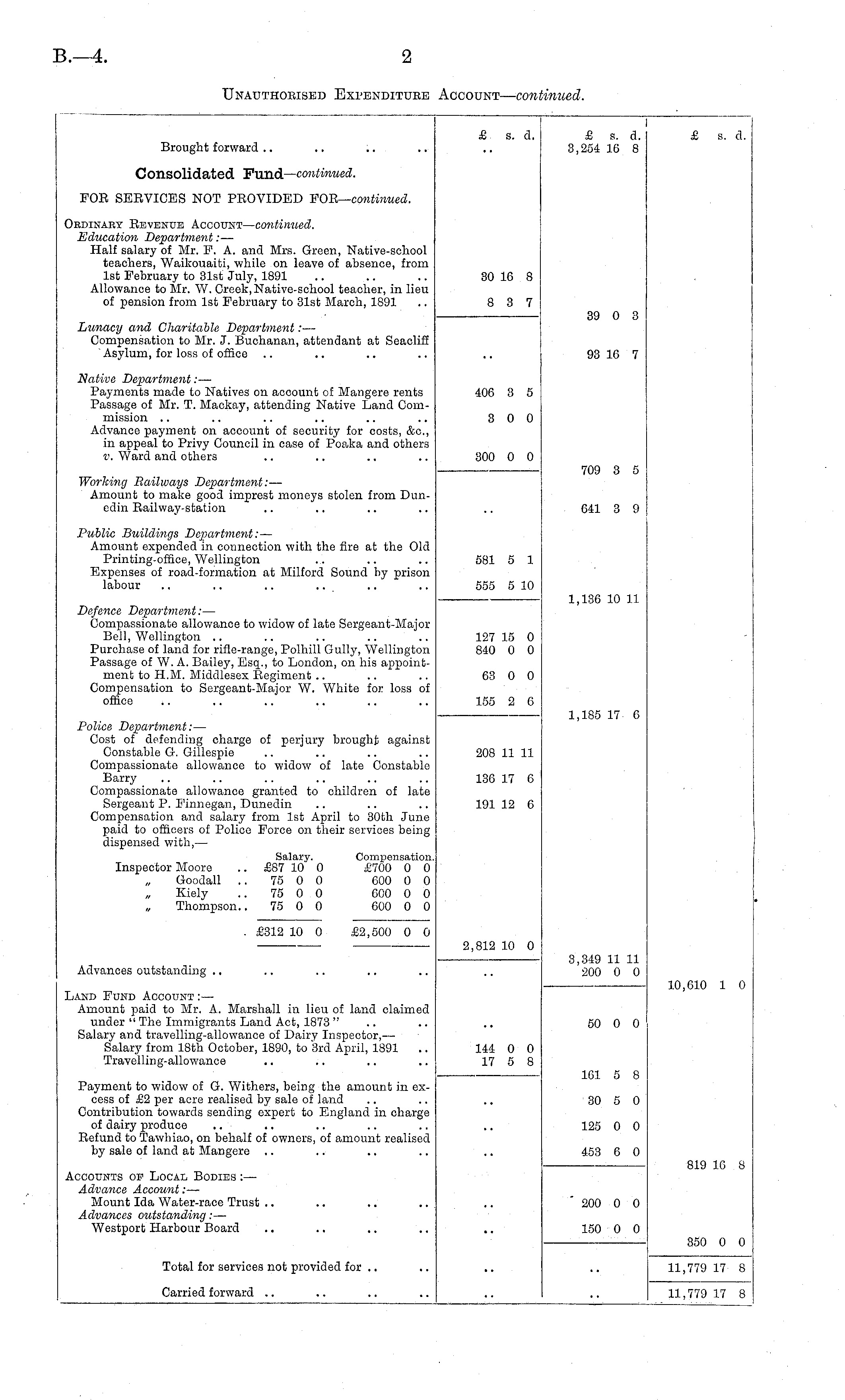 Brought forward Consolidated Fund— continued. £ s. d. £ s. d. 3,254 16 8 £ s. d. FOR SERVICES NOT PROVIDED FOR— continued. Ordinary Revenue Account— continued. Education Department: — Half salary of Mr. F. A. and Mrs. Green, Native-school teachers, Waikouaiti, while on leave of absence, from 1st February to 31st July, 1891 Allowance to Mr. W. Creek, Native-school teacher, in lieu of pension from 1st February to 31st March, 1891 30 16 8 8 3 7 Lunacy and Charitable Department: — Compensation to Mr. J. Buchanan, attendant at Seacliff Asylum, for loss of office 39 0 3 93 16 7 Native Department: — Payments made to Natives on account of Mangere rents Passage of Mr. T. Mackay, attending Native Land Commission Advance payment on account of security for costs, &c, in appeal to Privy Council in case of Poaka and others v. Ward and others 406 3 5 3 0 0 300 0 0 Working Railways Department: — Amount to make good imprest moneys stolen from Dunedin Railway-station 709 3 5 641 3 9 Public Buildings Department: — Amount expended in connection with the fire at the Old Printing-office, Wellington Expenses of road-formation at Milford Sound by prison labour .. .. .. 581 5 1 555 5 10 1,136 10 11 Defence Department: — Compassionate allowance to widow of late Sergeant-Major Bell, Wellington .. Purchase of land for rifle-range, Polhill Gully, Wellington Passage of W. A. Bailey, Esq., to London, on his appointment to H.M. Middlesex Regiment Compensation to Sergeant-Major W. White for loss of office 127 15 0 840 0 0 63 0 0 155 2 6 Police Department: — Cost of defending charge of perjury brought against Constable G. Gillespie Compassionate allowance to widow of late Constable Barry Compassionate allowance granted to children of late Sergeant P. Finnegan, Dunedin Compensation and salary from 1st April to 30th June paid to officers of Police Force on their services being dispensed with, — 1,185 17 6 208 11 11 136 17 6 191 12 6 Salary. Compensation. Inspector Moore .. £87 10 0 £700 0 0 Goodall .. 75 0 0 600 0 0 Kiely .. 75 0 0 600 0 0 Thompson.. 75 0 0 600 0 0 - £312 10 0 £2,500 0 0 Advances outstanding .. 2,812 10 0 3,349 11 11 200 0 0 10,610 1 0 jAnd Fund Account :— Amount paid to Mr. A. Marshall in lieu of land claimed under " The Immigrants Land Act, 1873 " Salary and travelling-allowance of Dairy Inspector,— Salary from 18th October, 1890, to 3rd April, 1891 Travelling-allowance 50 0 0 144 0 0 17 5 8 161 5 8 Payment to widow of G. Withers, being the amount in excess of £2 per acre realised by sale of land Contribution towards sending expert to England in charge of dairy produce Refund to Tawhiao, on behalf of owners, of amount realised by sale of land at Mangere .. 30 5 0 125 0 0 819 16 8 453 6 0 .ccounts op Local Bodies :— Advance Account: — Mount Ida Water-race Trust Advances outstanding: — Westport Harbour Board 200 0 0 350 0 0 150 0 0 Total for services not provided for .. 11,779 17 8 Carried forward 11,779 17 8