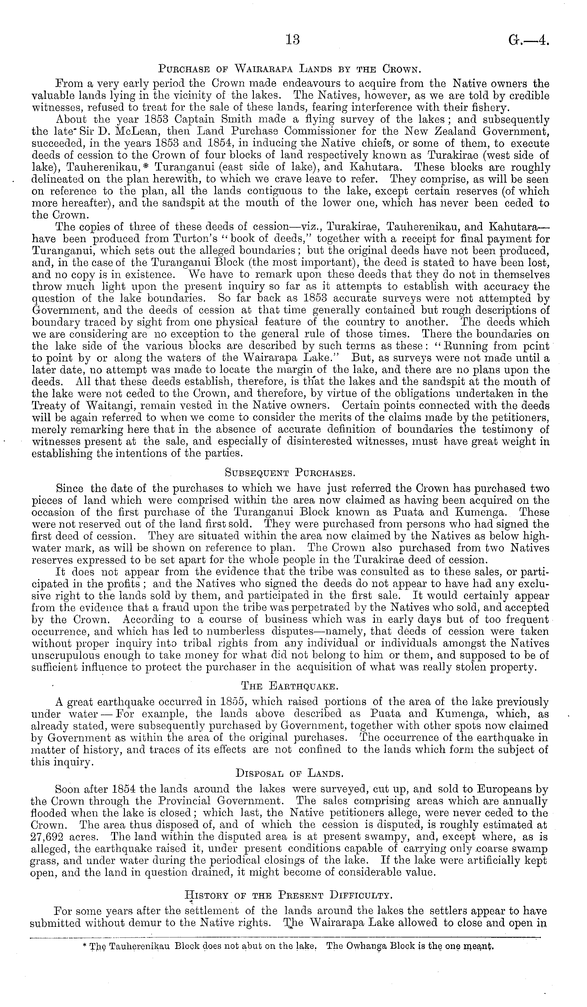 Purchase op Wairarapa Lands by the Ceown. From a very early period the Crown made endeavours to acquire from the Native owners the valuable lands lying in the vicinity of the lakes. The Natives, however, as we are told by credible witnesses, refused to treat for the sale of these lands, fearing interference with their fishery. About the year 1853 Captain Smith made a flying survey of the lakes ; and subsequently the late" Sir D. McLean, then Land Purchase Commissioner for the New Zealand Government, succeeded, in the years 1853 and 1854, in inducing the Native chiefs, or some of them, to execute deeds of cession to the Crown of four blocks of land respectively known as Turakirae (west side of lake), Tauherenikau, * Turanganui (east side of lake), and Kahutara. These blocks are roughly delineated on the plan herewith, to which we crave leave to refer. They comprise, as will be seen on reference to the plan, all the lands contiguous to the lake, except certain reserves (of which more hereafter), and the sandspit at the mouth of the lower one, which has never been ceded to the Crown. The copies of three of these deeds of cession—viz., Turakirae, Tauherenikau, and Kahutara-—• have been produced from Turton's "book of deeds," together with a receipt for final payment for Turanganui, which sets out the alleged boundaries; but the original deeds have not been produced, and, in the case of the Turanganui Block (the most important), the deed is stated to have been lost, and no copy is in existence. We have to remark upon these deeds that they do not in themselves throw much light upon the present inquiry so far as it attempts to establish with accuracy the question of the lake boundaries. So far back as 1853 accurate surveys were not attempted by Government, and the deeds of cession at that time generally contained but rough descriptions of boundary traced by sight from one physical feature of the country to another. The deeds which we are considering are no exception to the general rule of those times. There the boundaries on the lake side of the various blocks are described by such terms as these : " Running from pcint to point by or along the waters of the Wairarapa Lake." But, as surveys were not made until a later date, no attempt was made to locate the margin of the lake, and there are no plans upon the deeds. All that these deeds establish, therefore, is that the lakes and the sandspit at the mouth of the lake were not ceded to the Crown, and therefore, by virtue of the obligations undertaken in the Treaty of Waitangi, remain vested in the Native owners. Certain points connected with the deeds will be again referred to when we come to consider the merits of the claims made by the petitioners, merely remarking here that in the absence of accurate definition of boundaries the testimony of witnesses present at the sale, and especially of disinterested witnesses, must have great weight in establishing the intentions of the parties. Subsequent Purchases. Since the date of the purchases to which we have just referred the Crown has purchased two pieces of land which were comprised within the area now claimed as having been acquired on the occasion of the first purchase of the Turanganui Block known as Puata and Kumenga. These were not reserved out of the land first sold. They were purchased from persons who had signed the first deed of cession. They are situated within the area now claimed by the Natives as below highwater mark, as will be shown on reference to plan. The Crown also purchased from two Natives reserves expressed to be set apart for the whole people in the Turakirae deed of cession. It does not appear from the evidence that the tribe was consulted as to these sales, or participated in the profits ; and the Natives who signed the deeds do not appear to have had any exclusive right to the lands sold by them, and participated in the first sale. It would certainly appear from the evidence that a fraud upon the tribe was perpetrated by the Natives who sold, and accepted by the Crown. According to a course of business which was in early days but of too frequent occurrence, and which has led to numberless disputes —namely, that deeds of cession were taken without proper inquiry into tribal rights from any individual or individuals amongst the Natives unscrupulous enough to take money for what did not belong to him or them, and supposed to be of sufficient influence to protect the purchaser in the acquisition of what was really stolen property. The Earthquake. A great earthquake occurred in 1855, which raised portions of the area of the lake previously under water — For example, the lands above described as Puata and Kumenga, which, as already stated, were subsequently purchased by Government, together with other spots now claimed by Government as within the area of the original purchases. The occurrence of the earthquake in matter of history, and traces of its effects are not confined to the lands which form the subject of this inquiry. Disposal of Lands. Soon after 1854 the lands around the lakes were surveyed, cut up, and sold to Europeans by the Crown through the Provincial Government. The sales comprising areas which are annually flooded when the lake is closed; which last, the Native petitioners allege, were never ceded to the Crown. The area thus disposed of, and of which the cession is disputed, is roughly estimated at 27,692 acres. The land within the disputed area is at present swampy, and, except where, as is alleged, the earthquake raised it, under present conditions capable of carrying only coarse swamp grass, and under water during the periodical closings of the lake. If the lake were artificially kept open, and the land in question drained, it might become of considerable value. History of the Present Difficulty. For some years after the settlement of the lands around the lakes the settlers appear to have submitted without demur to the Native rights. The Wairarapa L